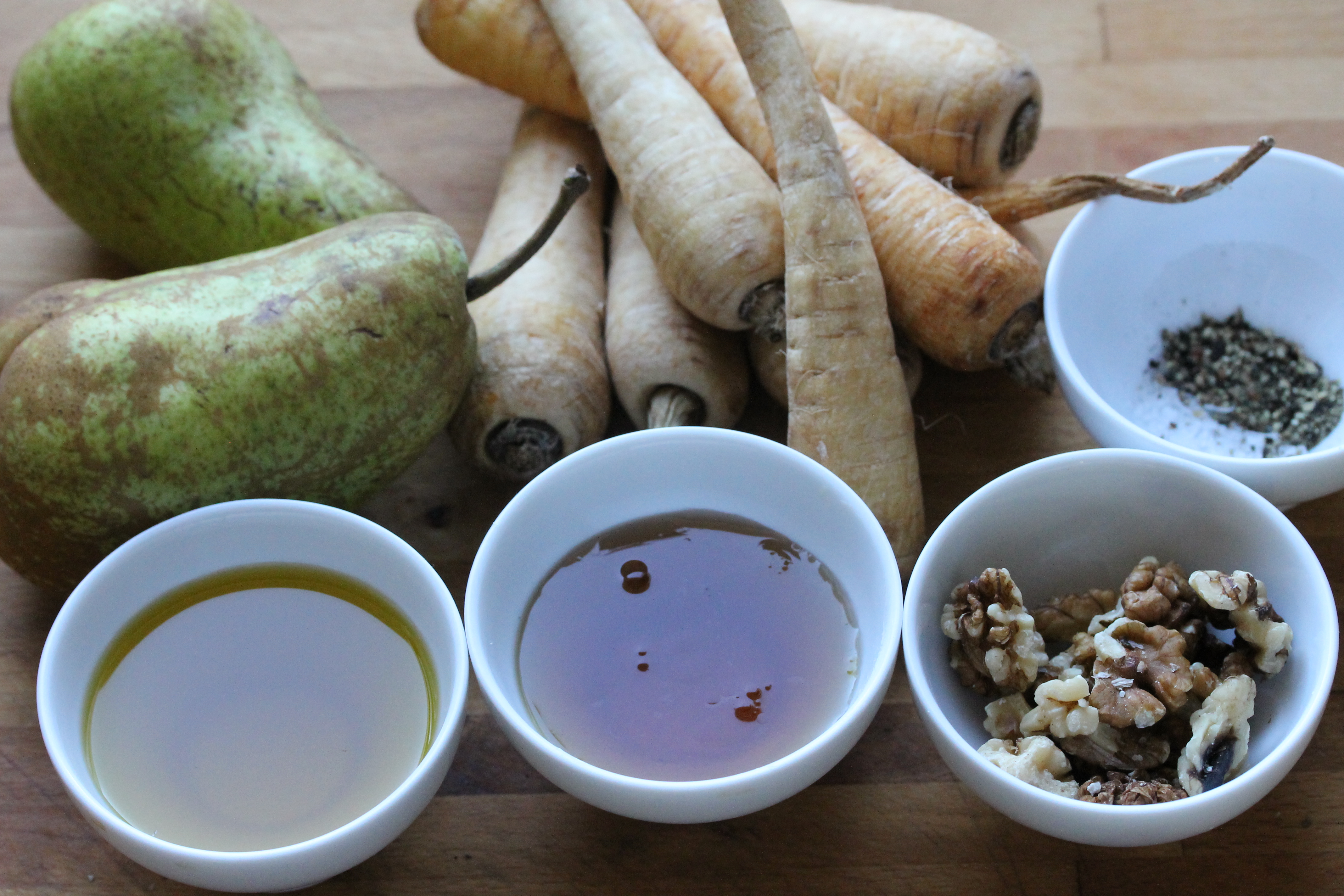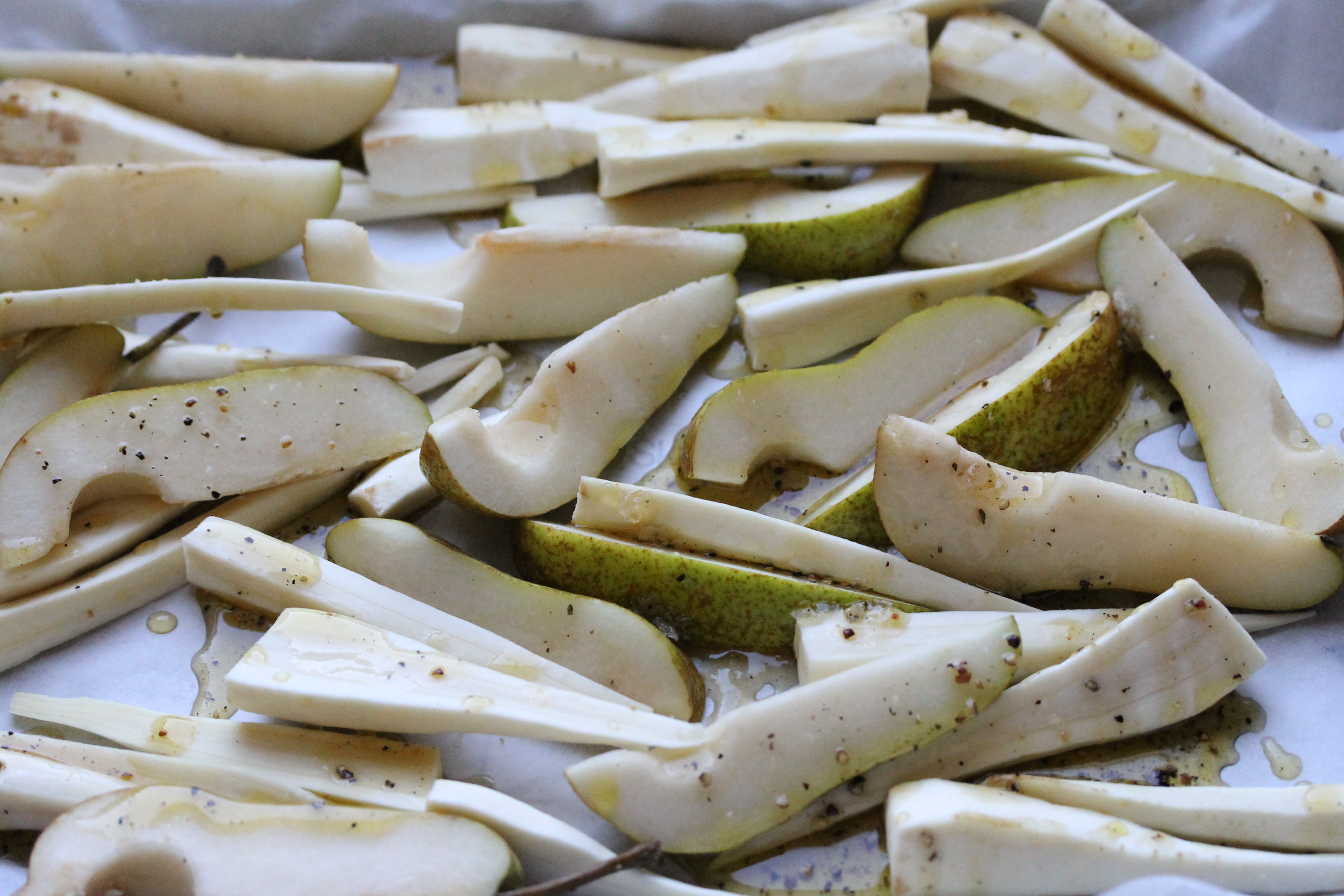 Ég var með 500 g af nípum, 2 perur, 2 1/2 msk af ólífuolíu, 2 msk af hlynsírópi, nokkra valhnetukjarna, pipar og salt. Ég byrjaði á að hita ofninn í 200°C.