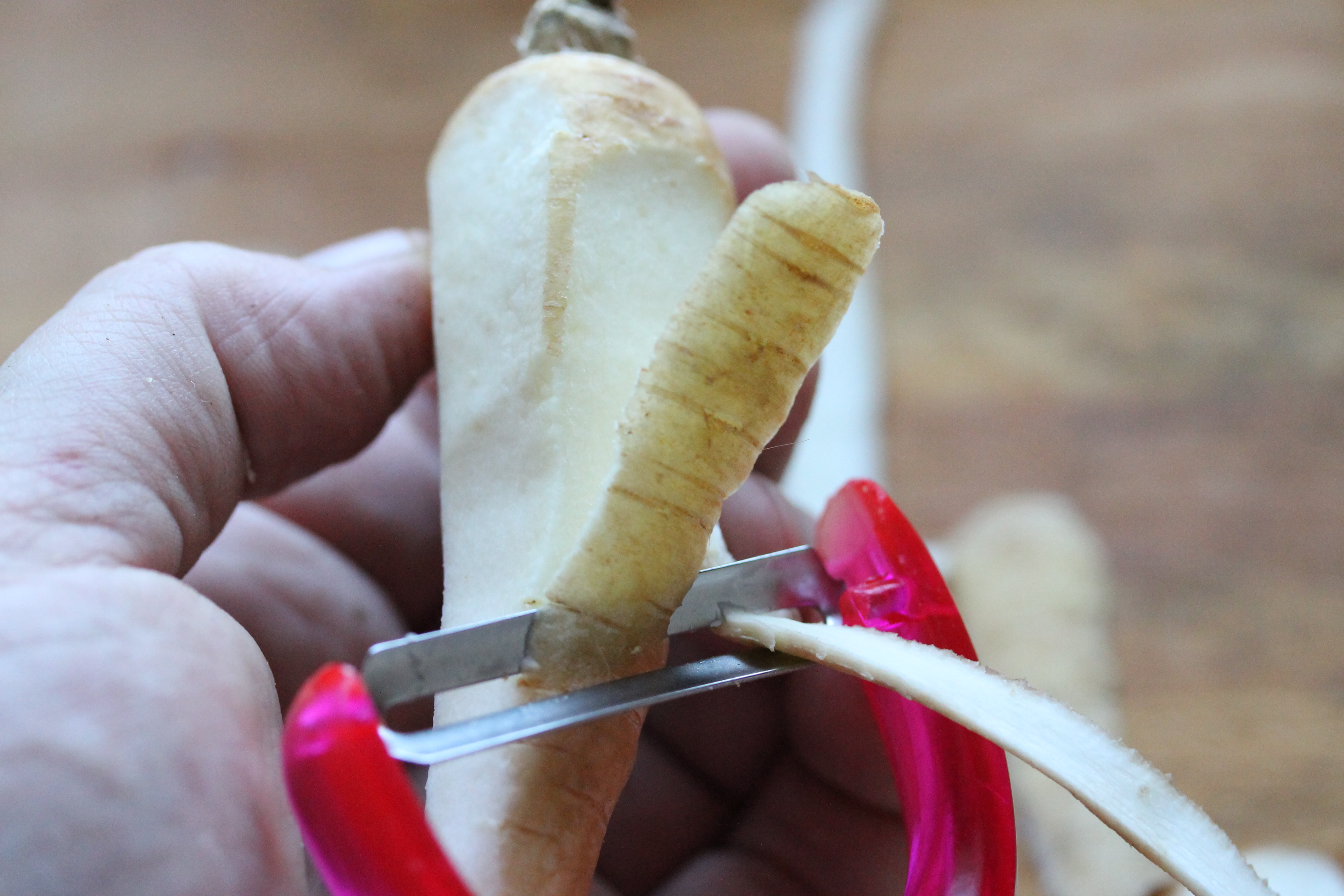 Ég byrjaði á að flysja nípurnar og notaði við það flysjunarjárn – það er langþægilegast. Ég kann einstaklega við svona Y-laga flysjunarjárn og nota þau alltaf en auðvitað má líka nota hníf.