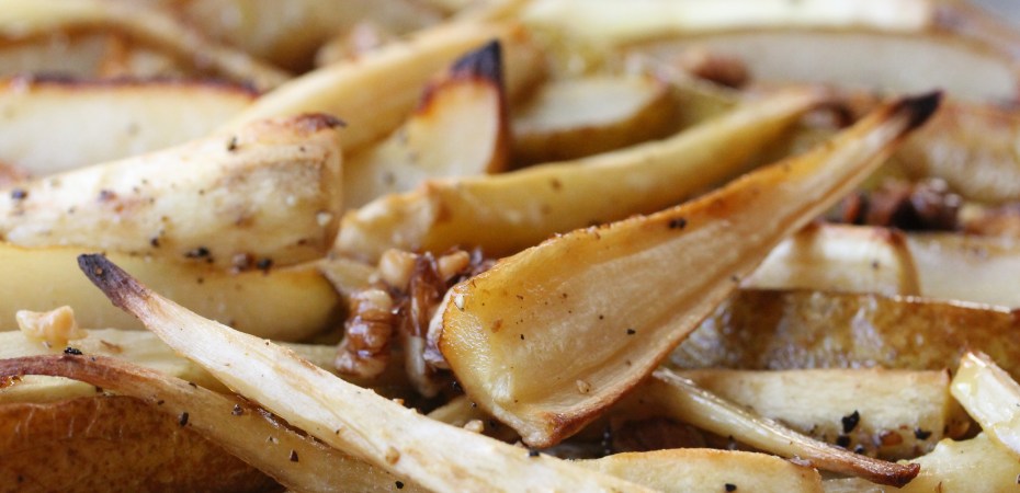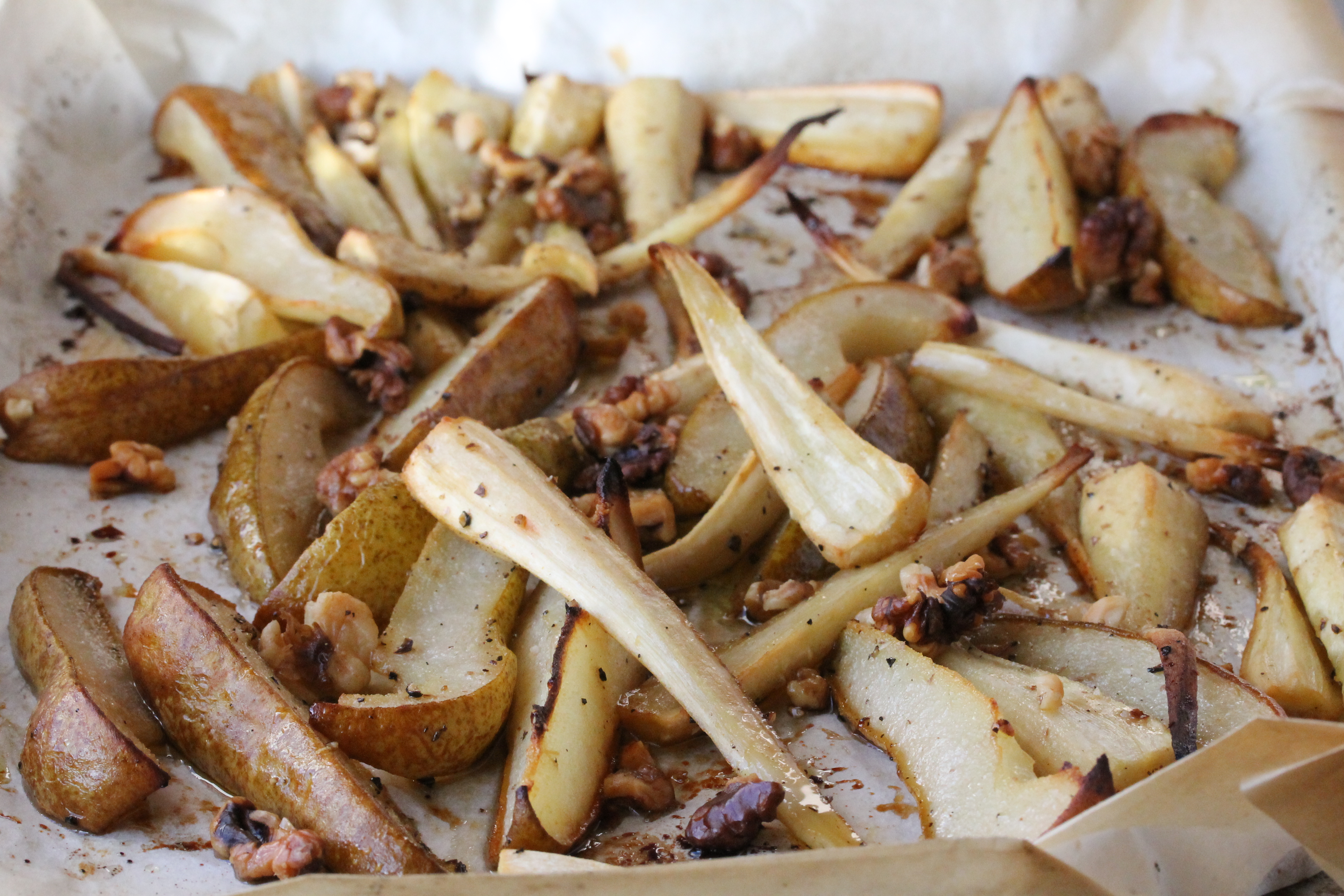 Ég blandaði perunum og nípunum saman og dreifði þeim á bökunarplötu sem ég hafði klætt með bökunarpappír. Dreypti svo olíu- og hlynsírópsblöndunni jafnt yfir, setti þetta í miðjan ofninn og bakaði í um 24 mínútur.