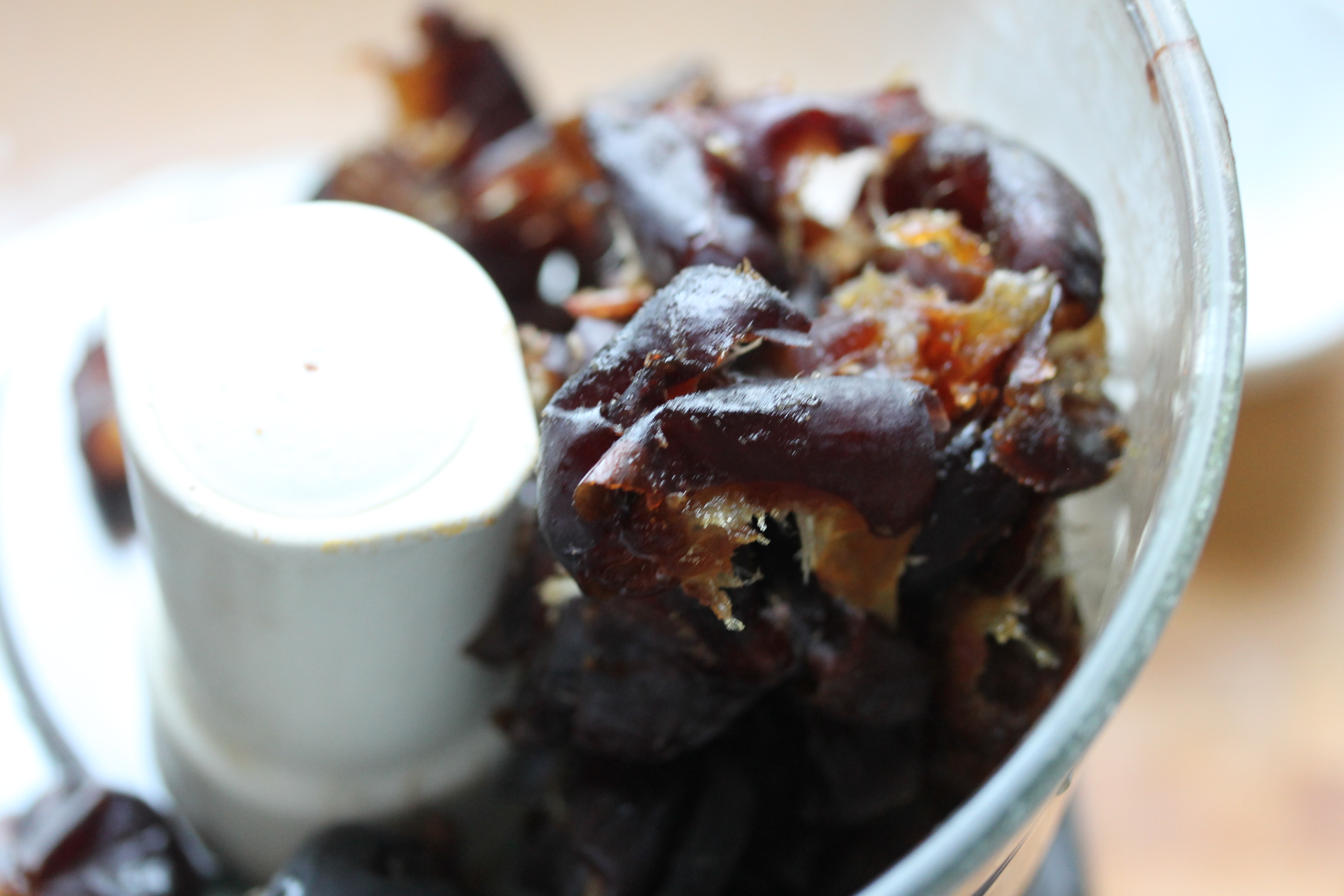 Ég byrjaði á að vigta 200 g af mjúkum döðlum. Steinhreinsaði þær svo, setti þær í matvinnsluvél og maukaði. Svo bræddi ég 100 g af kakósmjöri og hrærði saman við ásamt 4 msk af kakódufti.