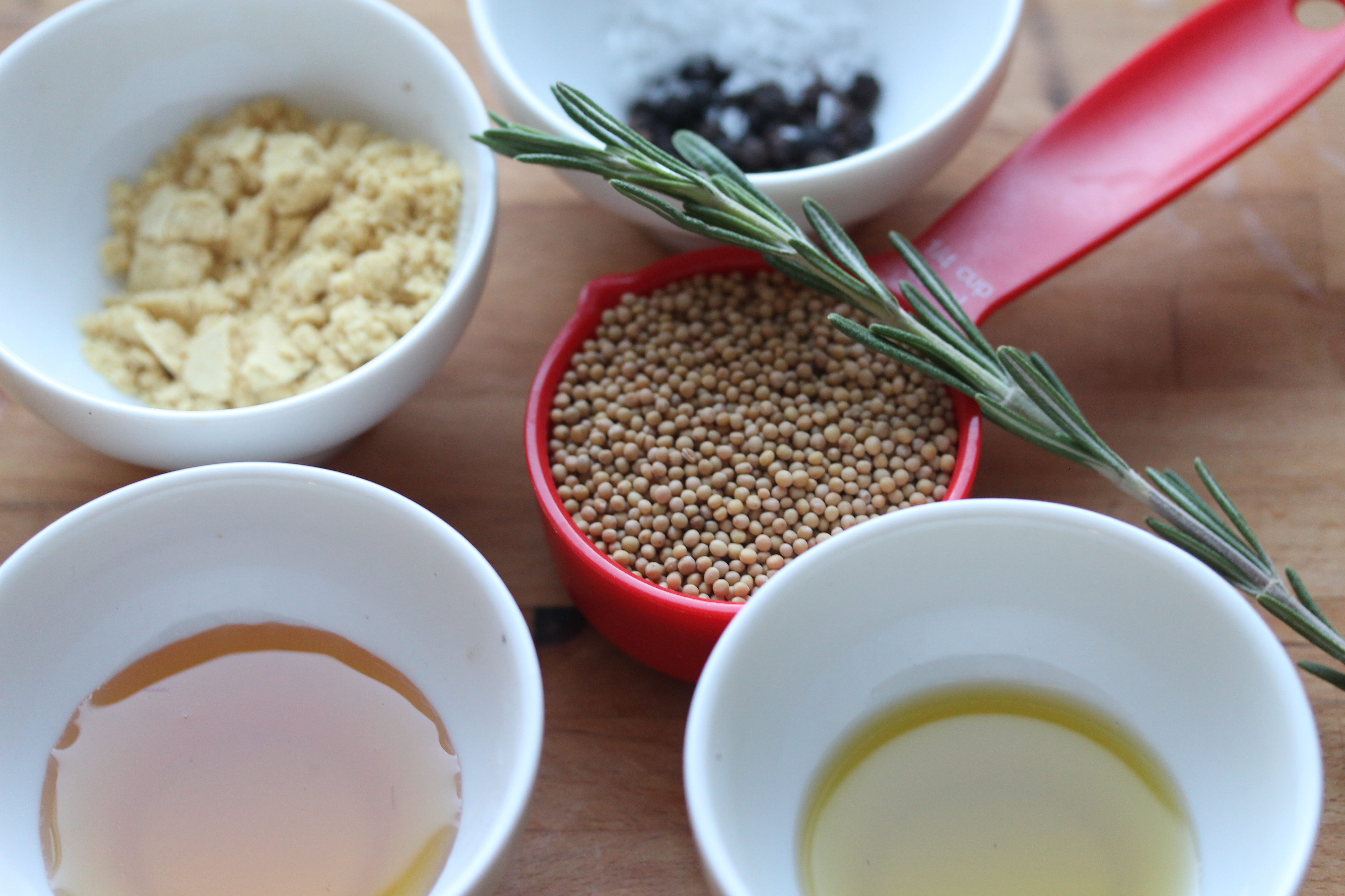 Mér finnst gott að hafa smávegis sætu í flestum sinnepstegundum svo ég var með 1 msk af þunnu hunangi. Svo var ég með 2 msk af ólífuolíu, svört piparkorn, gróft salt og 1 rósmaríngrein (og bætti svo annarri við).