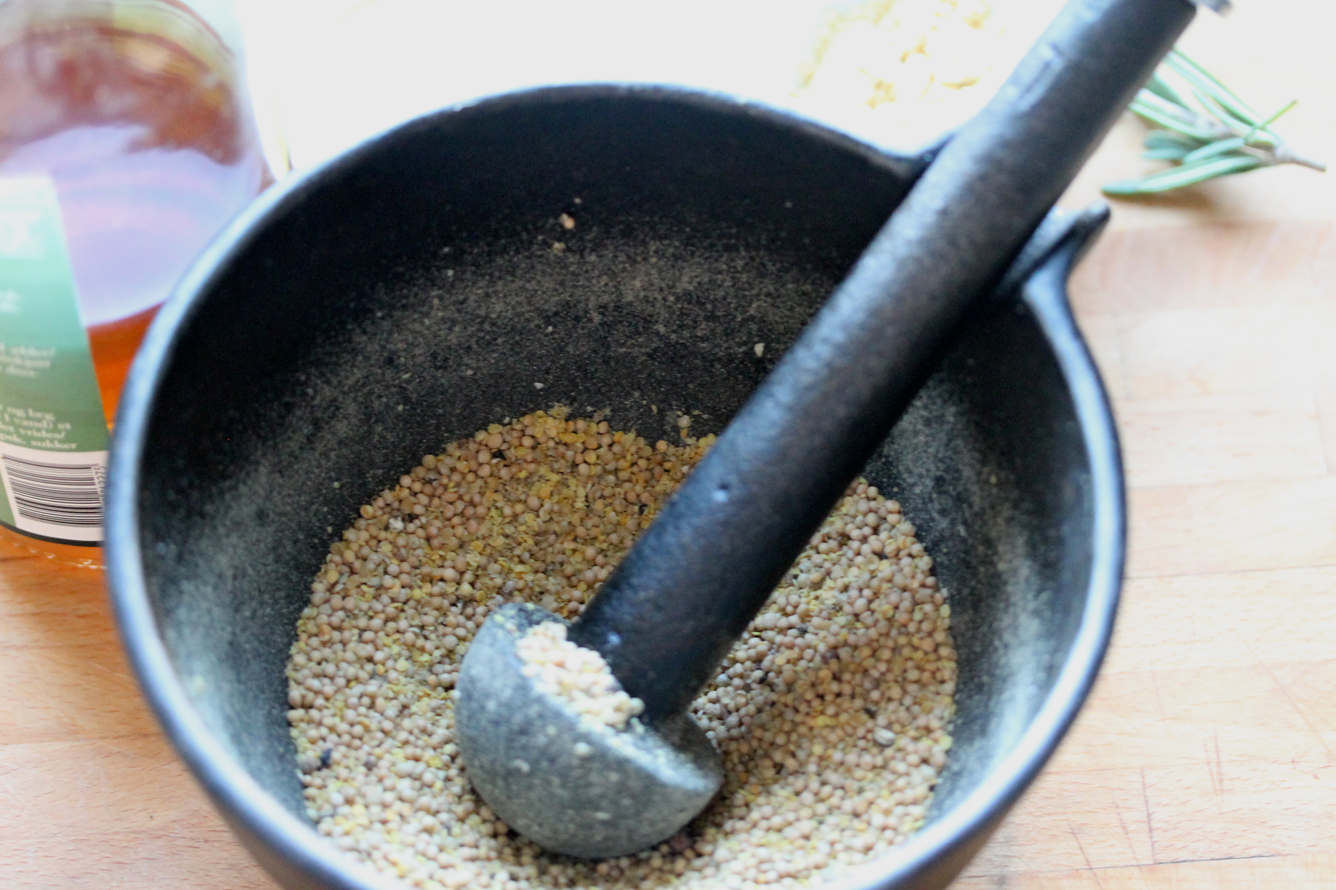En ég var búin að ákveða að gera nokkrar tegundir af sinnepi til að hafa með skinkunni. Það er reyndar einfaldara mál en margir halda – maður þarf ekkert endilega að hafa sérstaka skál og aldagamla fallbyssukúlu og velta þessu með lærunum eins og gert var í Landanum um daginn – mér dugir alveg mortél  til að steyta og hræra grófkorna sinnep og fínt sinnep, gert úr sinnepsdufti, er nú hægt að hræra bara í skál.