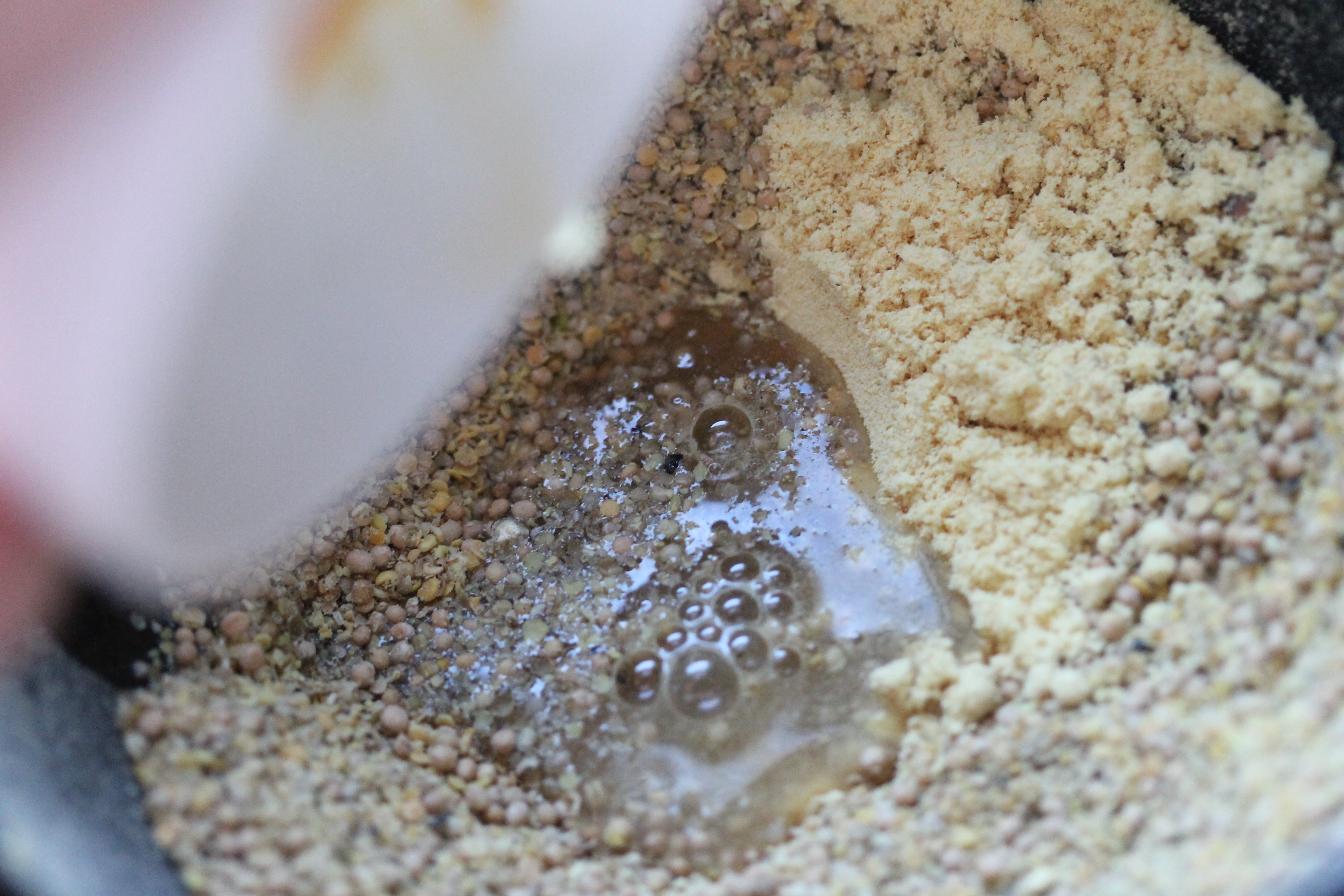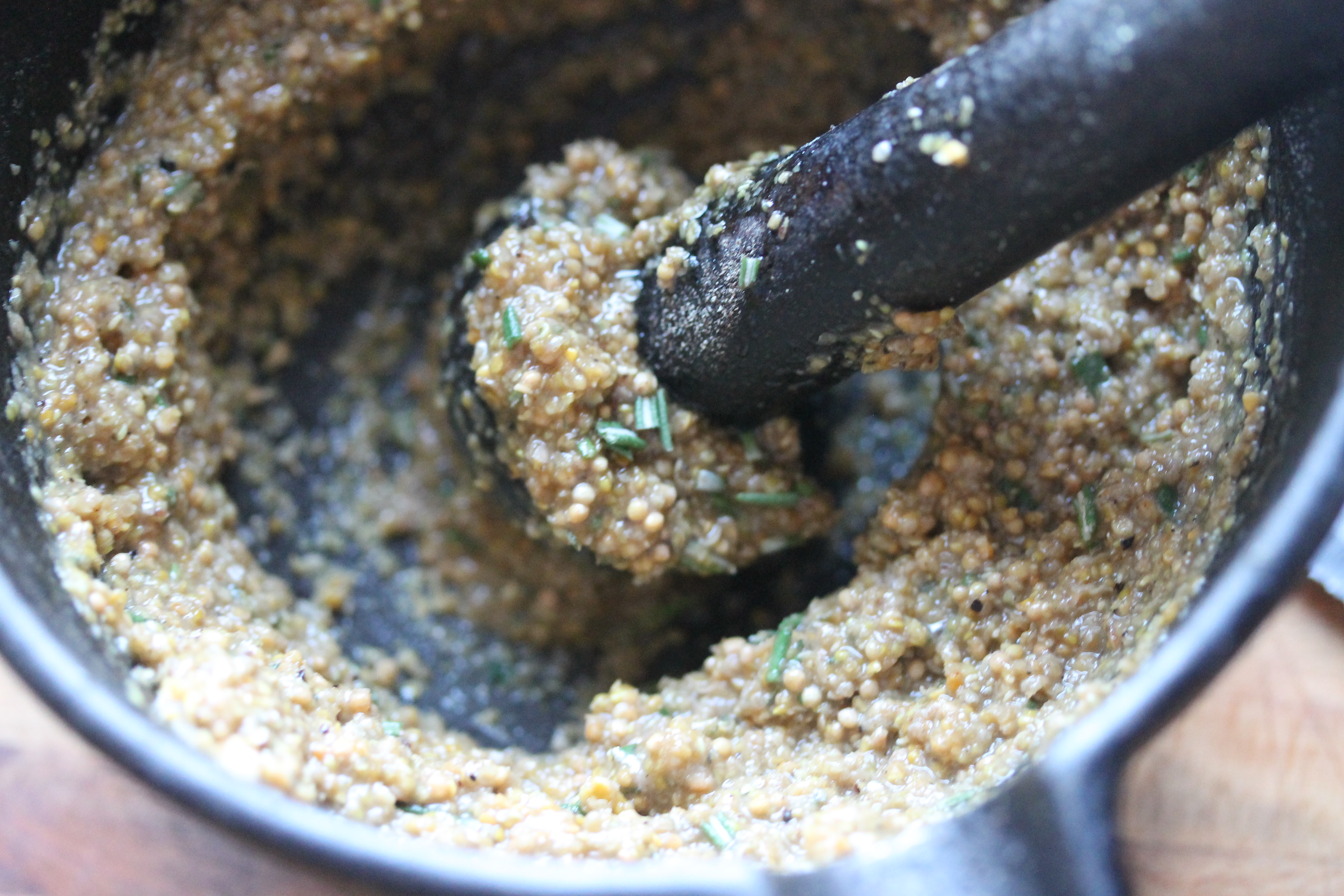Stauturinn í þessu mortéli er þungur og það þarf ekkert að berja á kornunum, bara hræra stöðugt í hringi, þá malast þau smám saman án mikillar áreynslu. Auðvitað má líka nota t.d. kryddkvörn. En ég vil helst hafa þau dálítið misgróf, sum í duft, önnur heil eða grófmöluð og hin þar á milli.