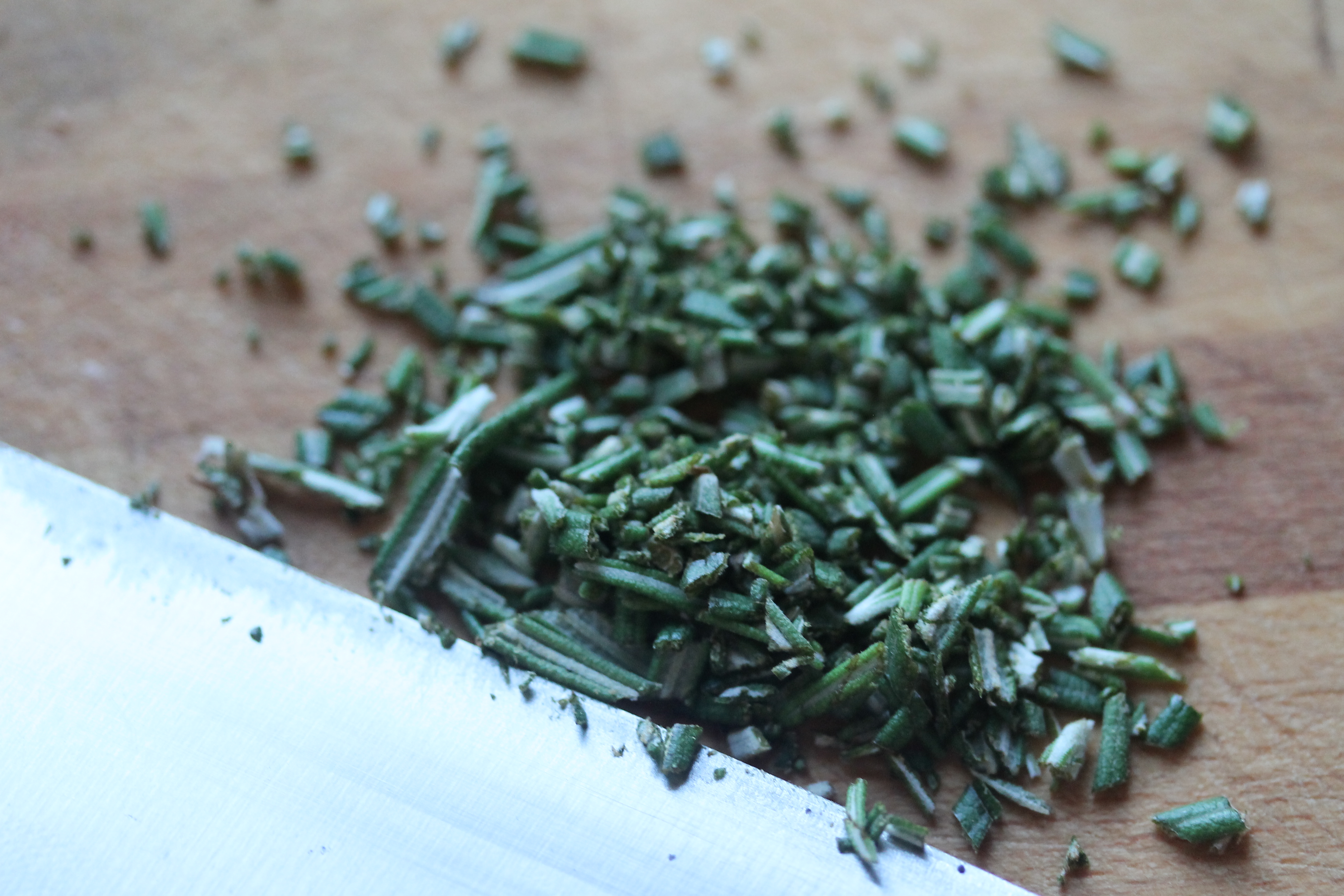 Og saxaði rósmarínið smátt og blandaði saman við. Það mætti líka nota ýmsar aðrar kryddjurtir í staðinn fyrir rósmarín – timjan mundi t.d. passa mjög vel. Eða sleppa kryddjurtum.