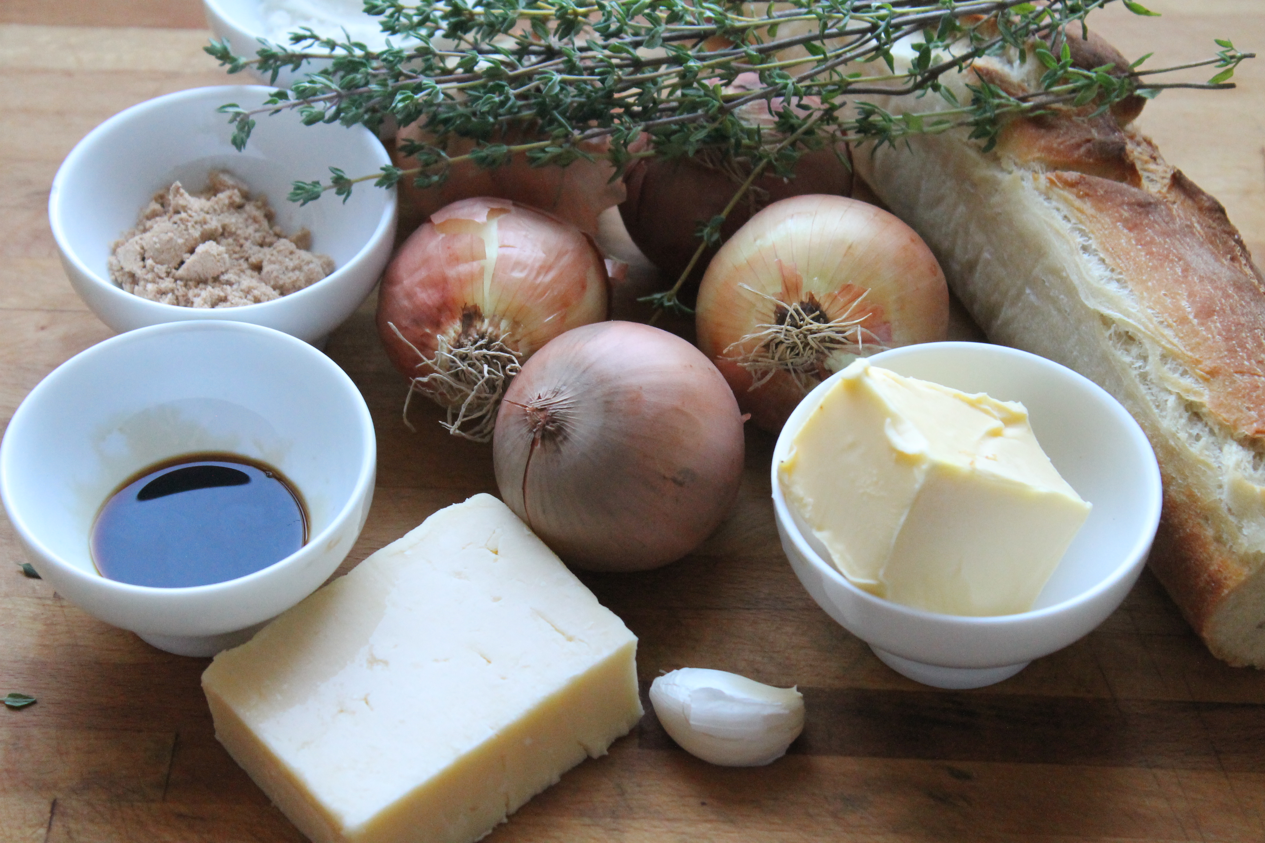 Ég notaði 500-600 g af lauk, eitt baguettebrauð (heimabakað; það má líka nota nokkrar sneiðar af stærra brauði), 60 g af smjöri (og meira til að smyrja brauðið), hvítlauksgeira, salt og pipar, 1 msk af hveiti, 1 msk af balsamediki, 1 msk af nautakrafti, 1 l af vatni og 100 g af osti (sterkum enskum cheddar).