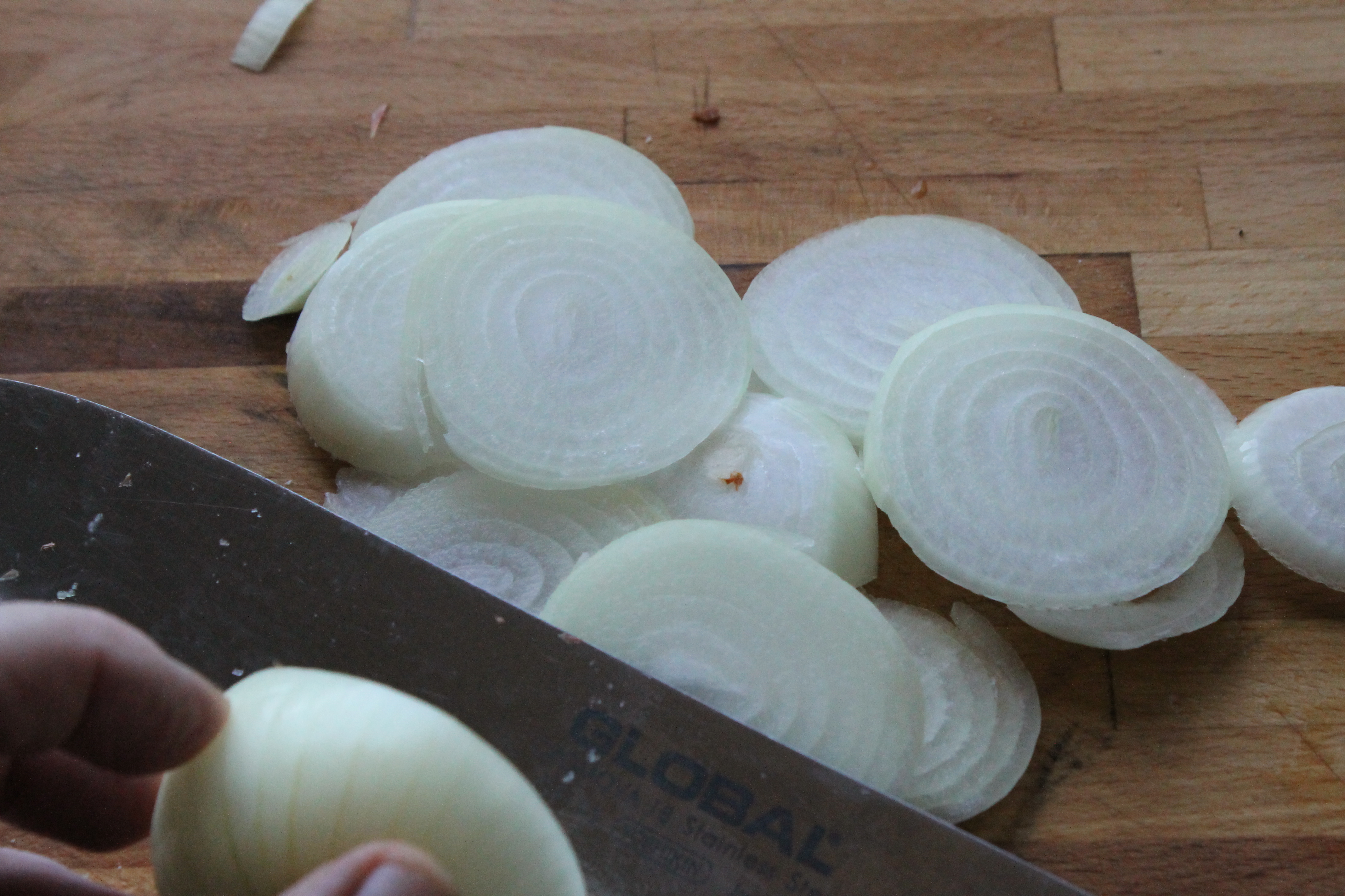 Ég byrjaði á að flysja laukana og skar þá svo í þunnar sneiðar (ef þeir eru stórir er e.t.v. gott að skera þá fyrst í helminga eða fjórðunga).