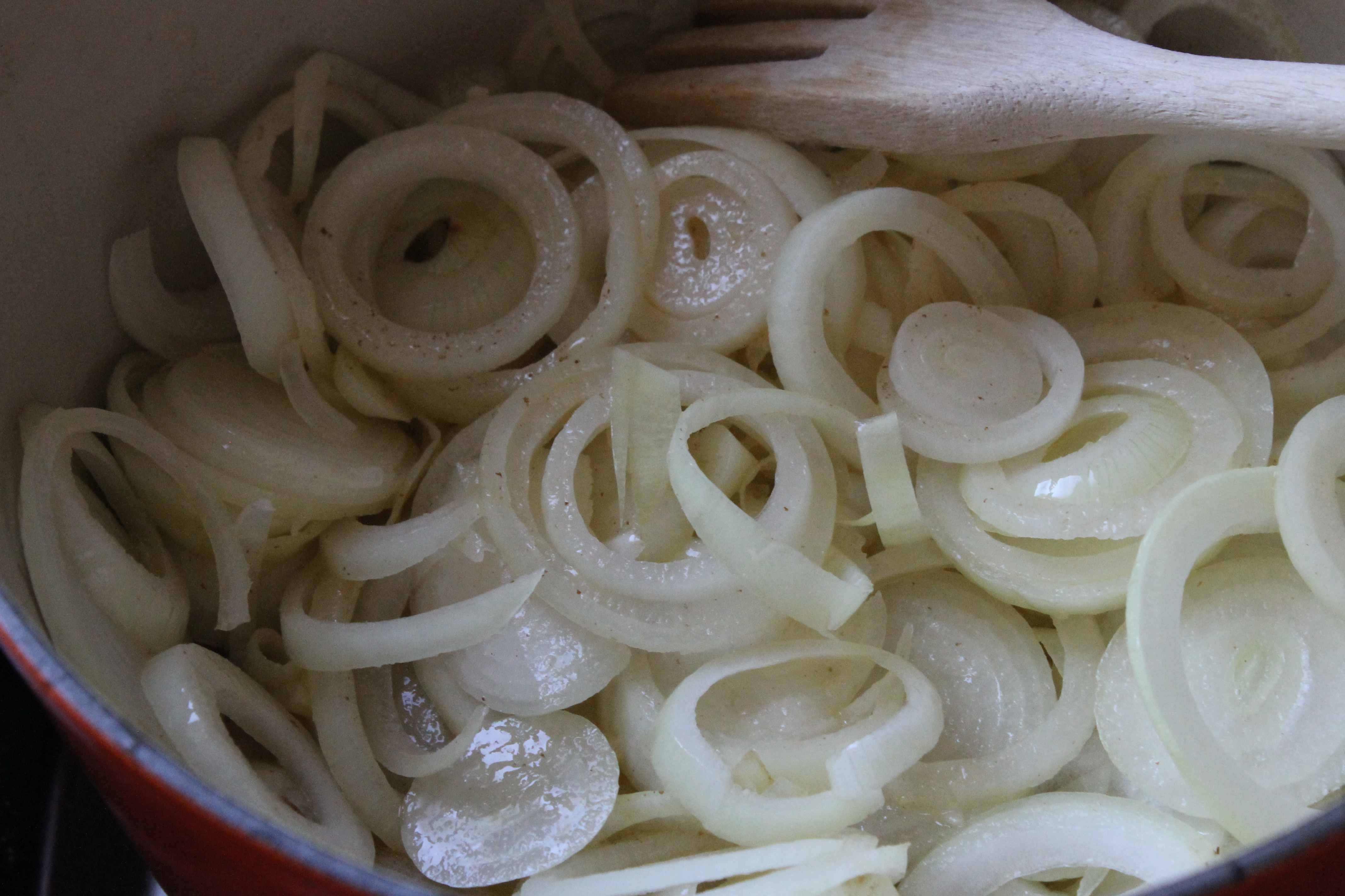 Síðan bræddi ég smjörið í potti, setti laukinn út í ásamt svolitlu salti og lét krauma við mjög vægan hita (allra lægstu stillingu) …