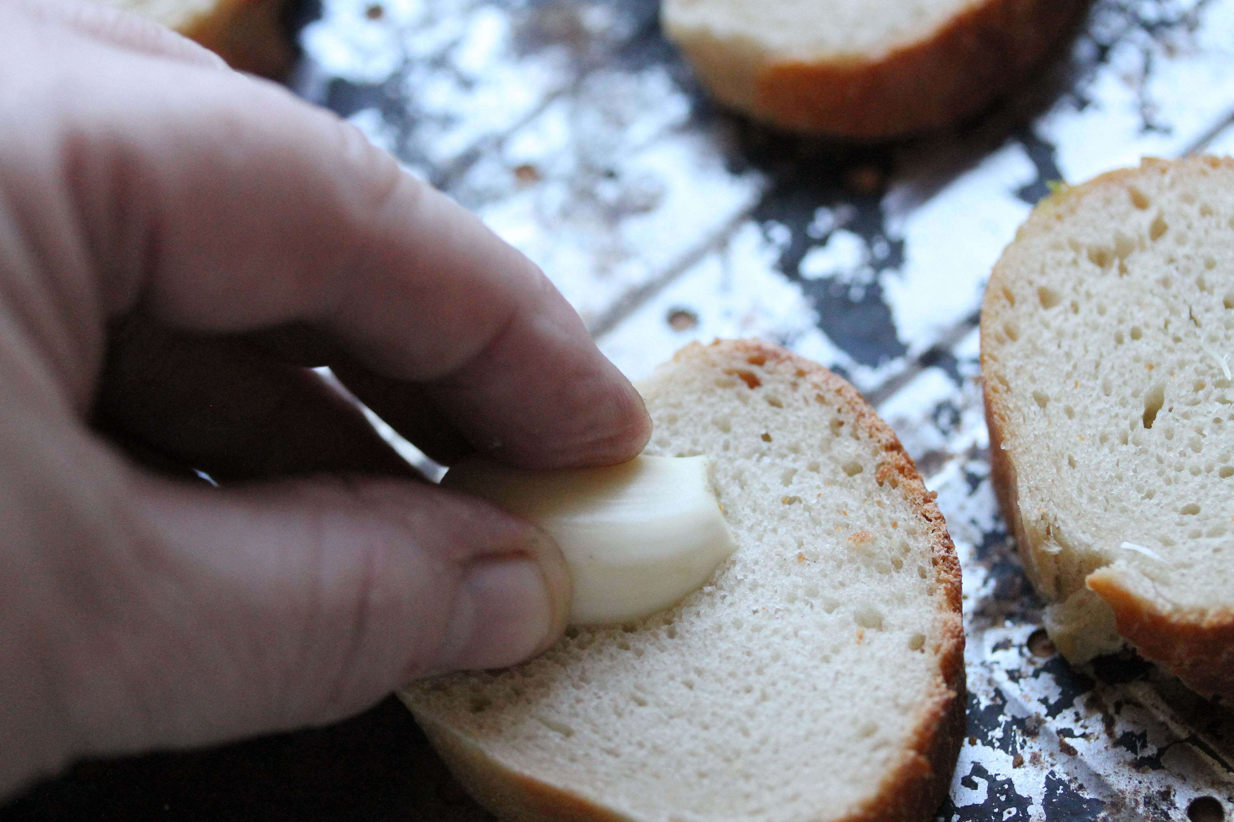 Ég hitaði svo grillið í ofninum. Skar 8 sneiðar af baguettebrauðinu. Skar hvítlauksgeirann í tvennt og nuddaði brauðið með skurðfletinum.
