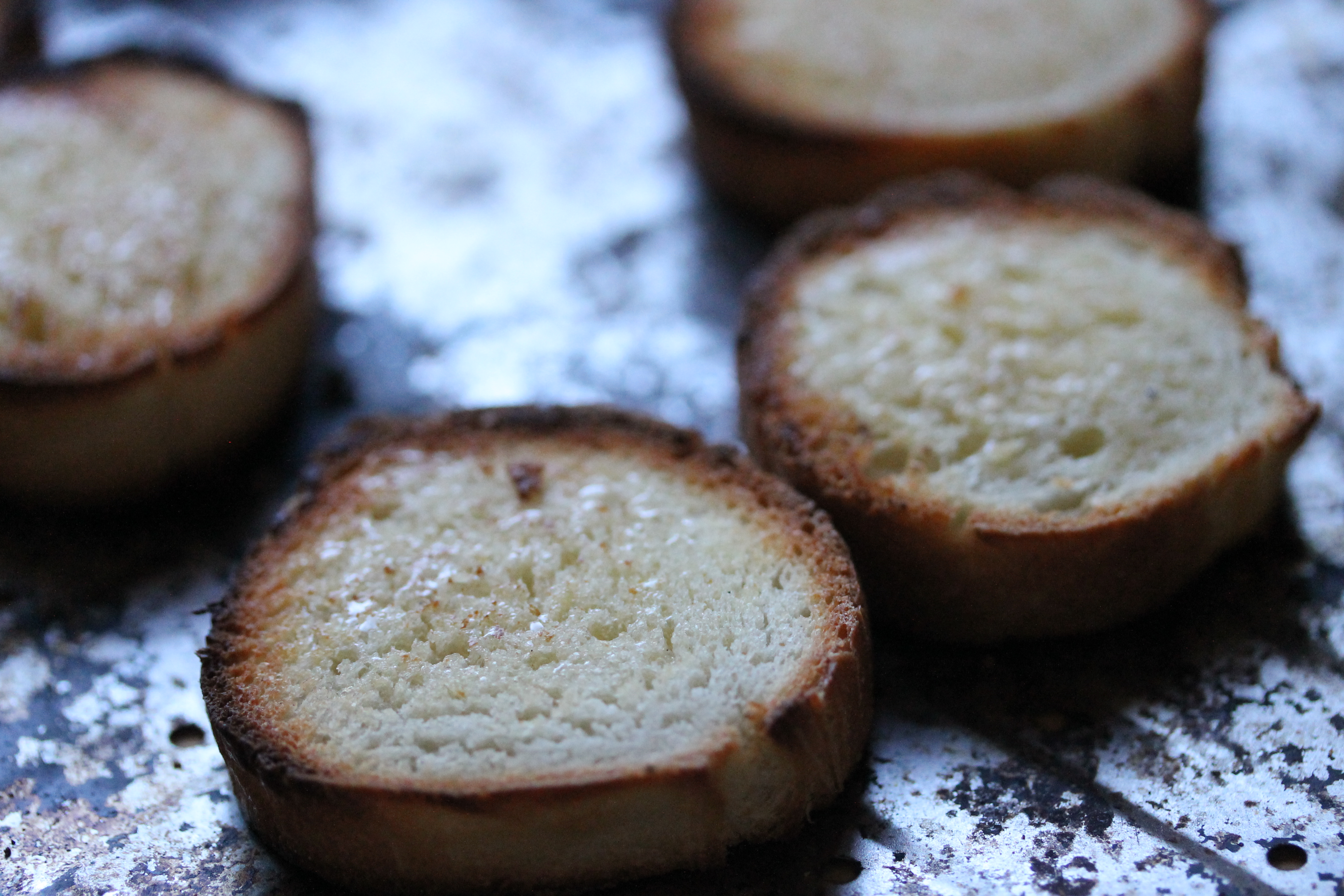 Ég smurði sneiðarnar létt með smjöri á báðum hliðum, raðaði þeim á plötu og ristaðu þær á báðum hliðum undir grillinu. Um að gera að fylgjast vel með þeim, þær eiga rétt að byrja að taka lit en ekki brenna.