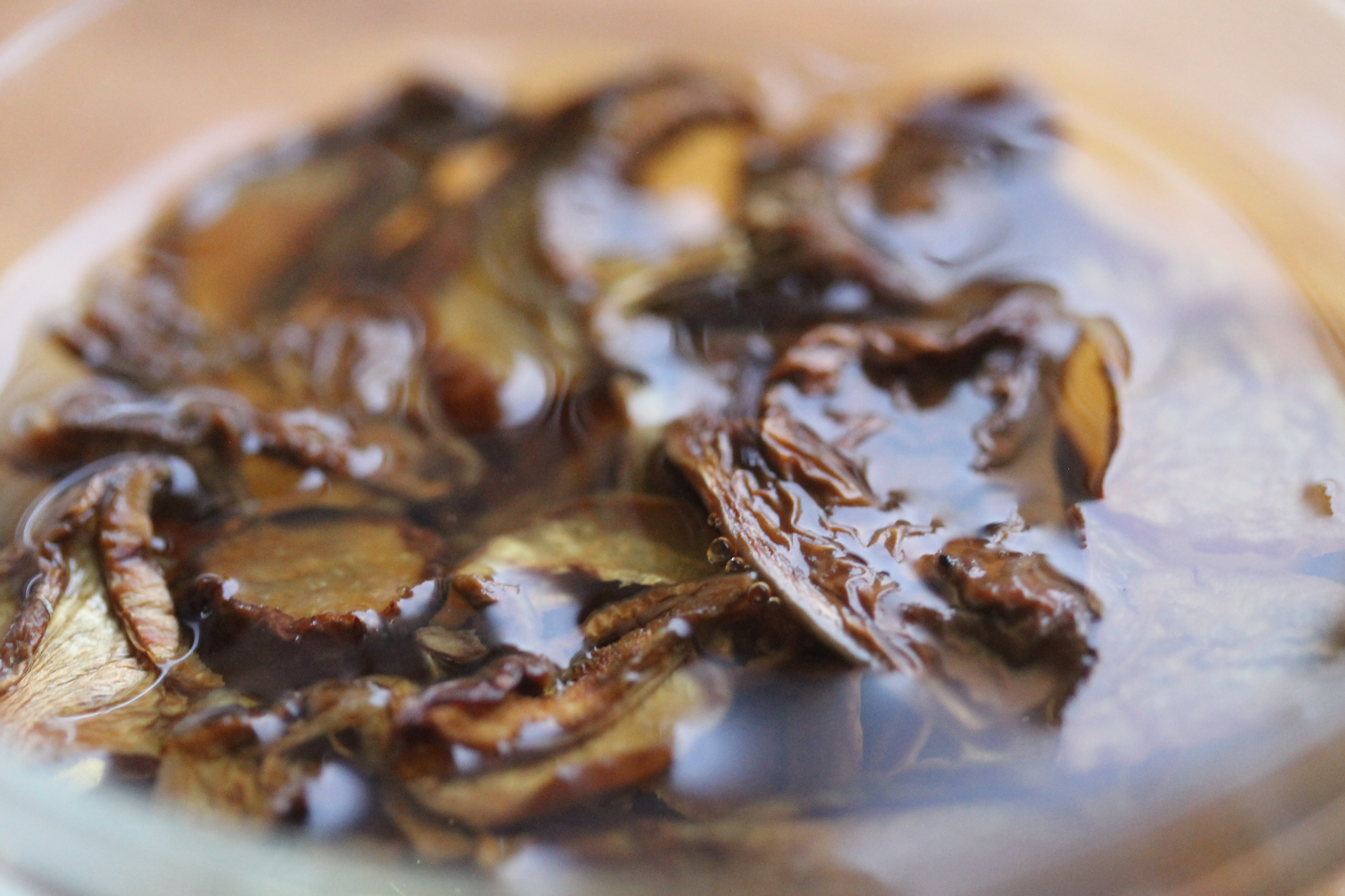 Ég byraði á að taka lófafylli af þurrkuðum lerkisveppum úr Hallormsstaðaskógi, setja í skál, hella heitu vatni yfir og láta standa í svona 20 mínútur.