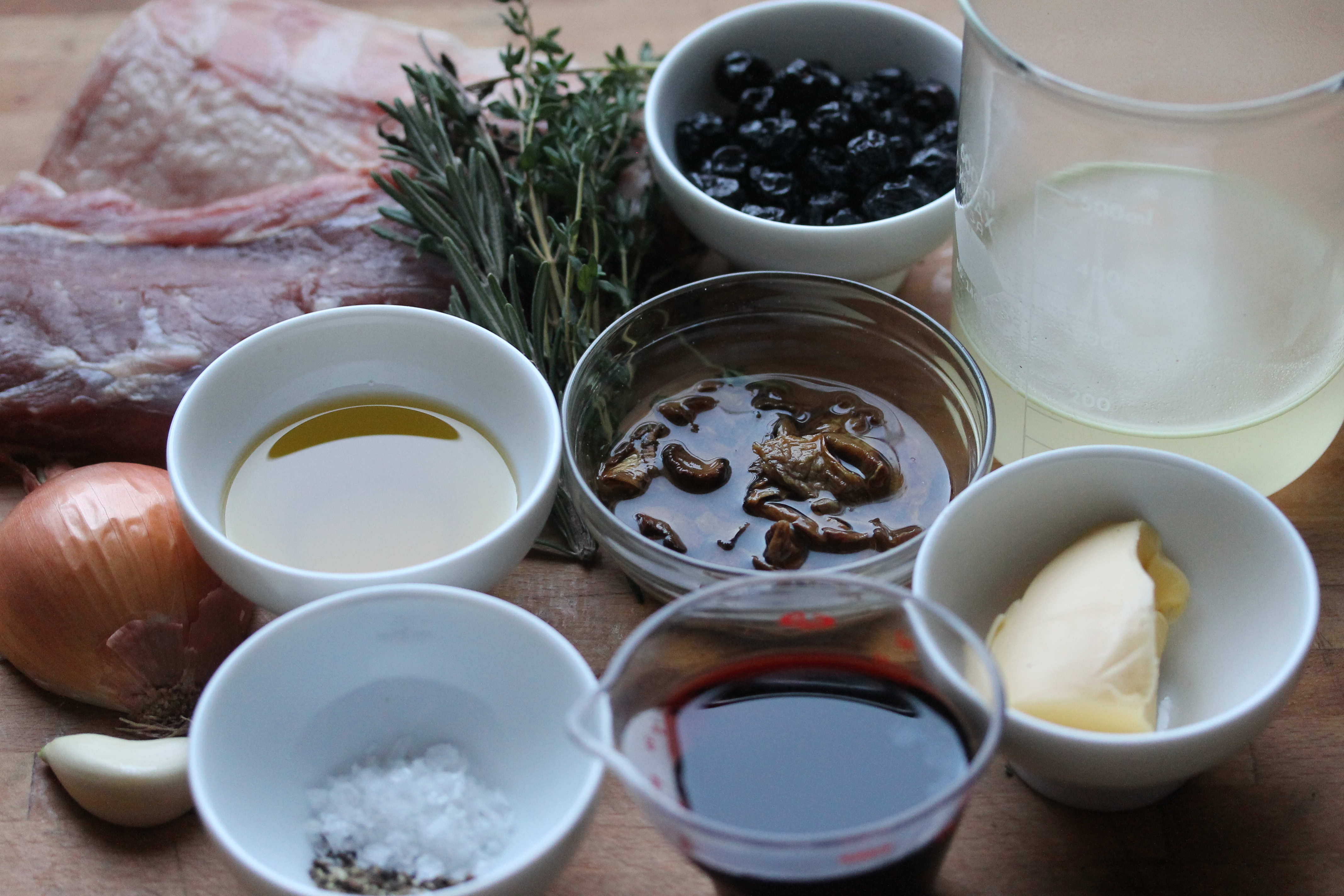 Ég átti til tvo bita af lambafilleti með fiturönd, frá Kaupfélagi Skagfirðinga en svosem ekkert endilega skagfirskt fyrir því, svona 450 grömm minnir mig; nokkrar timjangreinar og eina eða tvær rósmaríngreinar (má nota bara annaðhvort, eða nota þurrkaðar kryddjurtir), 1/2 lauk, 1 hvítlauksgeira, 1 msk af ólífuolíu, 1 msk af smjöri, nýmalaðan svartan pipar, salt, 2 1/2 matskeið af púrtvíni, 250 ml af soði (vatni og krafti), ögn af sósujafnara (er ekki á myndinni) og 2-3 matskeiðar af þurrkuðum bláberjum.