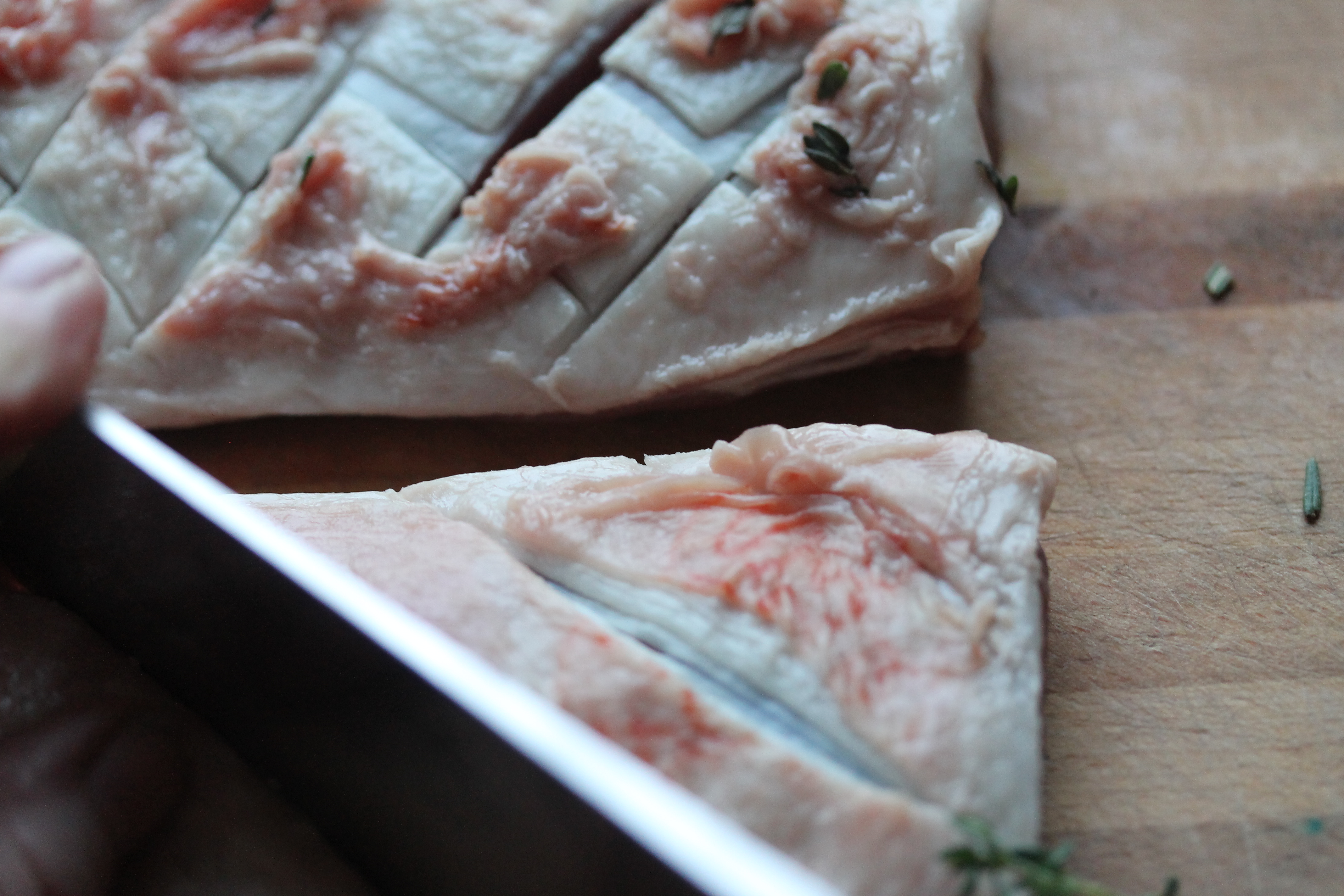 Ég kveikti á ofninum og stillti hann á 200°C og tók svo lambafilletin (sem ég hafði tekið úr ísskápnum nokkru fyrr svo þau voru við stofuhita) og skar tígulmynstur í fituröndina. Bara að kjötinu, ekki ofan í það.