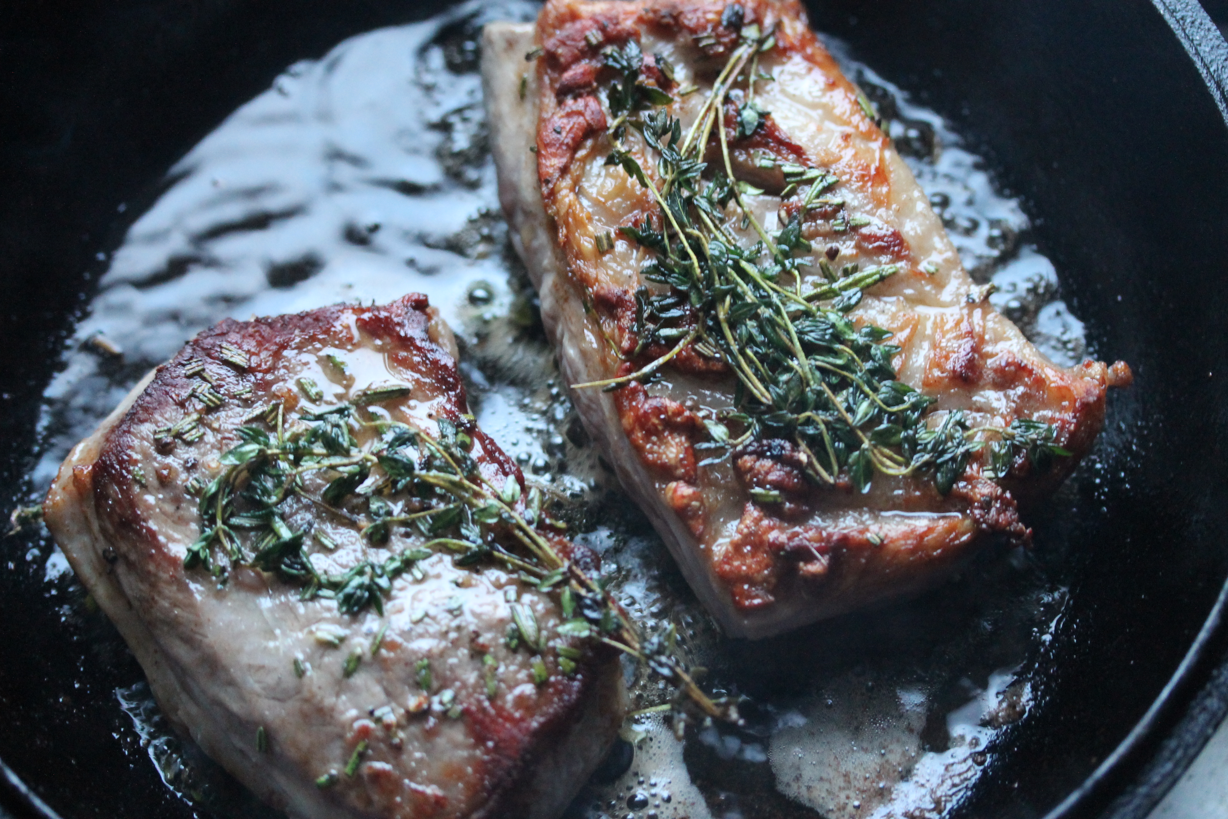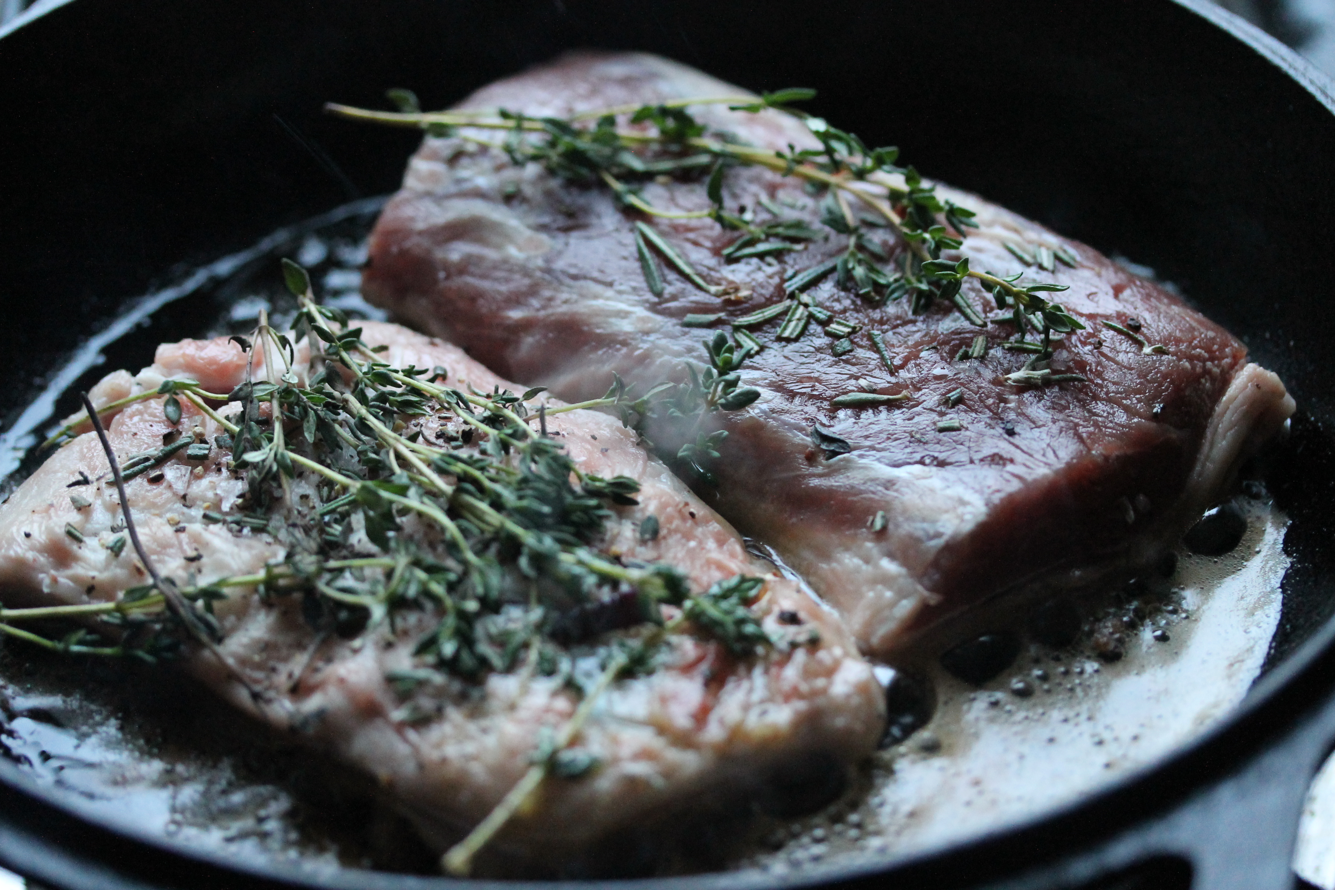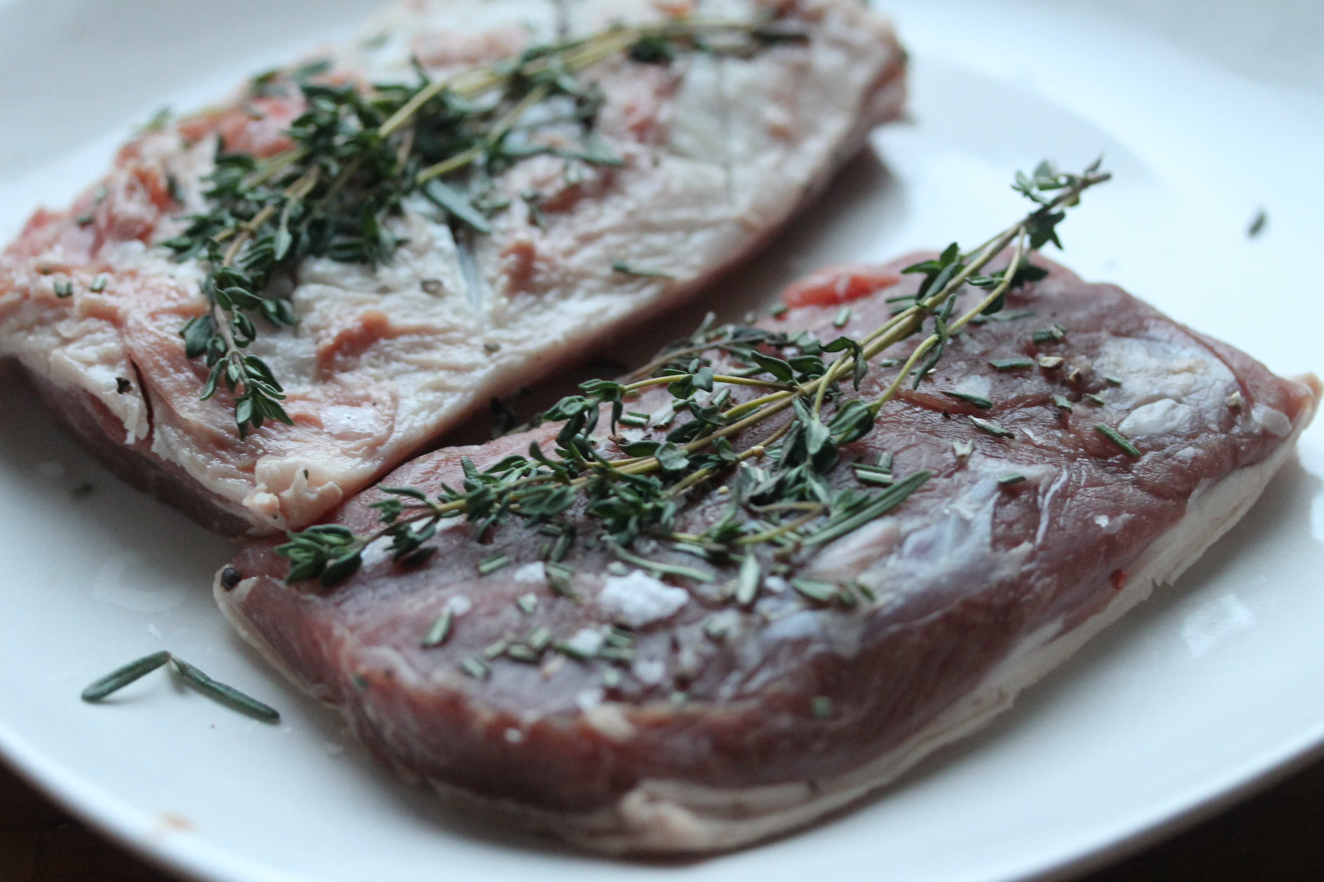 Ég saxaði rósmarínið , blandaði því saman við salt og pipar og stráði á kjötið og lagði svo einn eða tvo timjankvisti á hvora hlið á kjötbitunum. Lét liggja smástund.