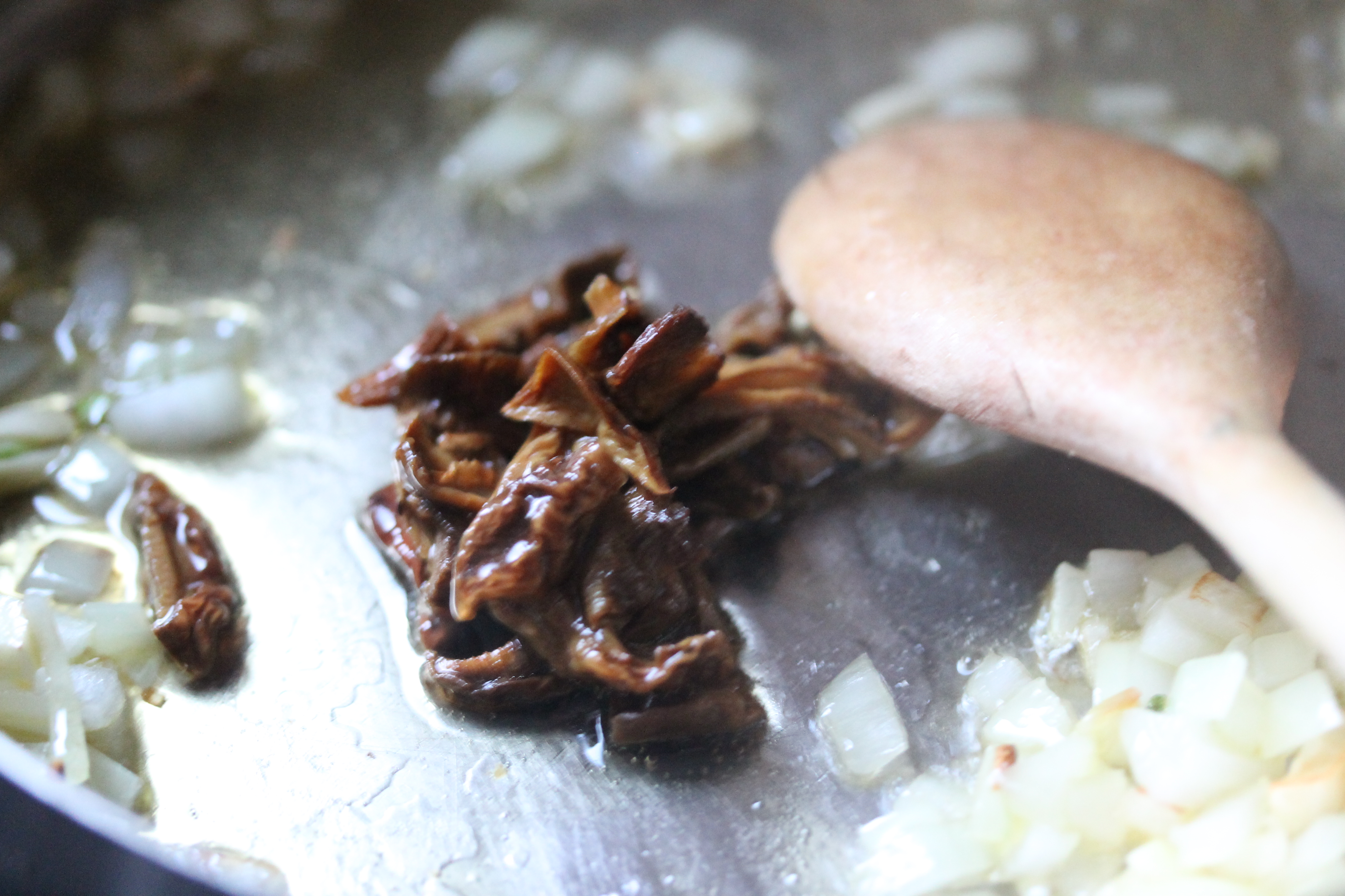 Saxaði laukinn og hvítlaukinn og lét krauma á pönnu í olíunni í nokkrar mínútur við meðalhita án þess að brúnast. Tók sveppina úr vatninu (en geymdi það), kreisti þá aðeins og lét þá krauma aðeins á pönnunni með lauknum.