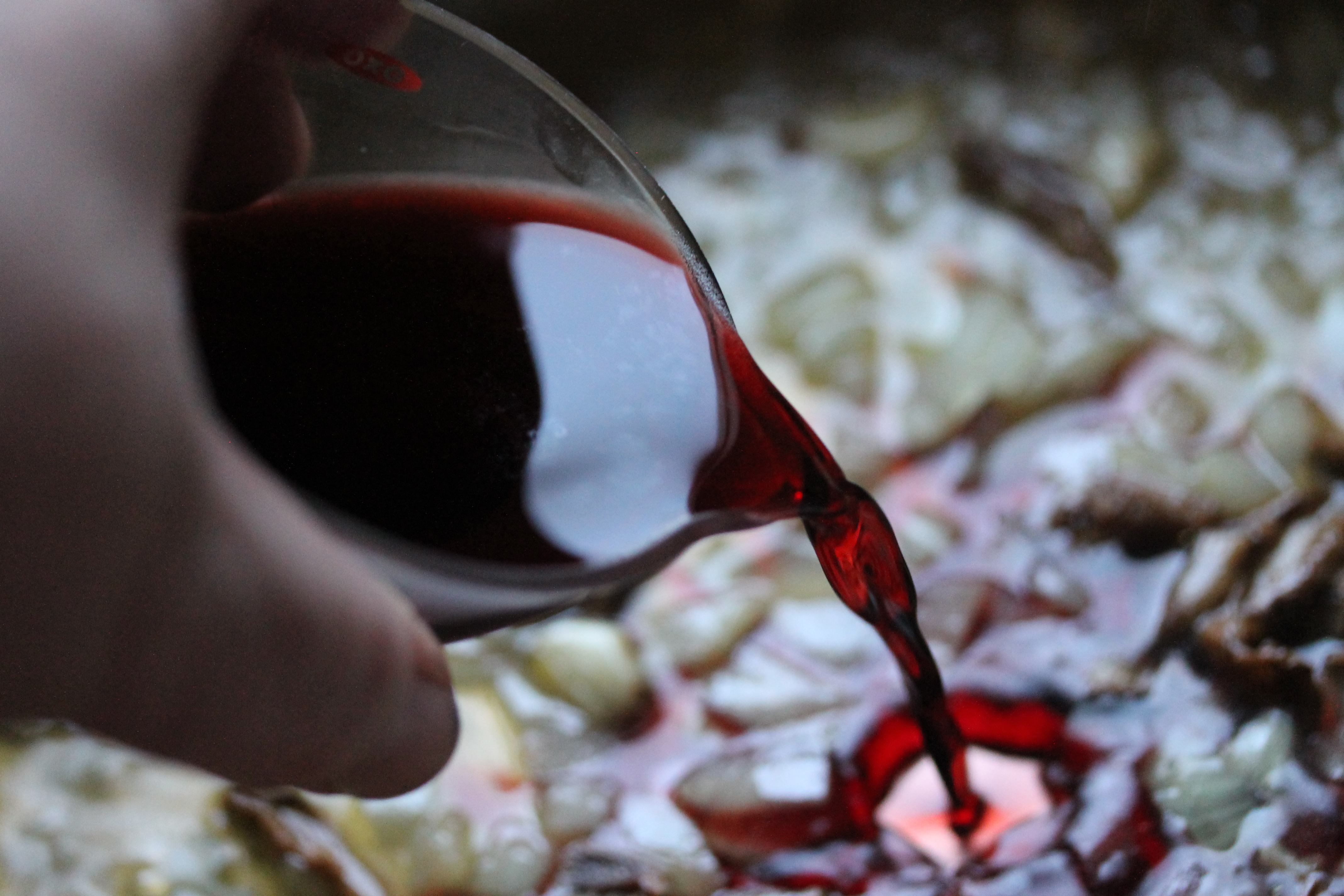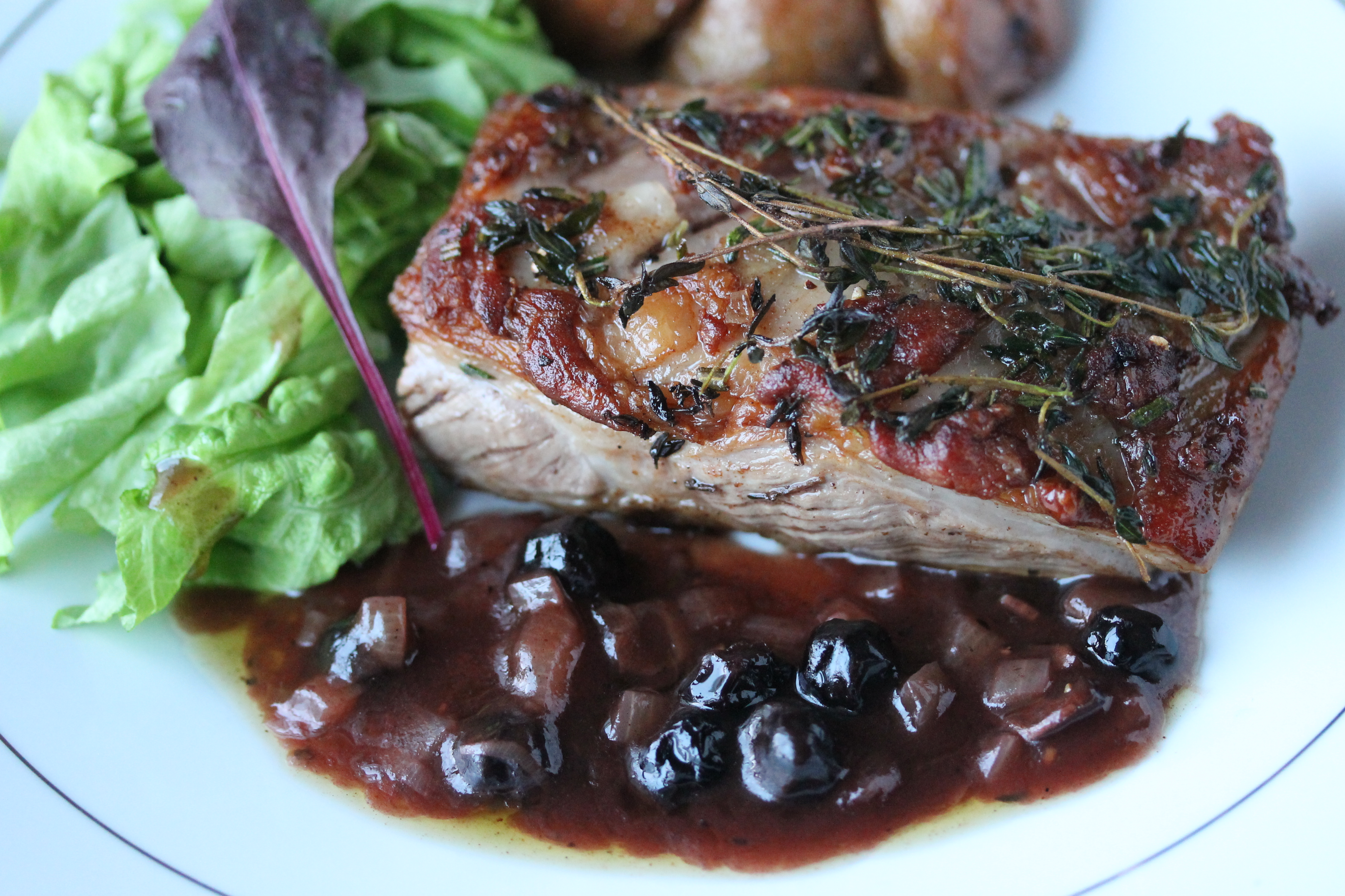 Á meðan kjötið stiknaði og beið kláraði ég sósuna. Hækkaði hitann, hellti púrtvíninu á pönnuna og lét sjóða rösklega. Setti berin líka út á en hefði látið það bíða ef ég hefði verið með fersk ber. Lét sjóða í nokkrar mínútur og þykkti svo sósuna með dálitlum sósujafnara, smakkaði og bætti við pipar og salti.