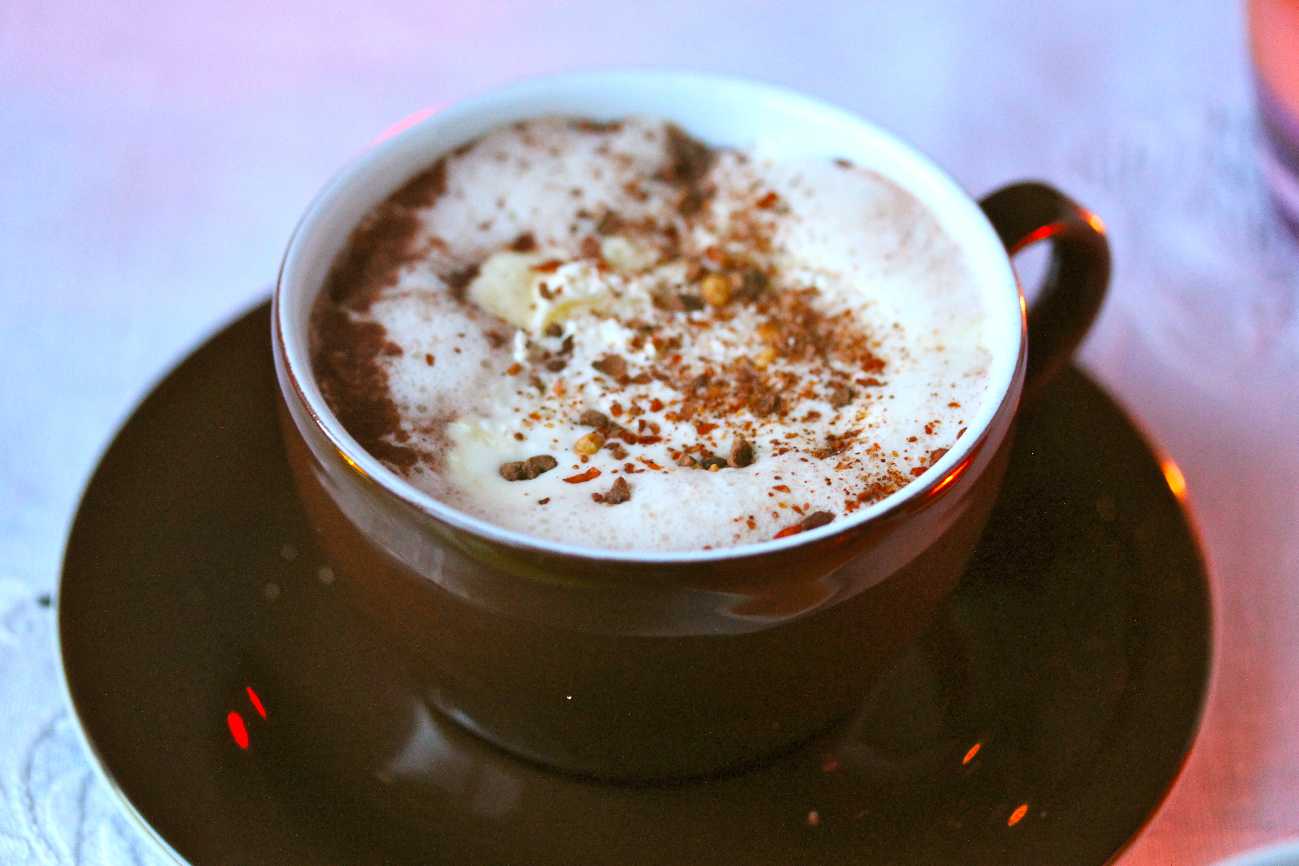 Settu vatn í pott og hitaðu að suðu. Blandaðu kakódufti, sykri, cayennepipar, negul og salti saman í lítilli skál og hrærðu saman við þegar sýður. Hrærðu svo mjólkinni saman við, hitaðu og láttu suðuna koma vel upp. Taktu þá pottinn af hitanum og hrærðu koníakinu saman við. Helltu í bolla og berðu fram með rjóma og chilisúkkulaðiflögum eða rifnu súkkulaði til að strá yfir.