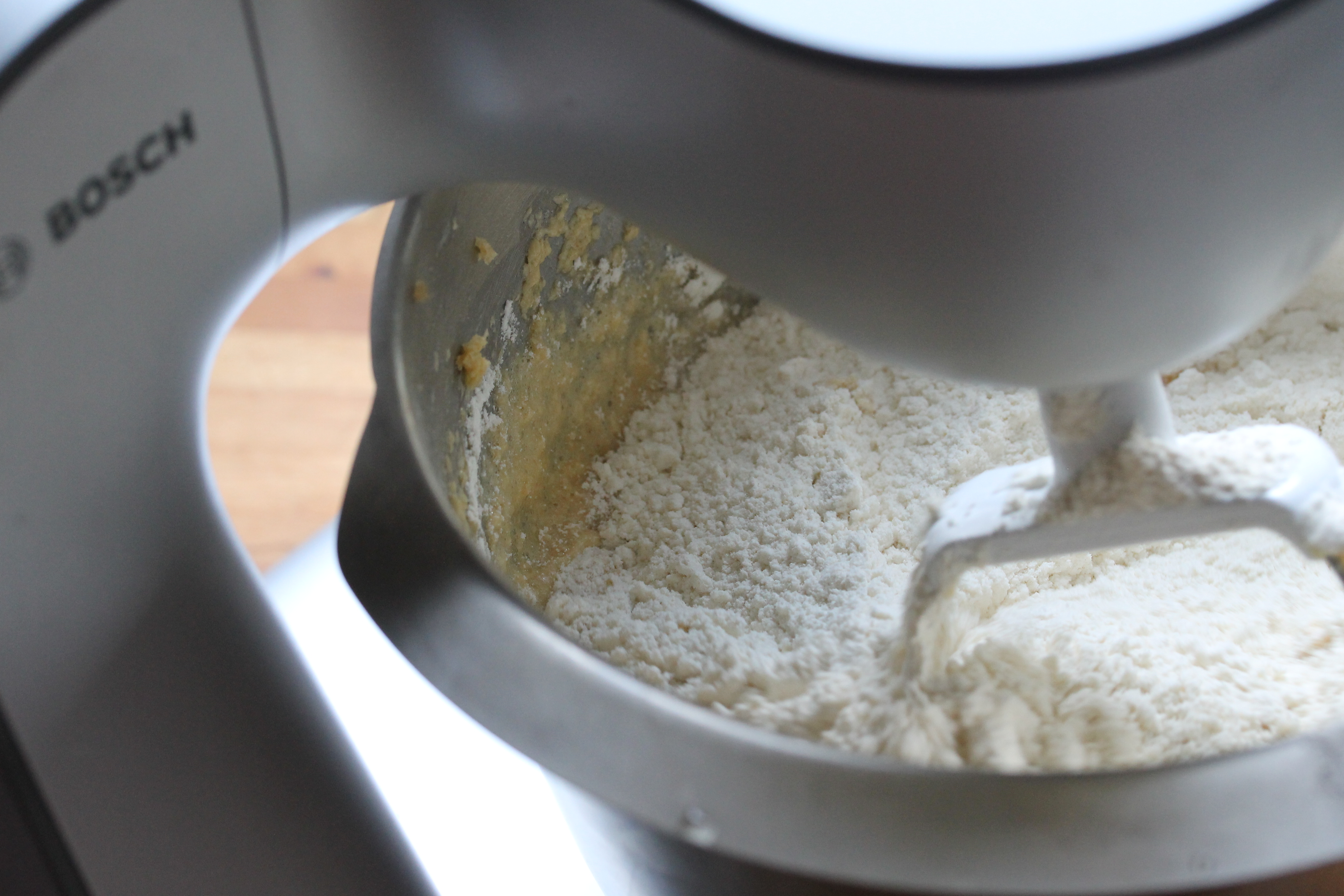 Svo blandaði ég saman 350 g af hveiti og 3½ teskeið af lyftidufti, setti út í og hrærði rólega saman við. Um að gera að hræra sem minnst eftir að hveitið er komið út í, bara rétt eins og þarf til að blanda því saman við blautefnin.