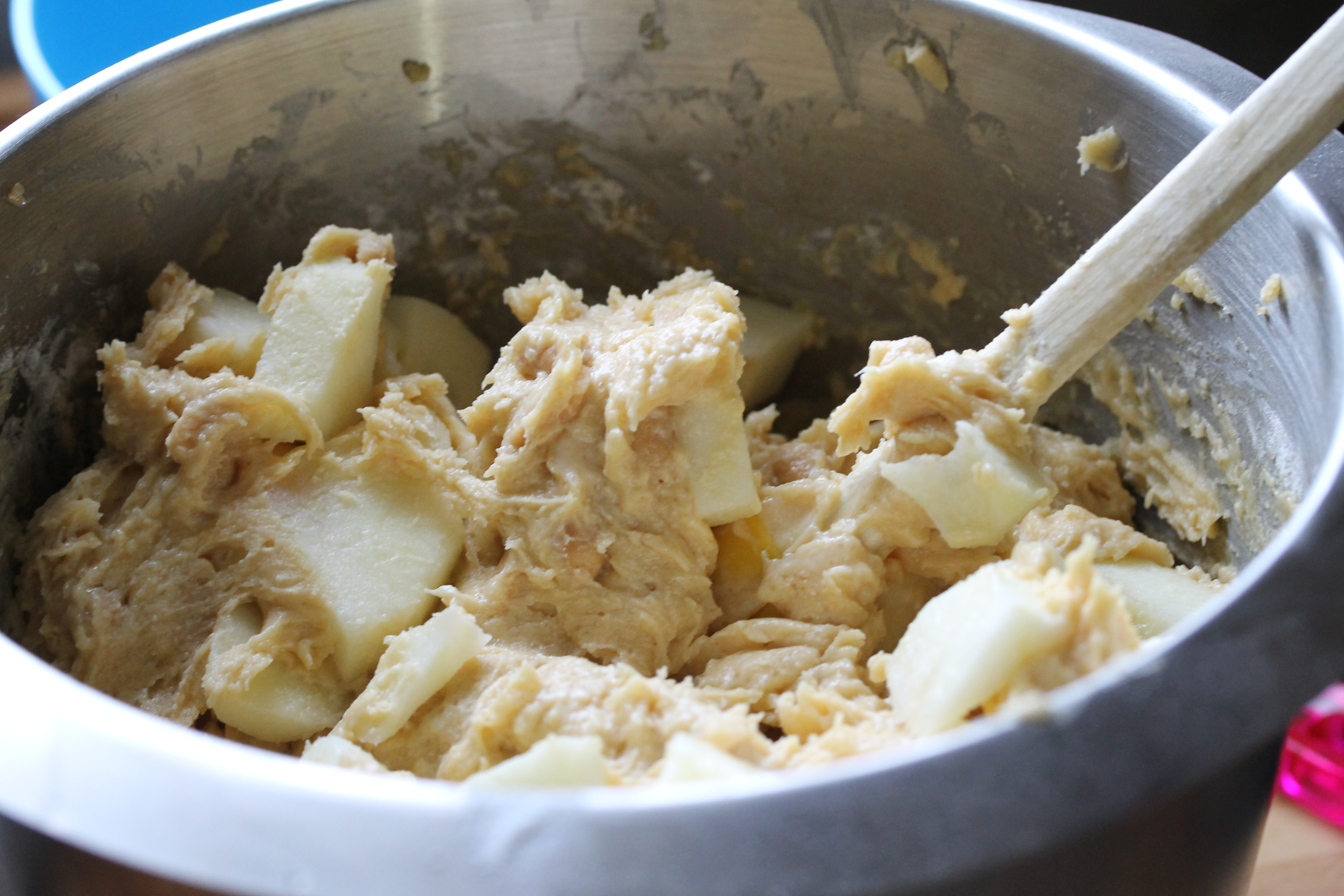 Að lokum blandaði ég eplabitunum saman við með sleikju.
