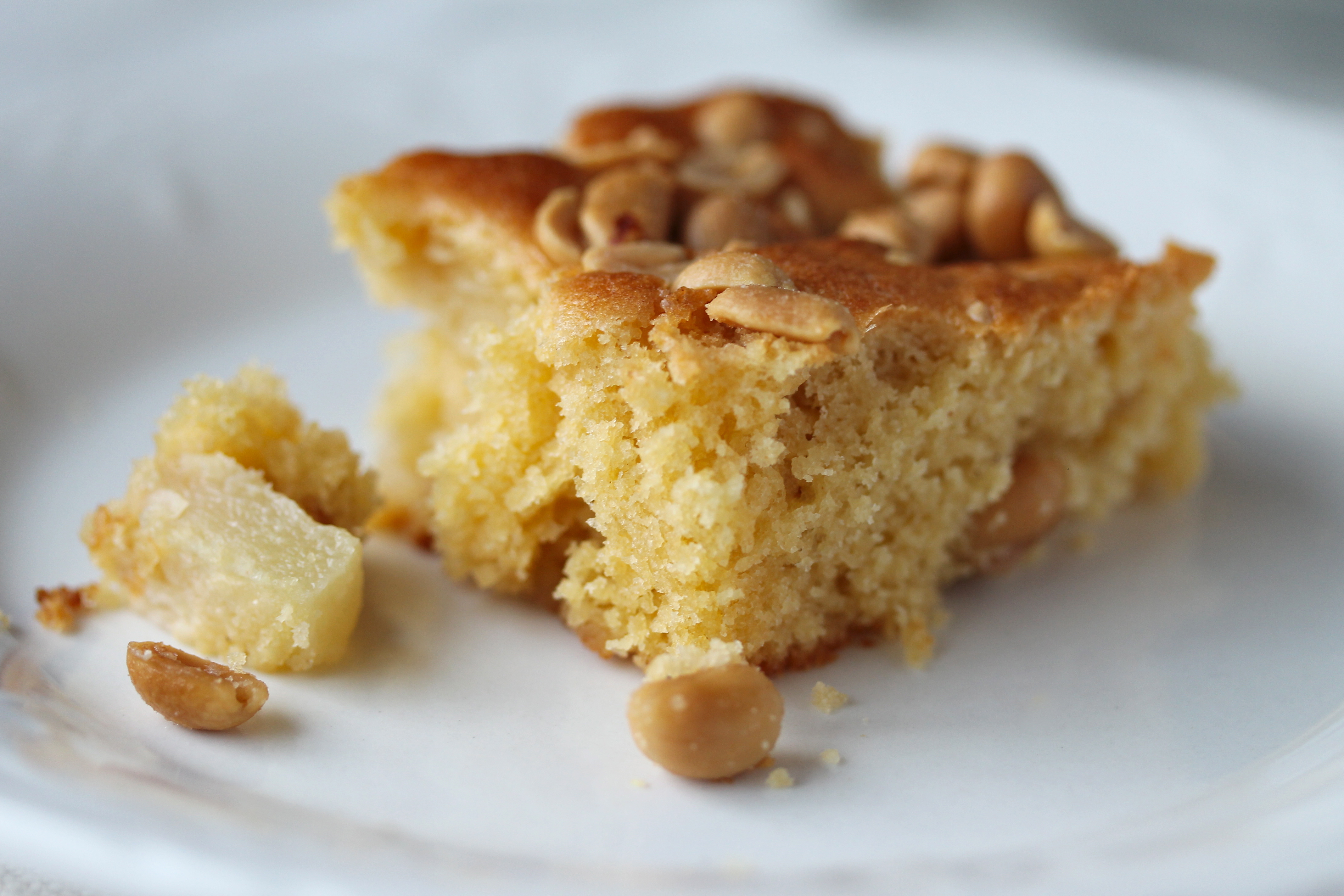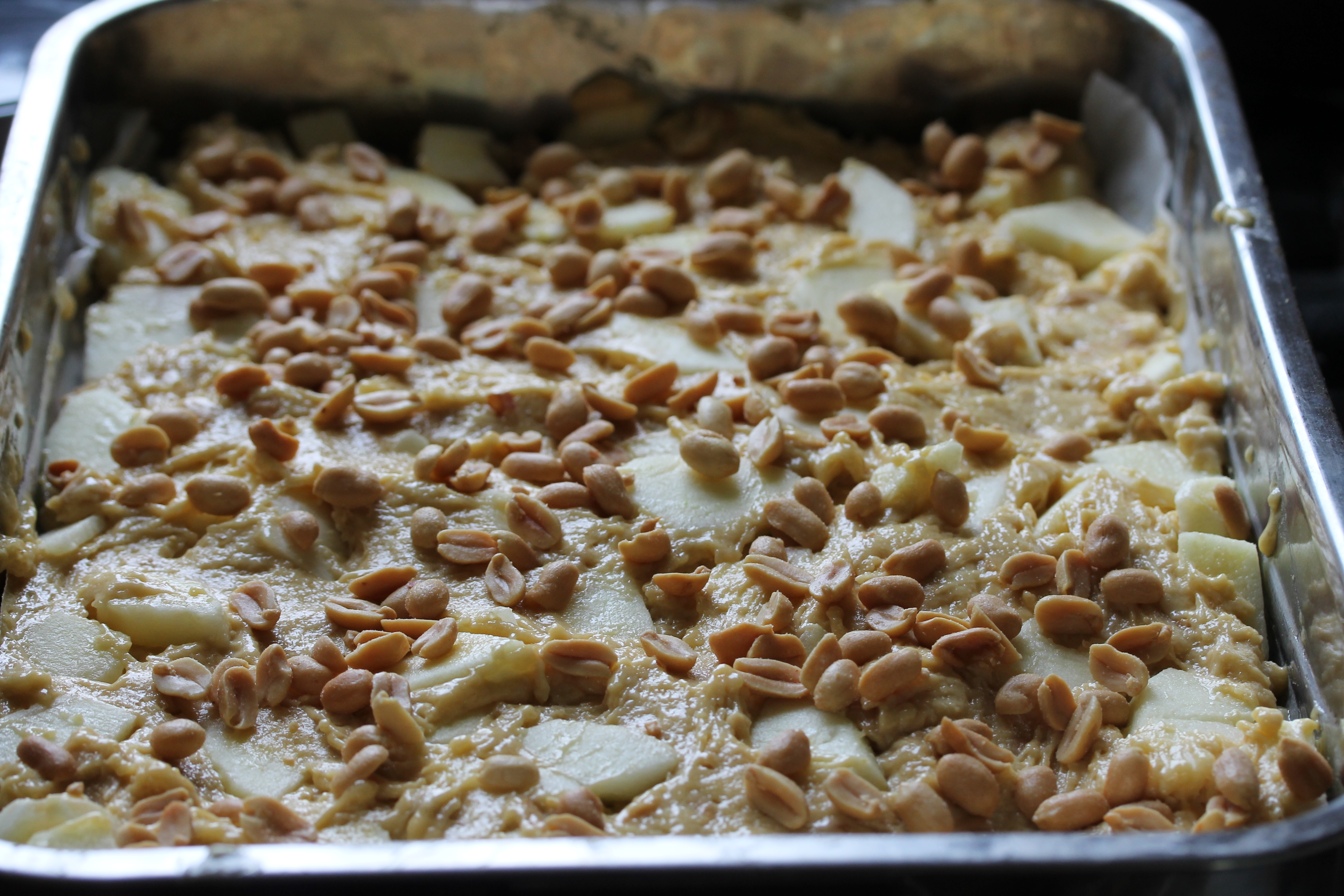 Ég klæddi stórt, ferkantað form (eða litla ofnskúffu) innan með bökunarpappír og jafnaði deiginu í formið. Stráði svo salthnetunum sem ég hafði tekið frá yfir deigið.