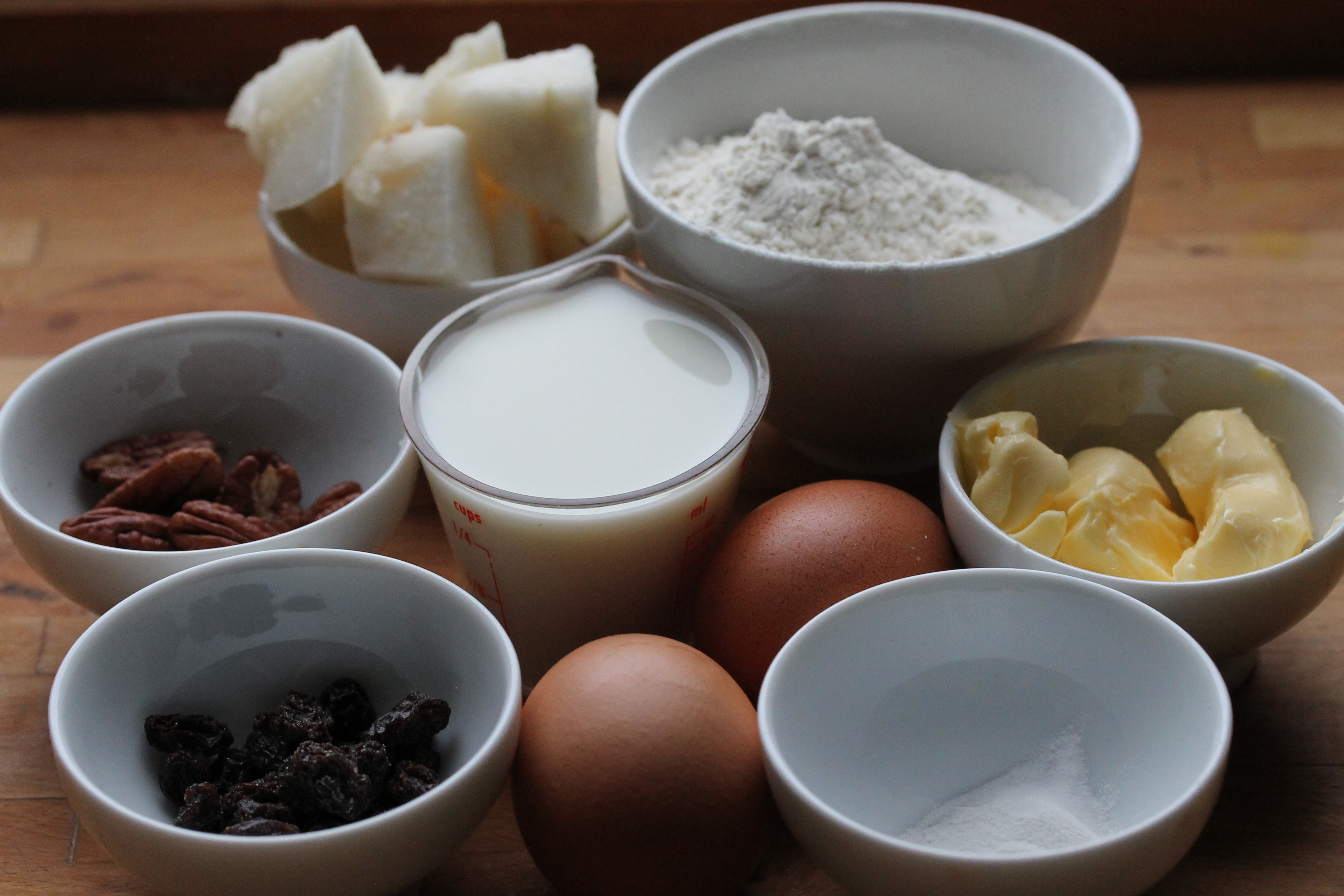 En semsagt: Ég notaði 100 g af vel þroskaðri peru (flysjaðri, kjarnhreinsaðri og í bitum), 2 egg, 150 g af hveiti, 1 tsk af lyftiduft,i, 1/8 tsk af matarsóda, 50 g af smjöri, 100 ml af mjólk, 2-3 msk af rúsínum og nokkrar pekanhnetur (svona 6-8). Og 1/4 tsk af kanel sem er ekki á myndinni því ég var ekki búin að ákveða að nota hann þegar hún var tekin.