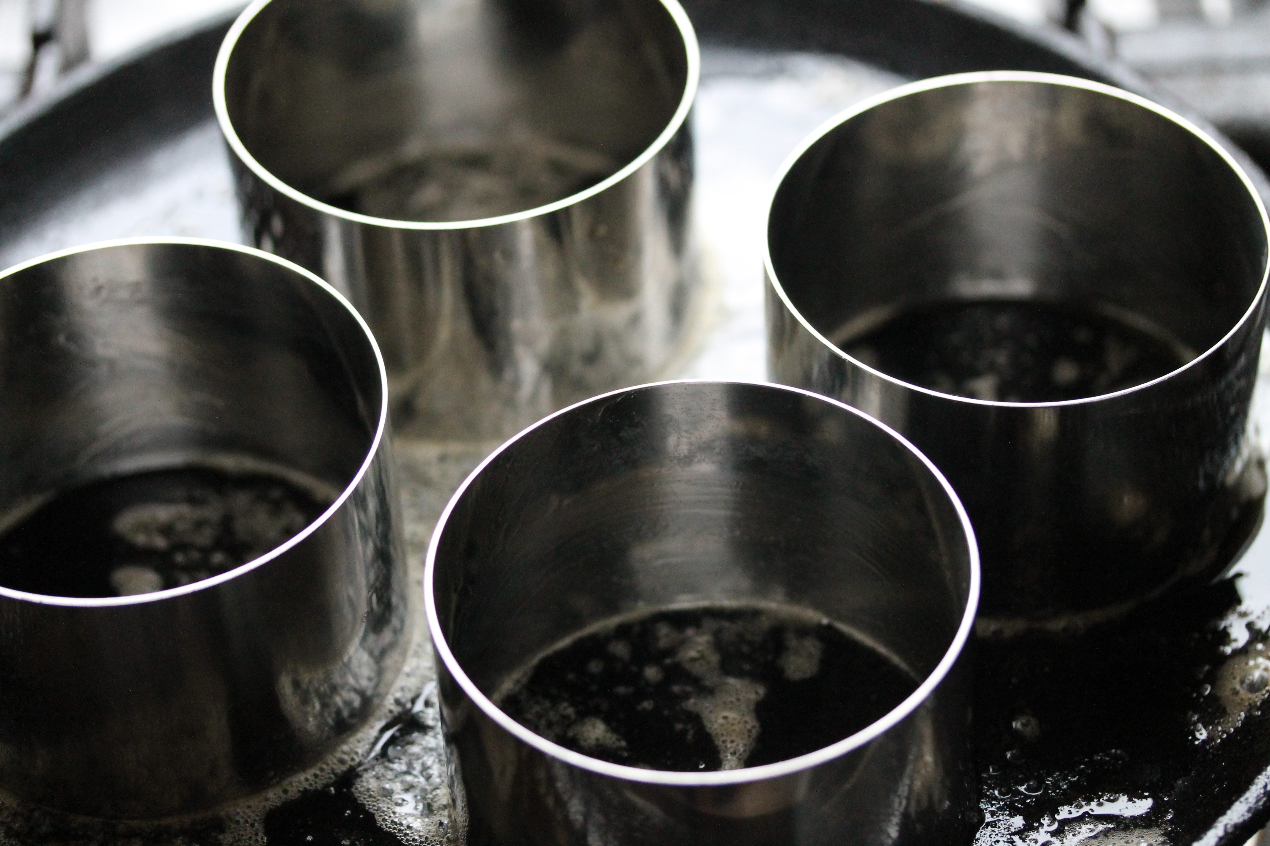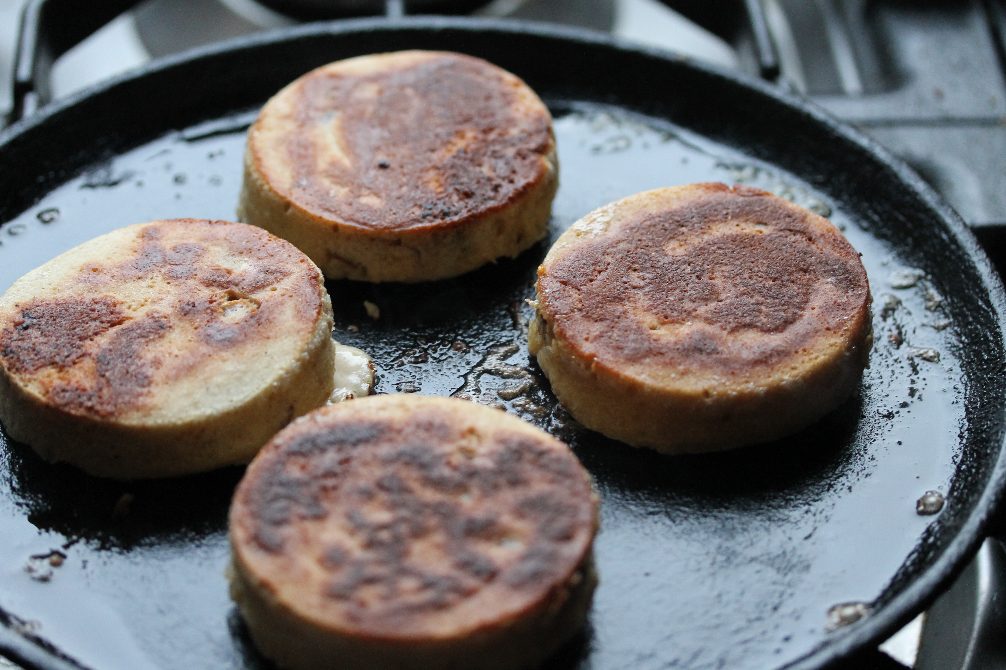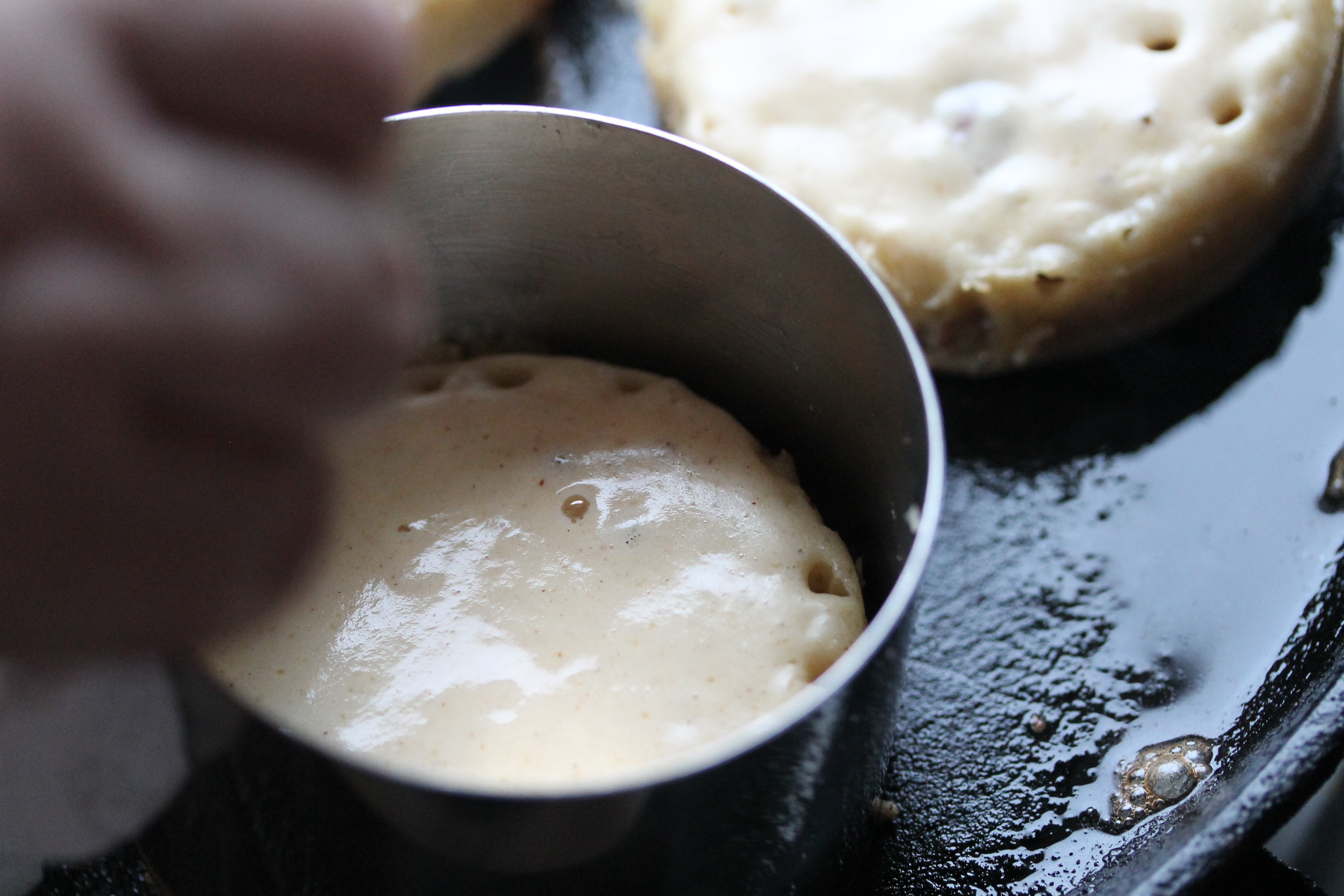 Ég bræddi svona 2 tsk af smjöri á pönnu og tók svo þessa ágætu málmhringi sem ég átti (4 stk) og setti á hana. Það þarf semsagt ekkert að nota svona hringi en lummurnar verða flottari í laginu og þykkari ef þeir eru notaðir. – Ég bleytti pensil í bráðnu smjörinu og renndi honum um innanverðan neðri kantinn á hverjum hring en það er ekkert bráðnauðsynlegt heldur.
