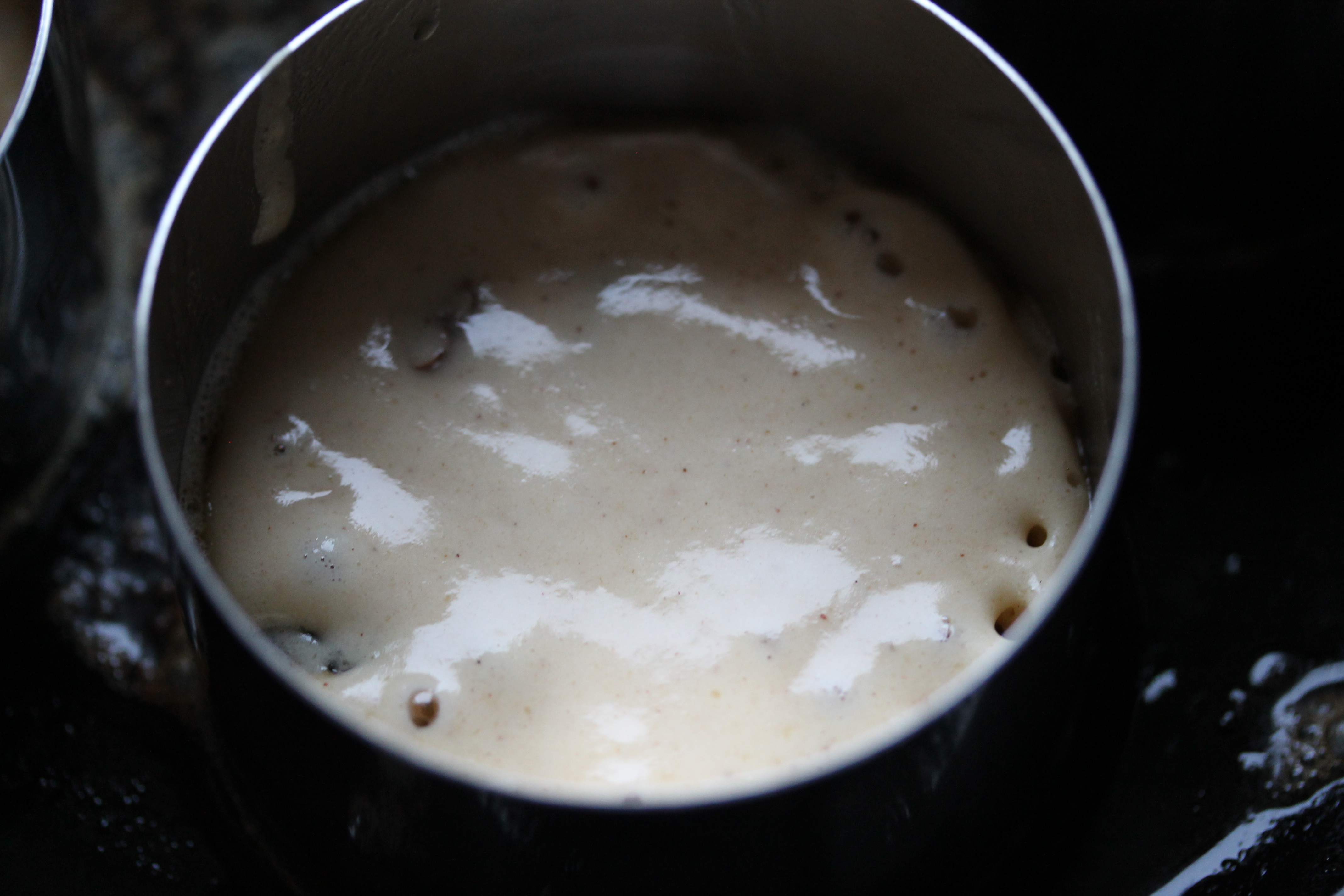 Svo setti ég hveiti, lyftiduft, matarsóda og mjólk út í, hrærði þar til blandan var slétt, horfði á hana, dýfði fingurgómnum í hana og smakkaði og það var þá sem ég ákvað að bæta við 1/4 tsk af kanel. En það mætti líka vel bragðbæta soppuna með vanillu eða sítrónusafa, til dæmis.