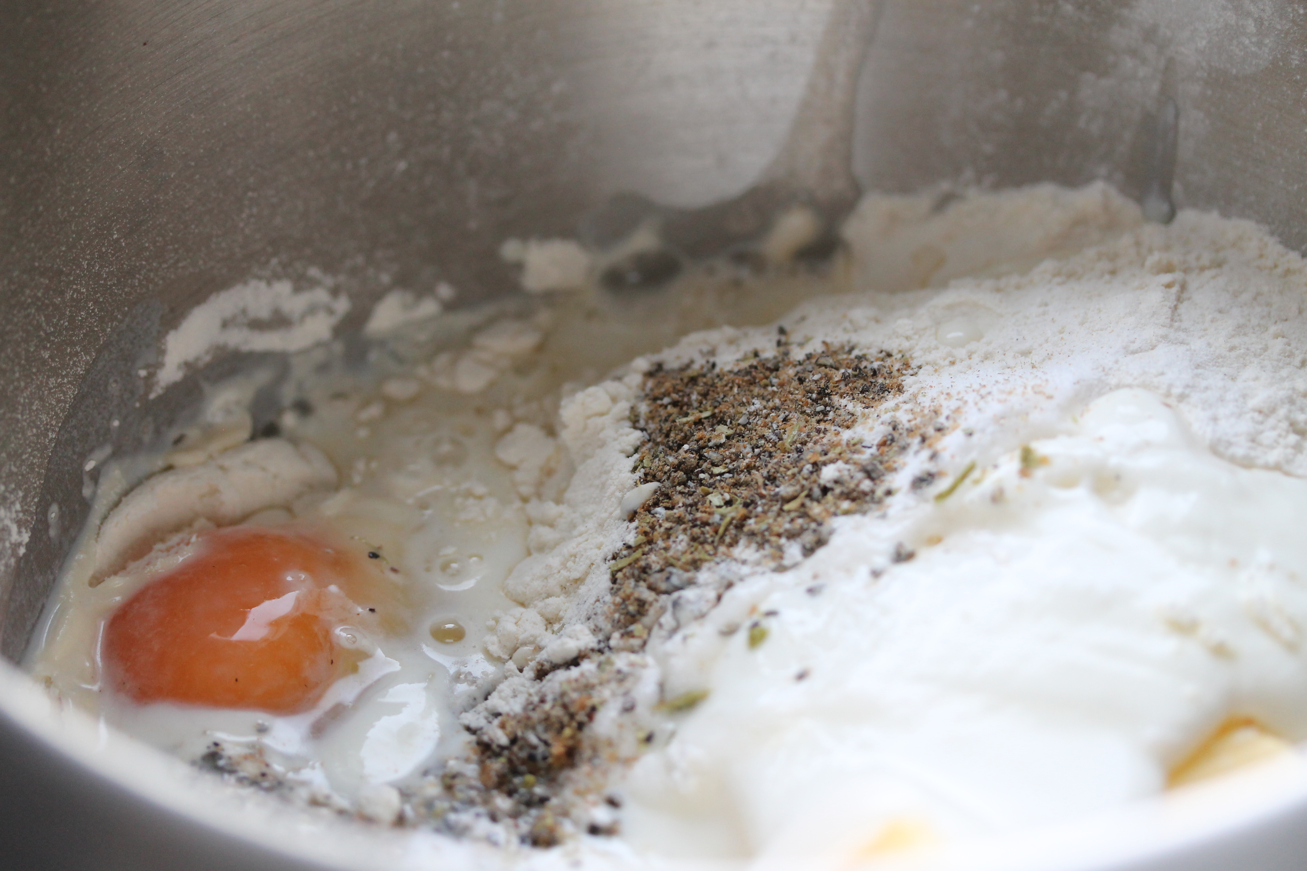 Svo setti ég þær í hrærivélarskálina ásamt 125 g af linu smjöri, 125 g af sykri, 175 ml af hreinni jógúrt, 50 ml af mjólk, 1 eggi, 475 g af hveiti (gæti þurft aðeins minna eða meira svo ég setti ekki alveg allt hveitið strax), 3 tsk af lyftidufti, 1/2 tsk af matarsóda og 1/4 tsk af salti. Hrærði þetta allt saman. (Ef smjörið er ekki mjög lint er kannski betra að byrja á að hræra saman smjör og sykur, bæta svo við eggi og síðan afganginum af hráefninu.)