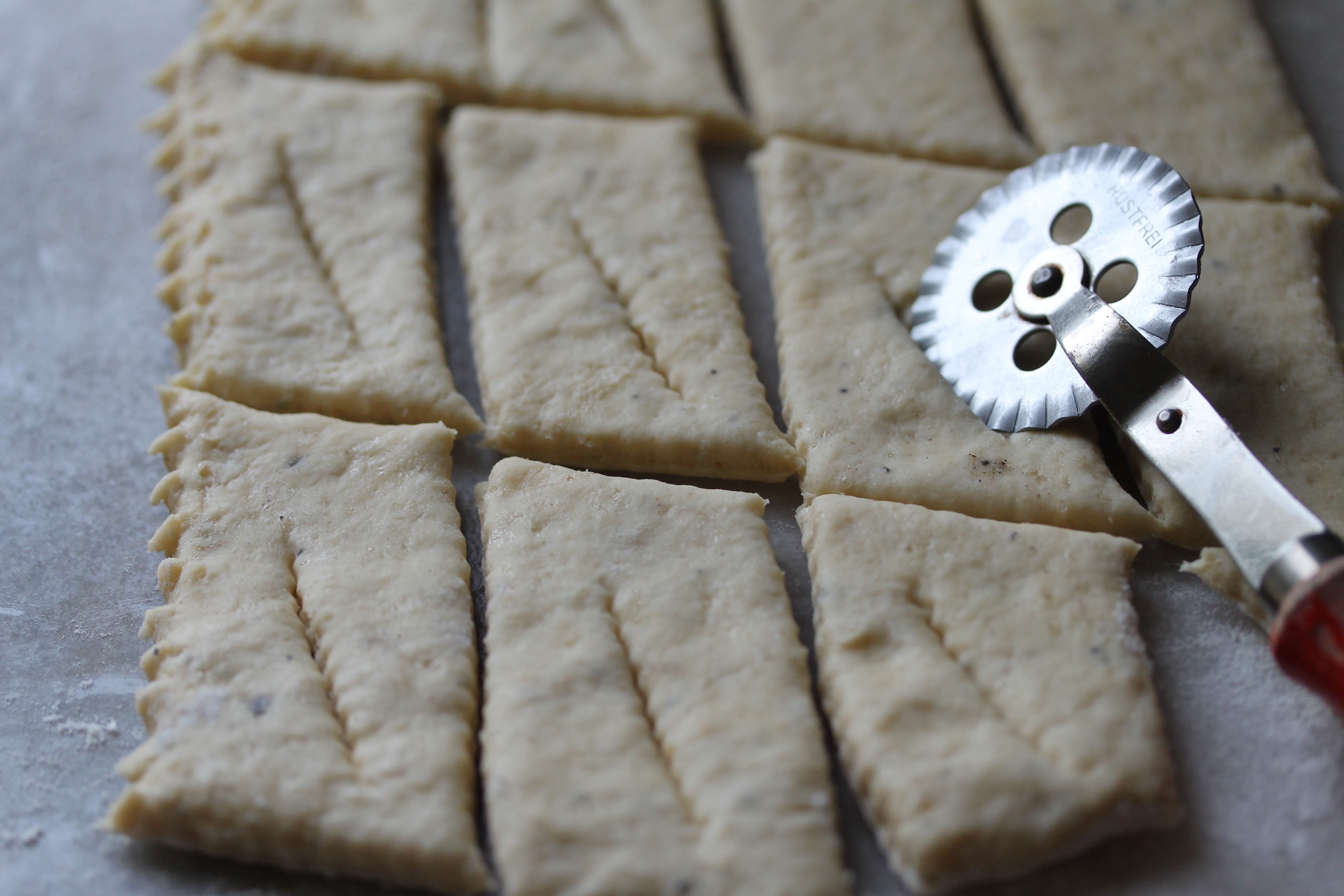 Svo að fyrir meirihlutann af kleinunum notaði ég hefðbundið kleinujárn, að vísu nokkurra áratuga gamalt. Skar deigið í ræmur, síðan í búta á ská og gerði loks skurð á ská í miðjuna á hverjum bút.