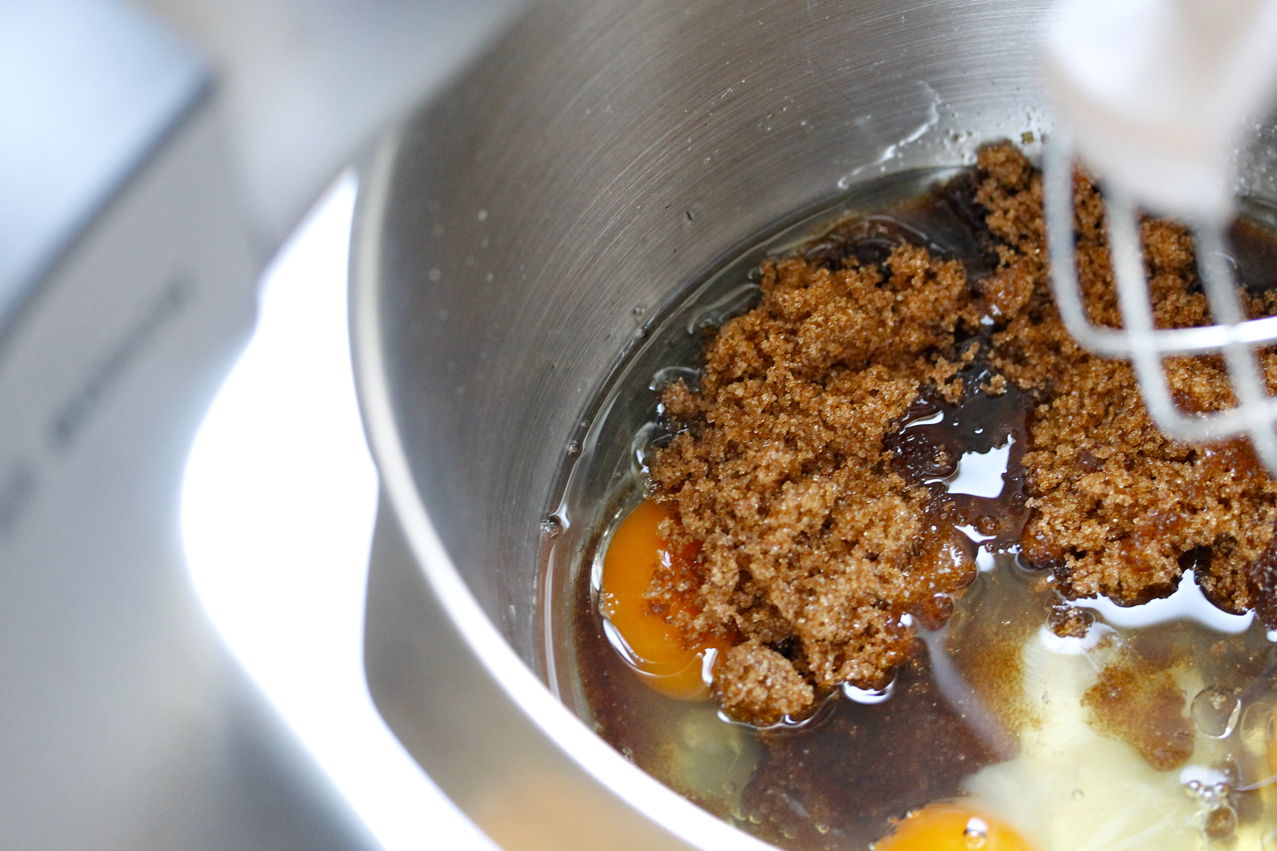 Ég byrjaði á að stilla ofninn á 165°C og rífa gulræturnar fremur fínt. Svo setti ég egg, olíu og púðursykur í hrærivélarskál og þeytti þetta vel saman.