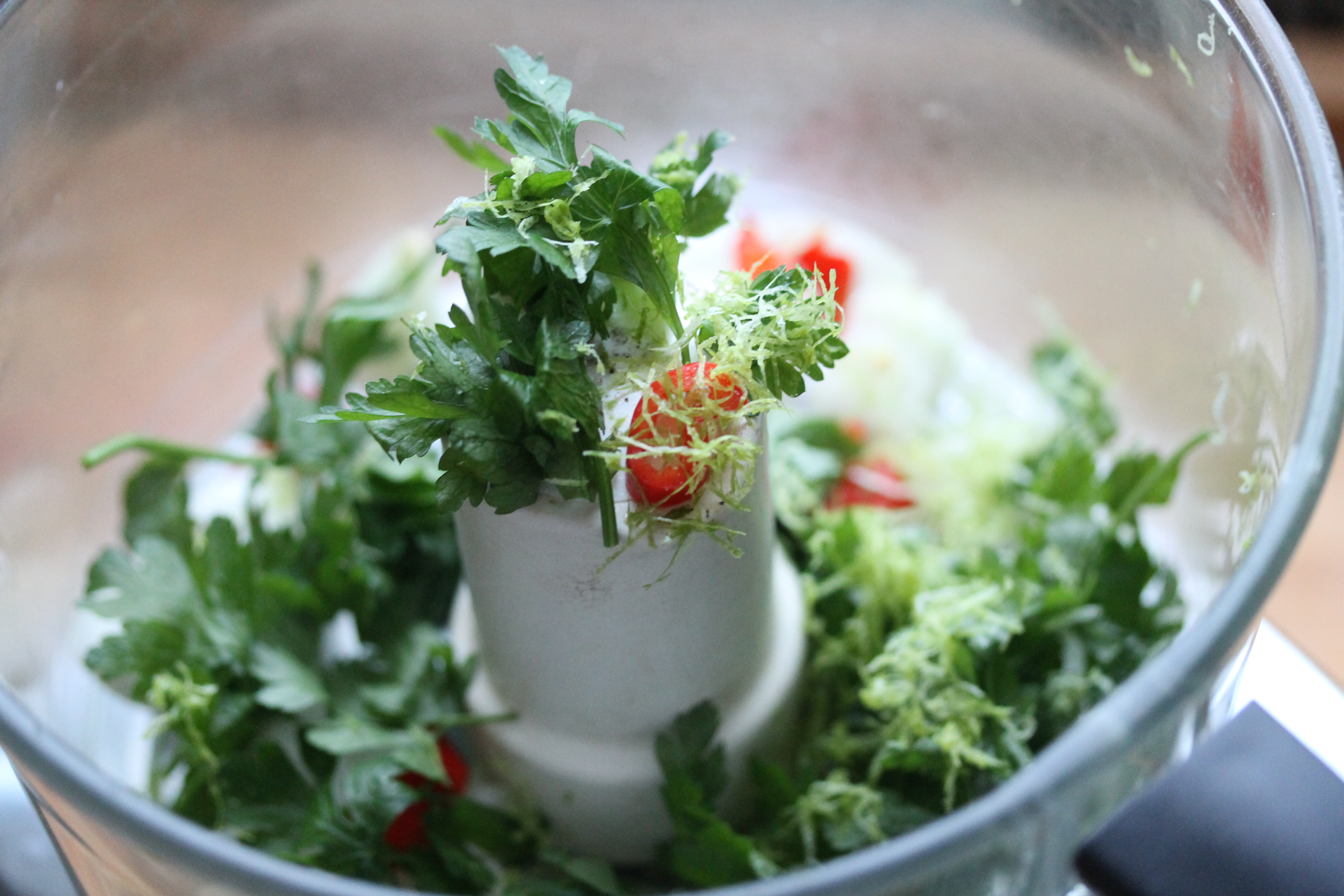 Ég byrjaði á að saxa laukinn gróft og fræhreinsa chilialdinið og saxa það. Setti þetta í matvinnsluvélina ásmat steinseljunni, reif börkinn af límónunni yfir og lét vélina mauka þetta saman.