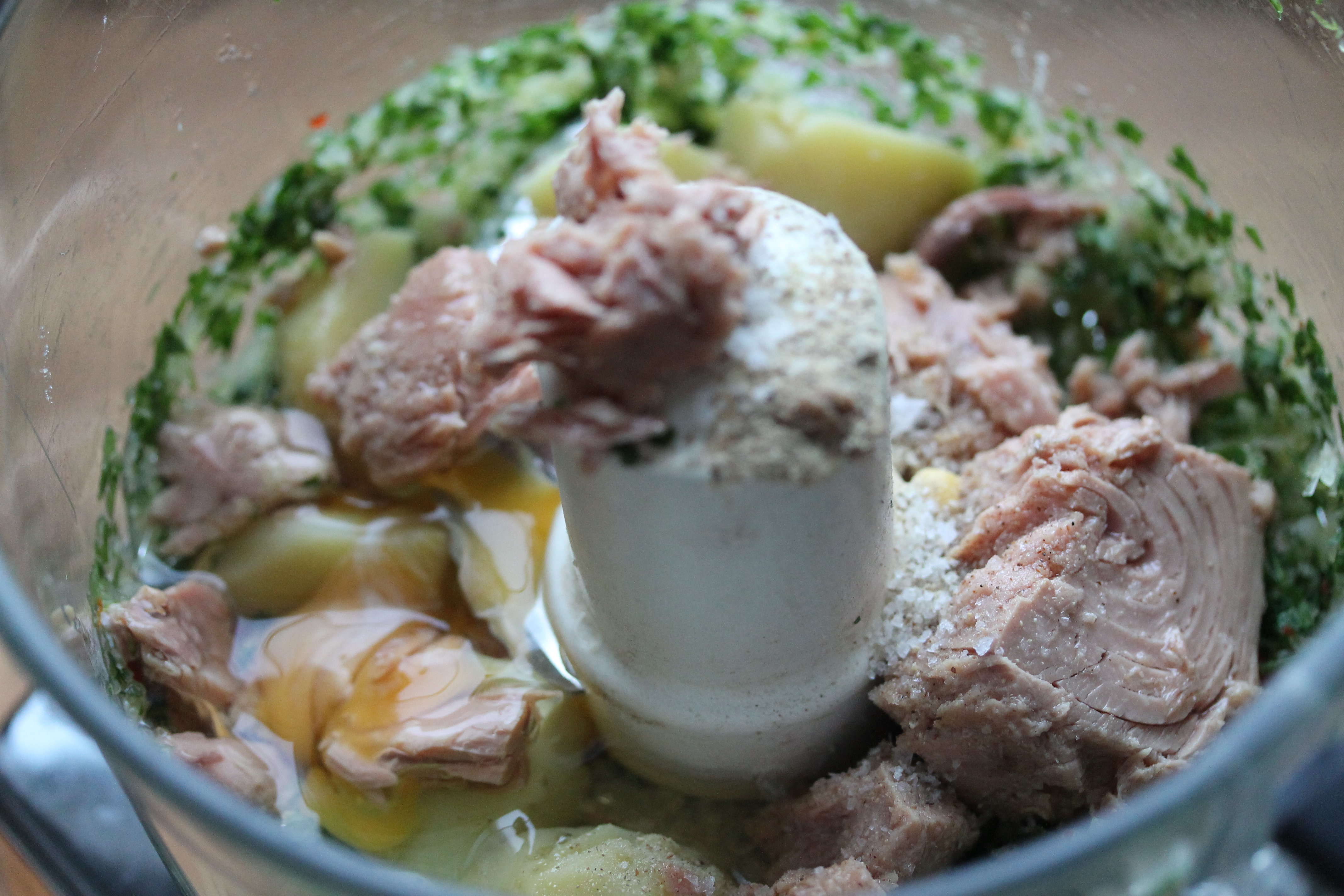 Ég hellti olíunni af túnfiskinum (það má nota hana til að steikja úr en ég geri það þó yfirleitt ekki) og flysjaði soðnu kartöfluna og skar hana í bita. Setti túnfisk og kartöflu í matvinnsluvélina ásamt eggi, pipar og salti og maukaði vel saman.