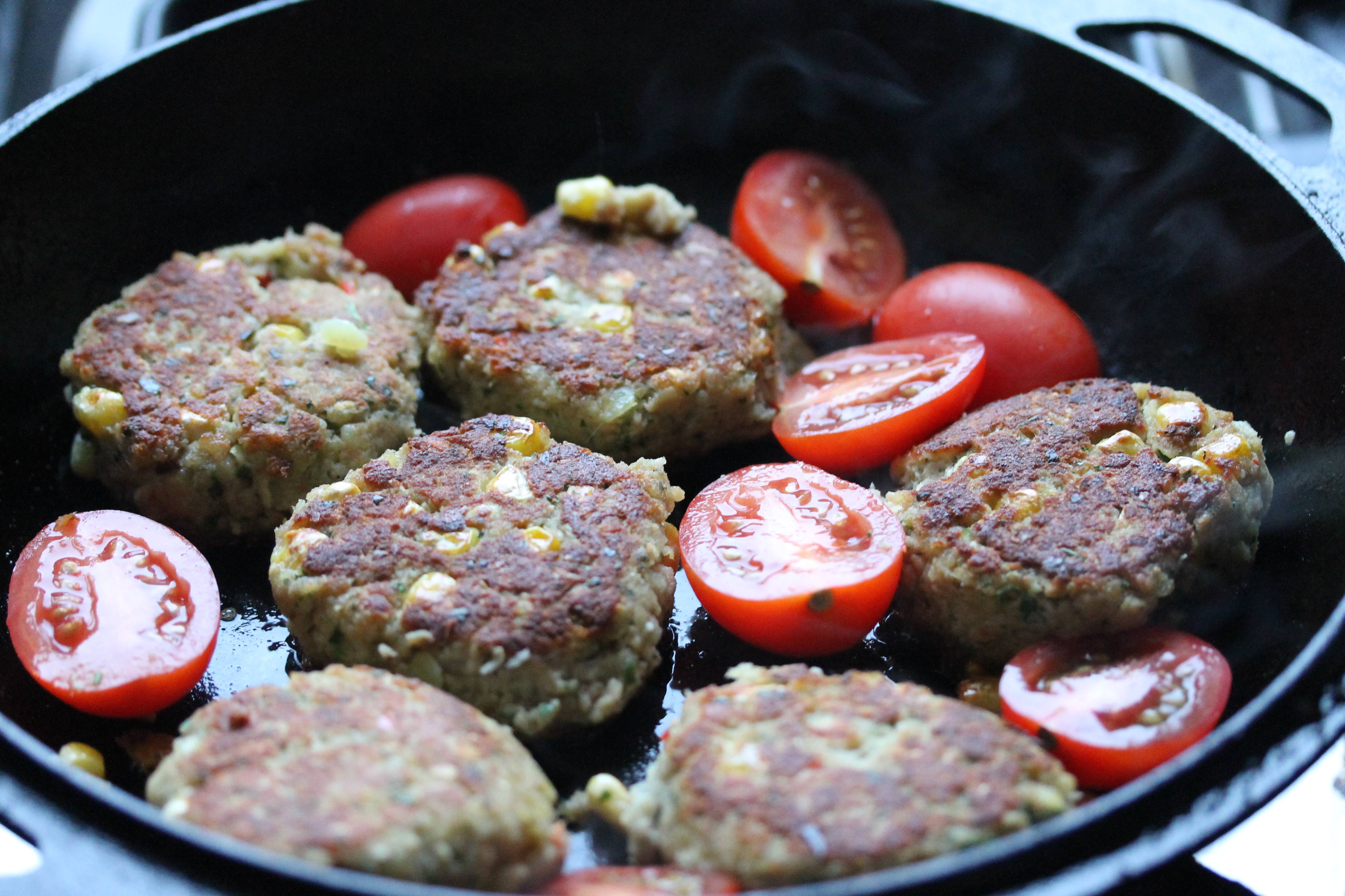 Ég steikti buffin við meðalhita þar til þau voru fallega brún á báðum hliðum og heit í gegn. Skar kokkteiltómatana í tvennt (stærri tómata í báta) og setti á pönnuna þegar ég var búin að snúa buffunum. Ég tók svo buffin af pönnunni þegar þau eru tilbúin og hélt þeim heitum en steikti tómatana ögn lengur, þar til þeir voru vel meyrir.