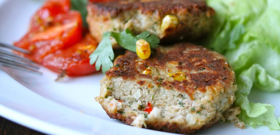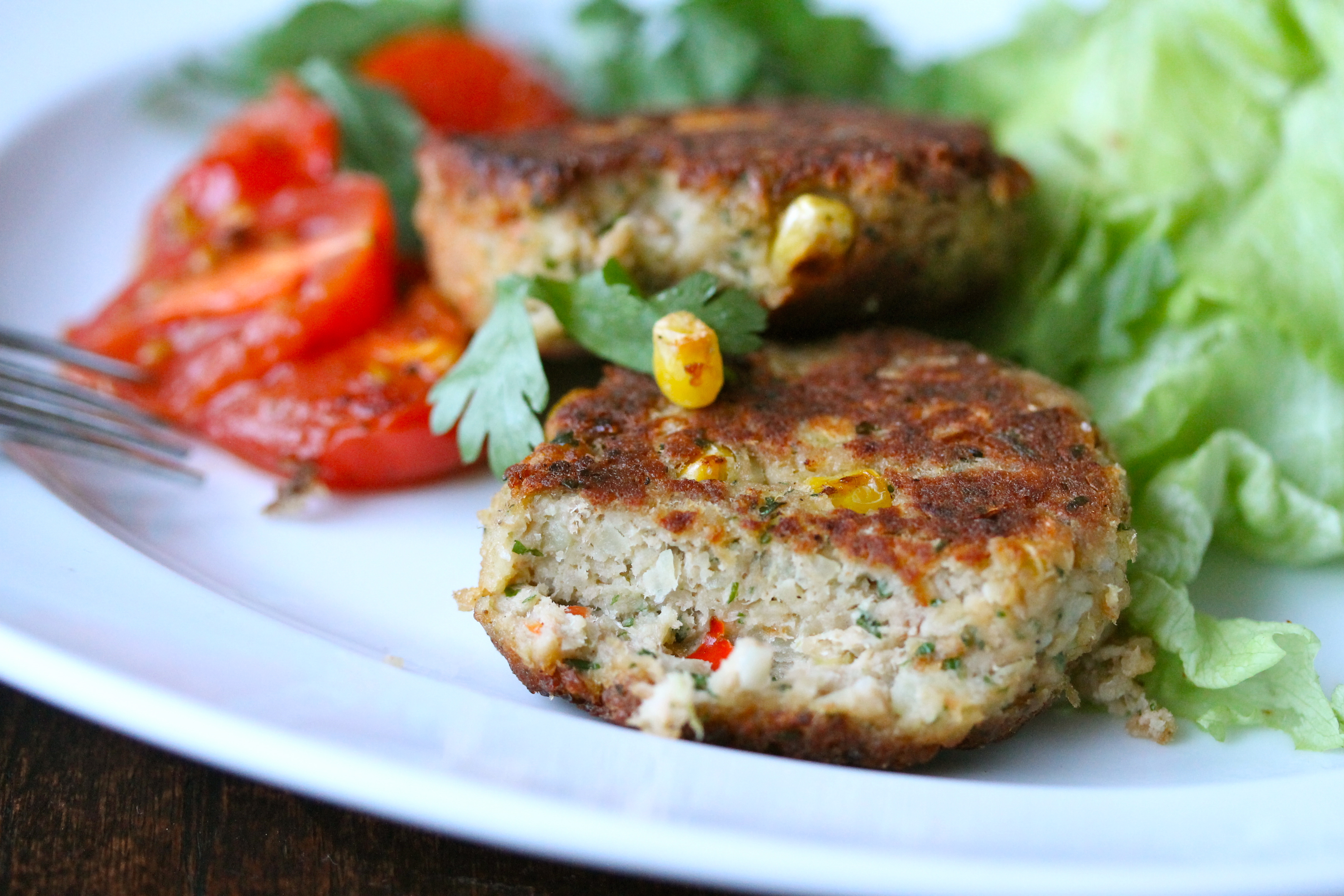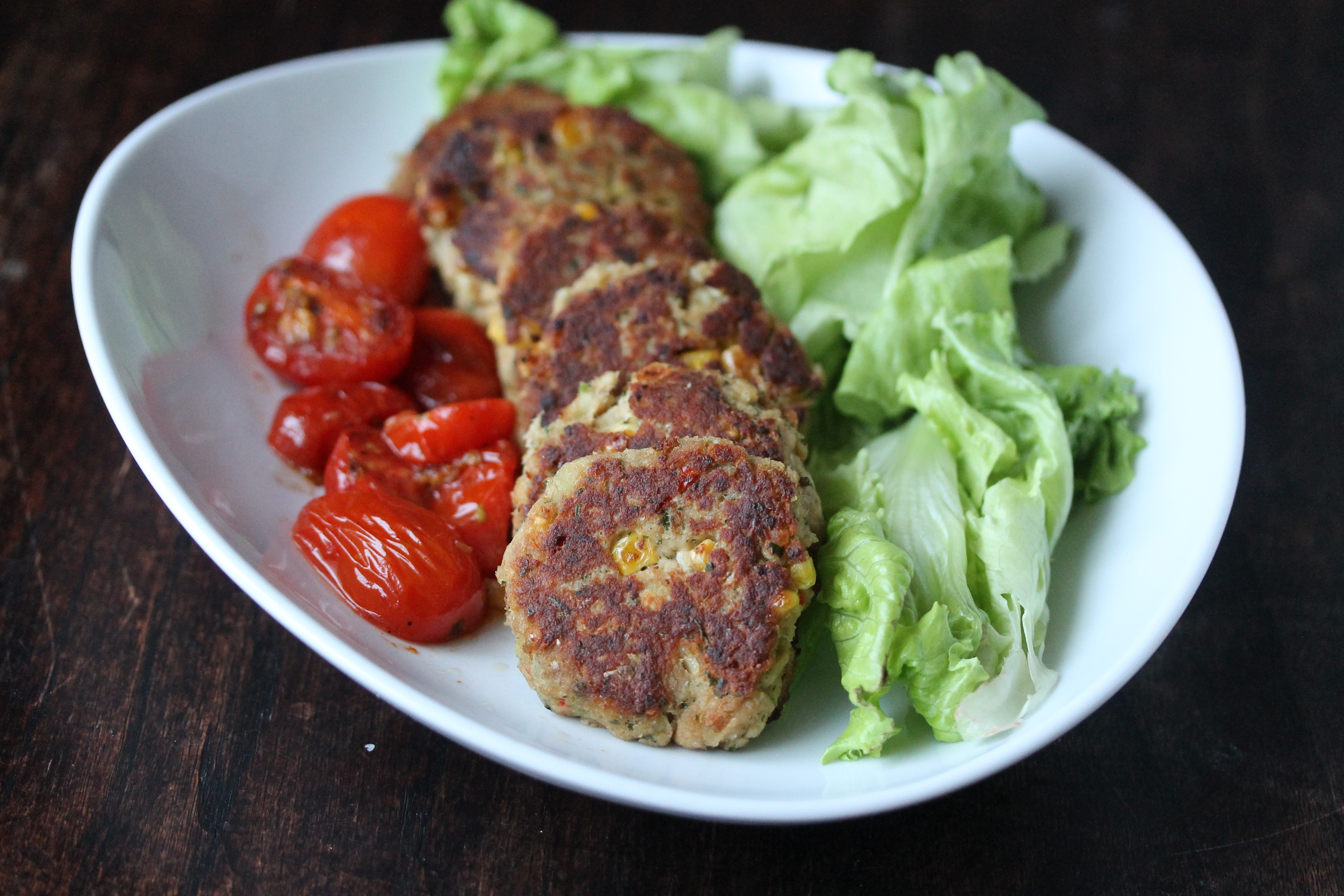 Þetta eru semsagt túnfiskbuff og ég notaði eina dós af túnfiski (í olíu; það má alveg nota túnfisk í vatni en mér þykir sá í olíunni betri). Svo átti ég til 1 lauk, 1 sæmilega stóra soðna kartöflu, ½ rautt chilialdin, 1 egg, lófafylli af steinselju (en það má alltsvo sleppa henni), 1 límónu (má líka nota 1/2 sítrónu), pipar, salt, 100 ml af raspi (ég notaði panko, er með dellu fyrir því þessa dagana, en það má bara nota venjulegt þurrt brauðrasp), 4-5 msk af maískornum (ég notaði frosinn maís sem ég á nú oftast til en það má líka nota niðursoðinn) og svo átti ég til 200 g af kokkteiltómötum sem ekki eru á myndinni; þeir eru reyndar eiginlega meðlæti og það má alveg nota venjulega tómata – þurfa að vera vel þroskaðir – eða bara eitthvað annað grænmeti. Eða sleppa því.