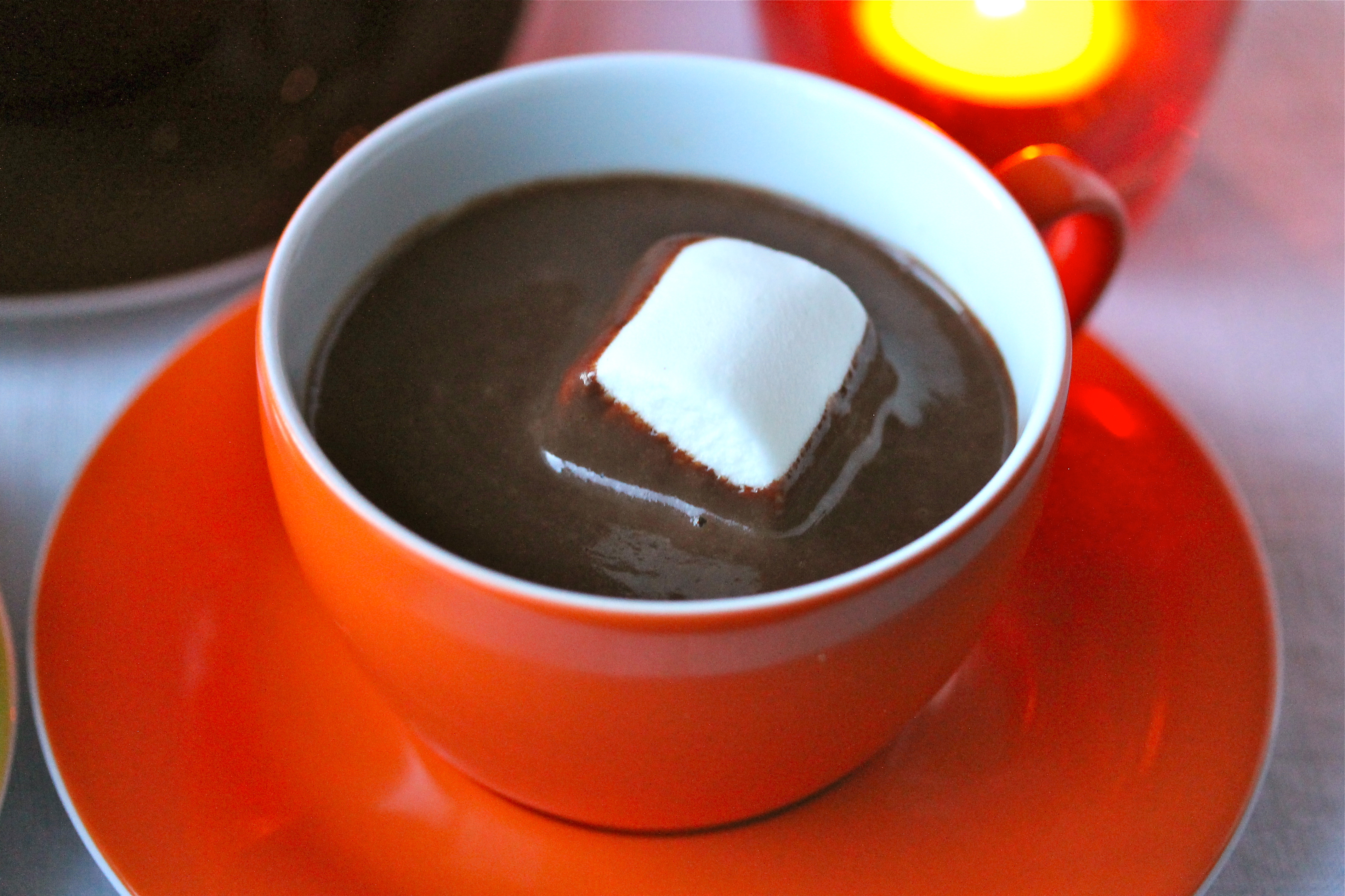 Ég gerði þrjá heita súkkulaðidrykki fyrir jólablað MAN, hinar voru komnar áður og eru hér og hér. Svo að það er best að þessi komi líka. Þetta er þykkt og sætt súkkulaði sem minnir dálítið á spænskt eða ítalskt súkkulaði. Eins og heitur, fljótandi súkkulaðibúðingur. Ég setti bara sykurpúða út í en það er líka tilvalið að dýfa í þetta fingurkexi eða einhverju slíku.