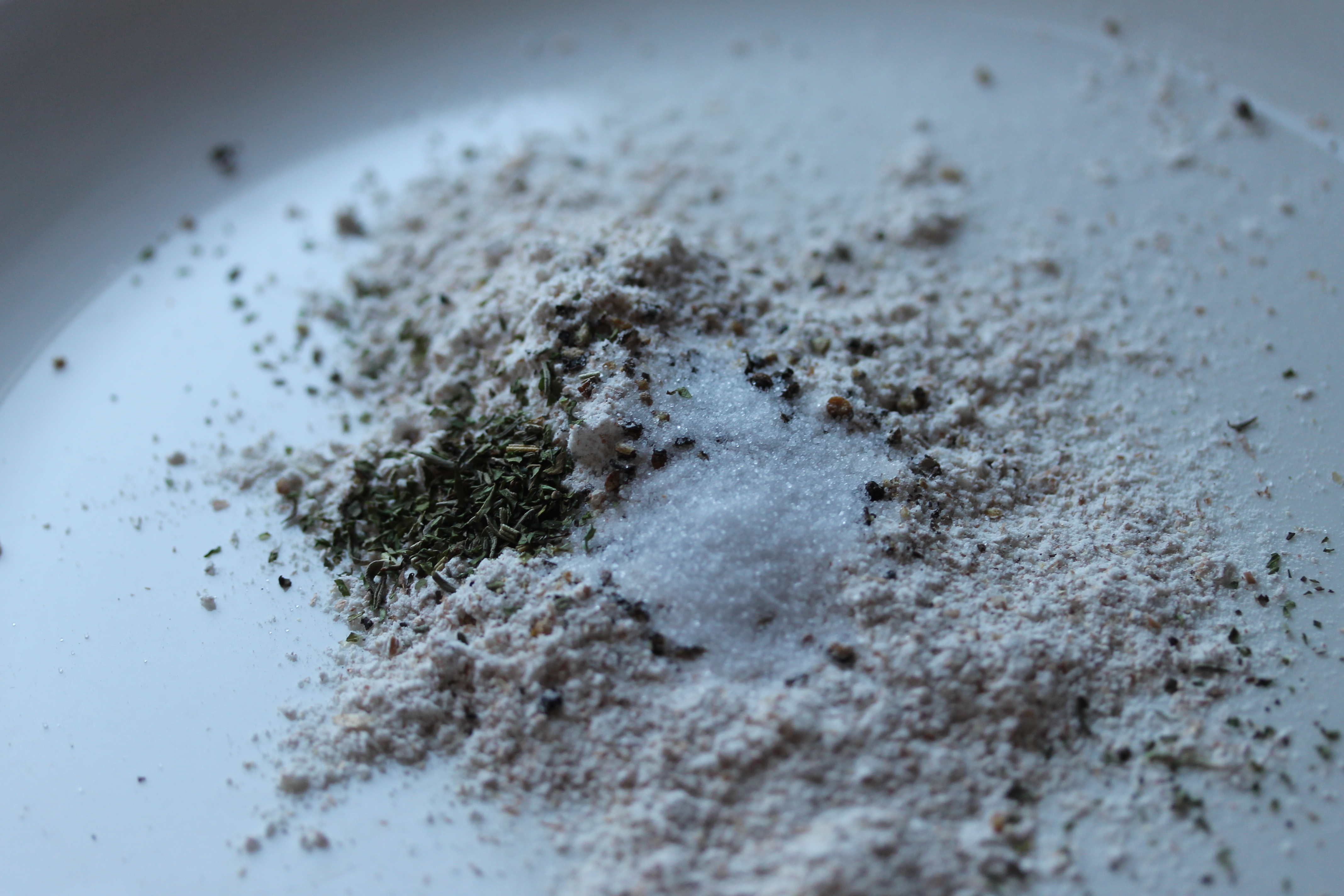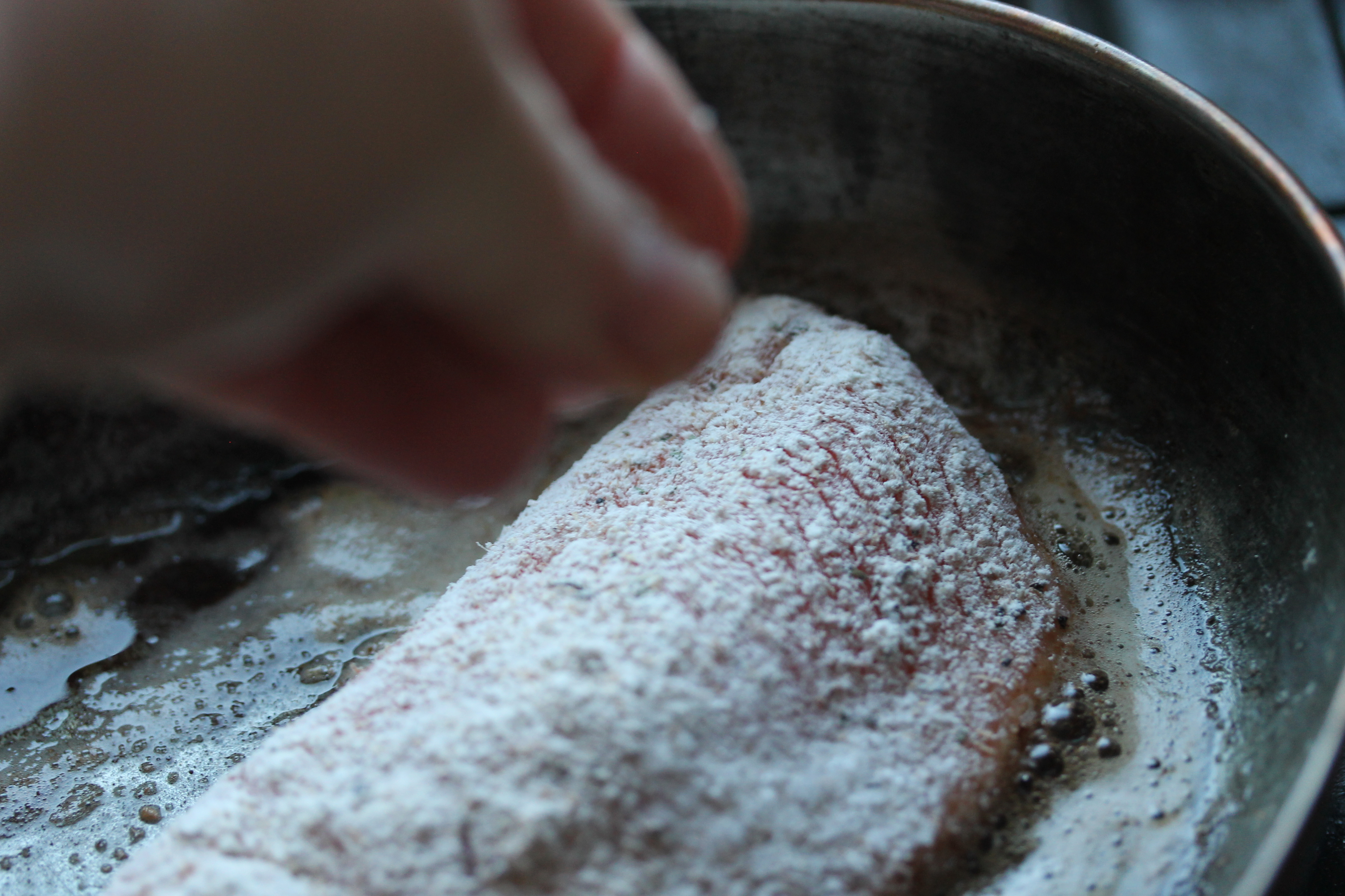 Ég var með þrjú bleikjuflök, svona 200 grömm hvert. Og til að vega upp óhollustuna af sykrinum ákvað ég að nota heilhveiti til að velta þeim upp úr. Það er hollusta, nema maður sé í glútenóvinafélaginu. Sem ég er ekki. Svo ég blandaði saman 3 msk af heilhveiti (eða hveiti), 1/2 tsk af salti, 1/4 tsk af pipar og 1/4 tsk af timjani. Hefði notað 1/2 teskeið af þurrkuðu blóðbergi í staðinn, ef ég hefði átt það.