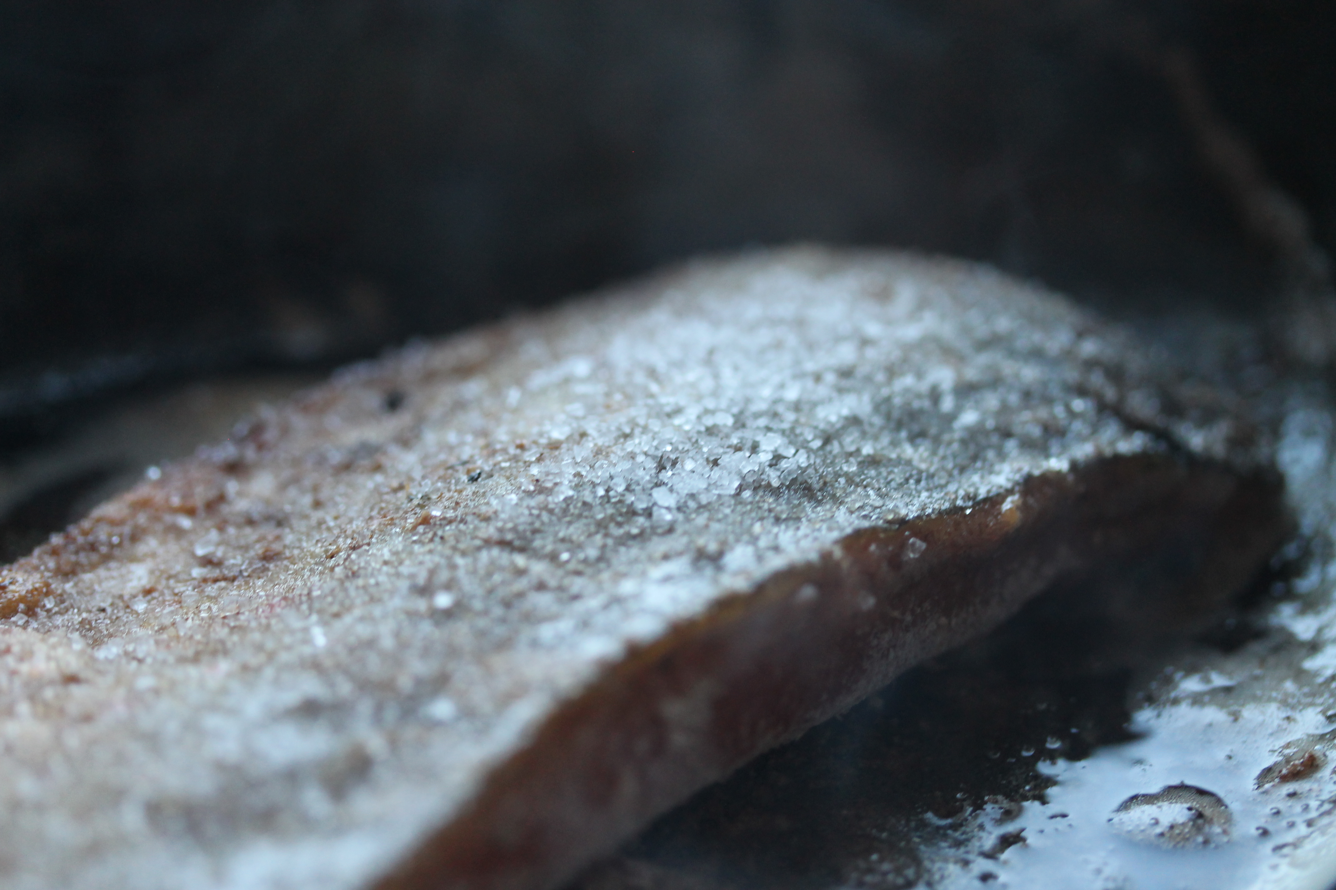 Ég steikti flökin í eina til tvær mínútur við fremur háan hita, sneri þeim þá (notaði pönnukökuspaða), stráði líka sykri á roðhliðina og steikti áfram í eina til tvær mínútur. Þá sneri ég þeim aftur, lækkaði hitann og lét krauma áfram í tvær til þrjár mínútur, þar til bleikjan var rétt steikt í gegn og roðið dökkgullinbrúnt og stökkt.