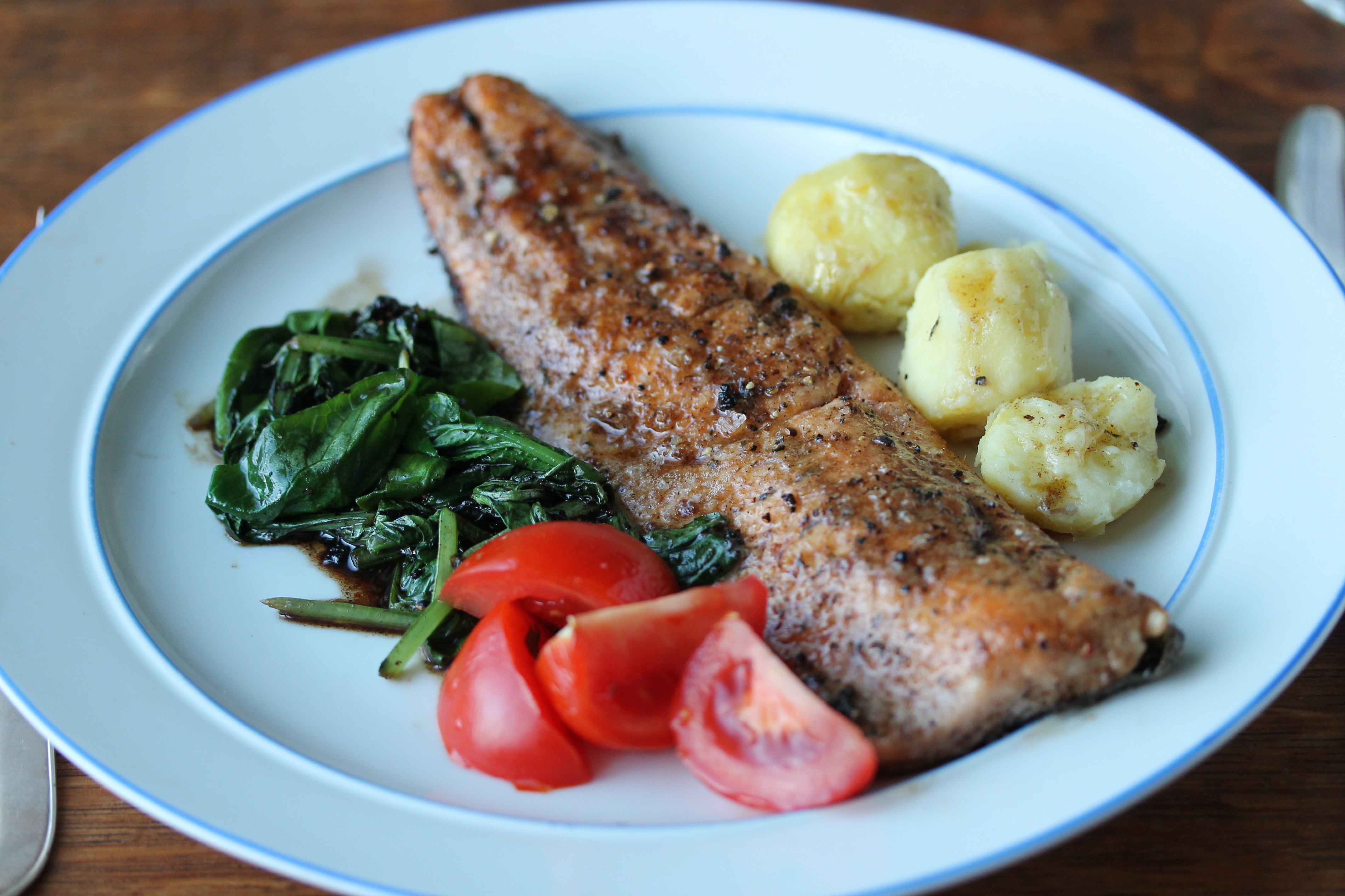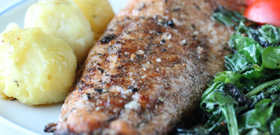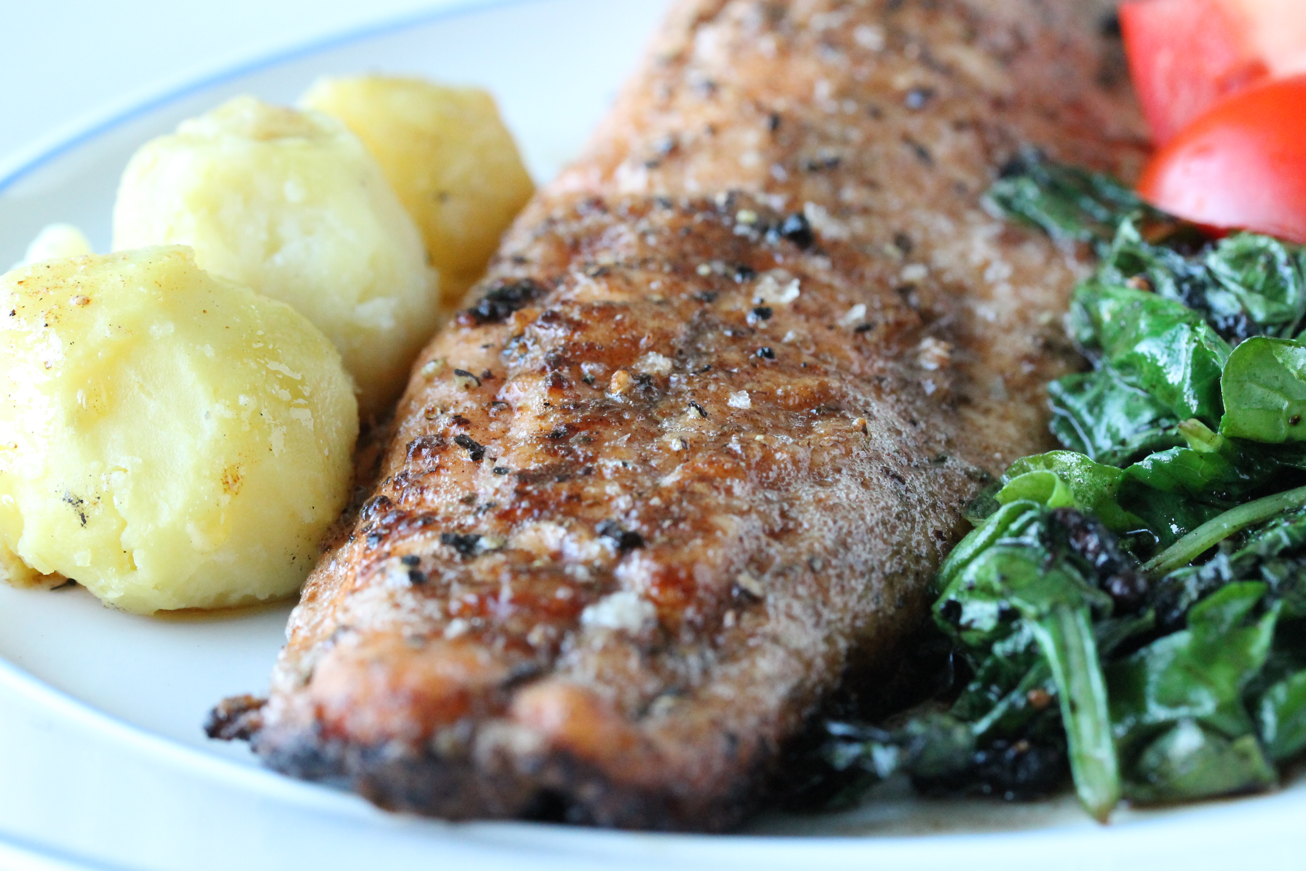Þá færði ég flökin yfir á fat, bætti 1 msk af smjöri á pönnuna, setti svona 300 g af spínati á hana (var búin að klípa/skera flesta stönglana af því), steikti í eina eða tvær mínútur og hrærði stöðugt á meðan. Bar svo spínatið fram með silungnum, ásamt soðnum kartöflum og tómötum.