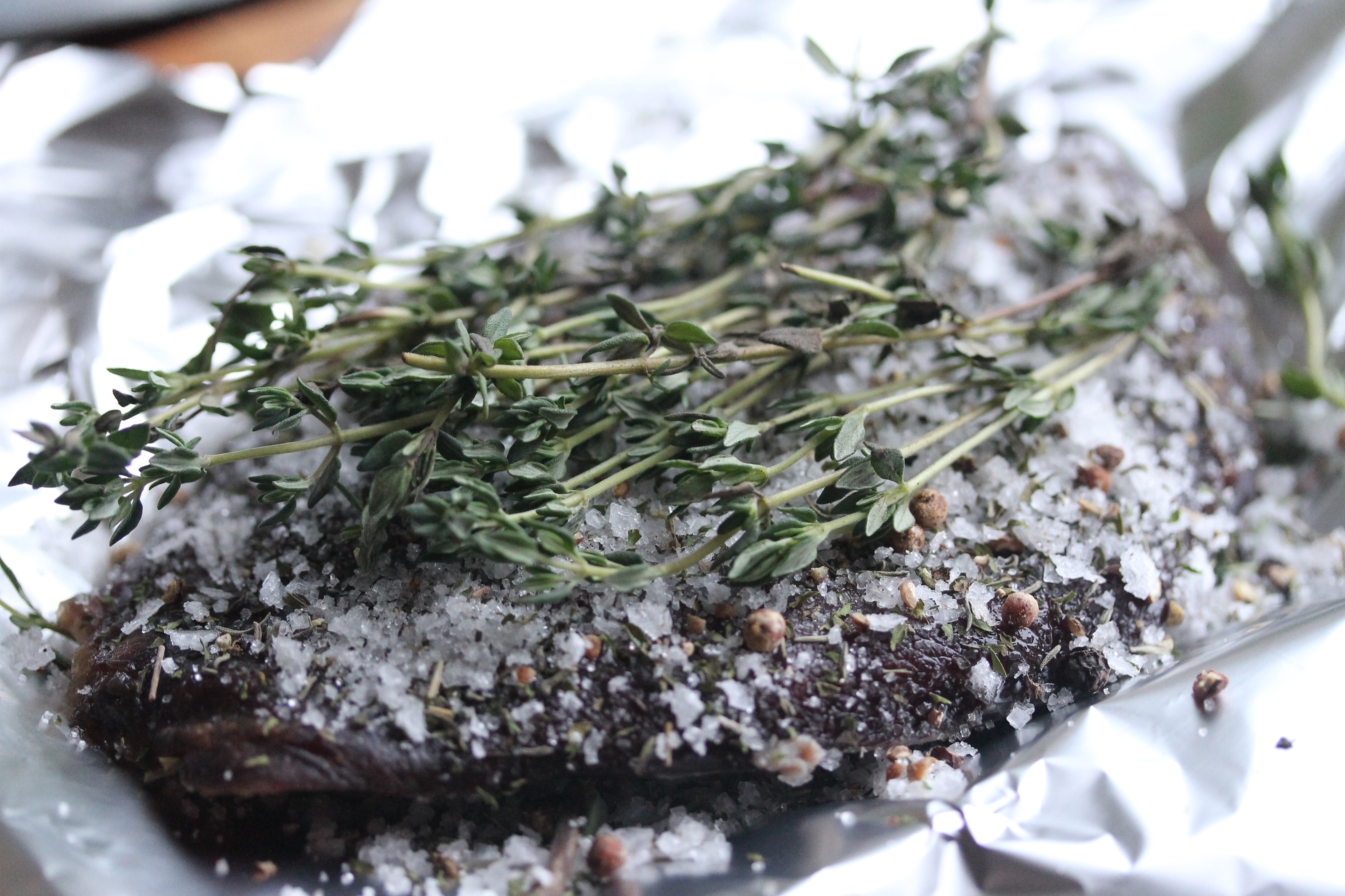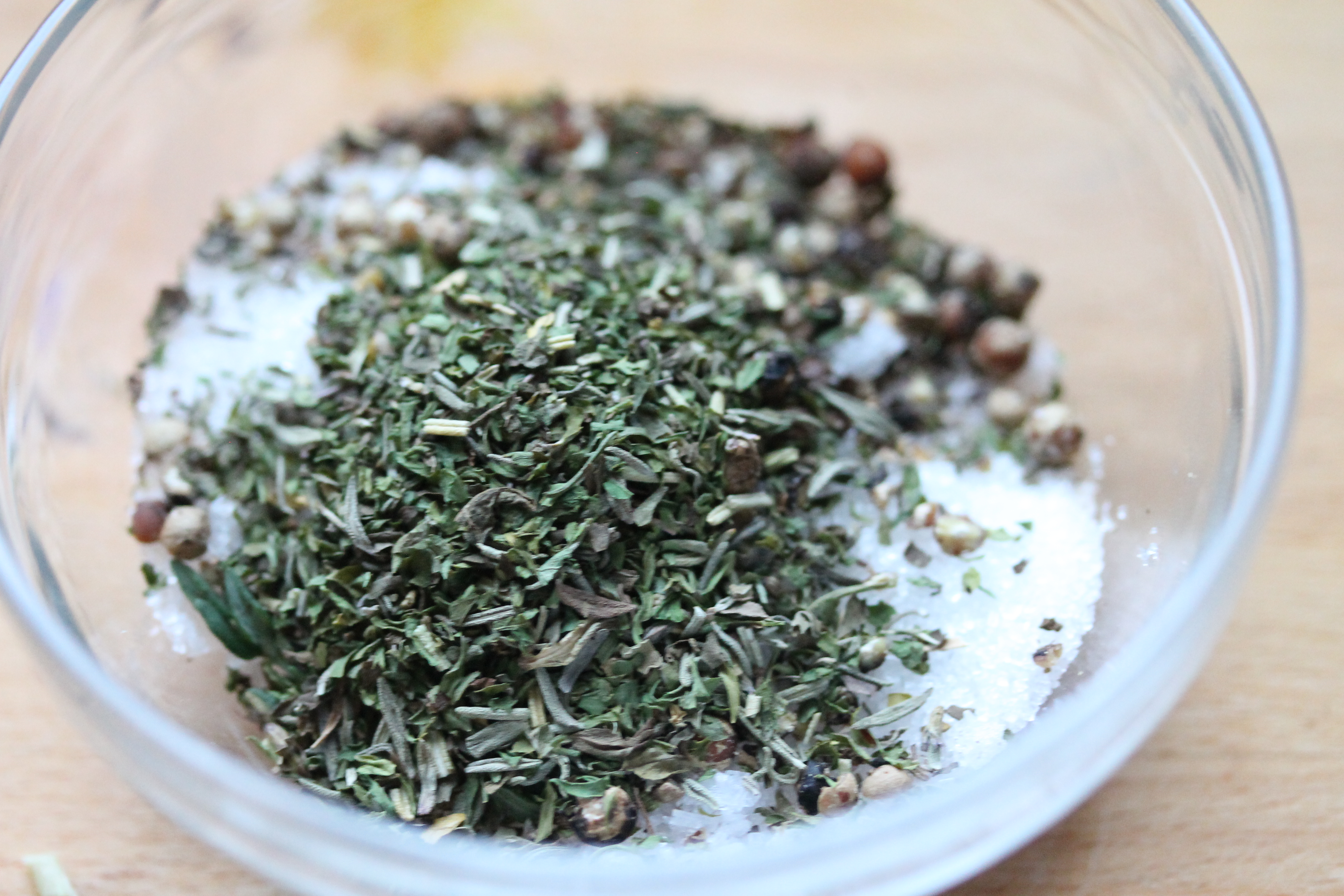 Þá var komið að því að útbúa kryddblönduna sem ég ætlaði að nota. Ég blandaði saman 2 msk af flögusalti (ég var með íslenskt salt en man ómögulega hvort það var frá Saltverki eða Norðursalti), 1 msk af sykri, 1 tsk af grófsteyttum piparkornum, 1/2 tsk af grófsteyttum kóríanderfræjum (má sleppa) og 1 tsk af blönduðum þurrkuðum kryddjurtum – ég notaði herbes de Provence. En annars má nota hvaða kryddjurtir sem manni dettur í hug, til dæmis blóðberg, timjan, rósmarín eða óreganó, og svo líka einiber, dill- eða fennikufræ og rósapipar, sem skreytir bringurnar töluvert.