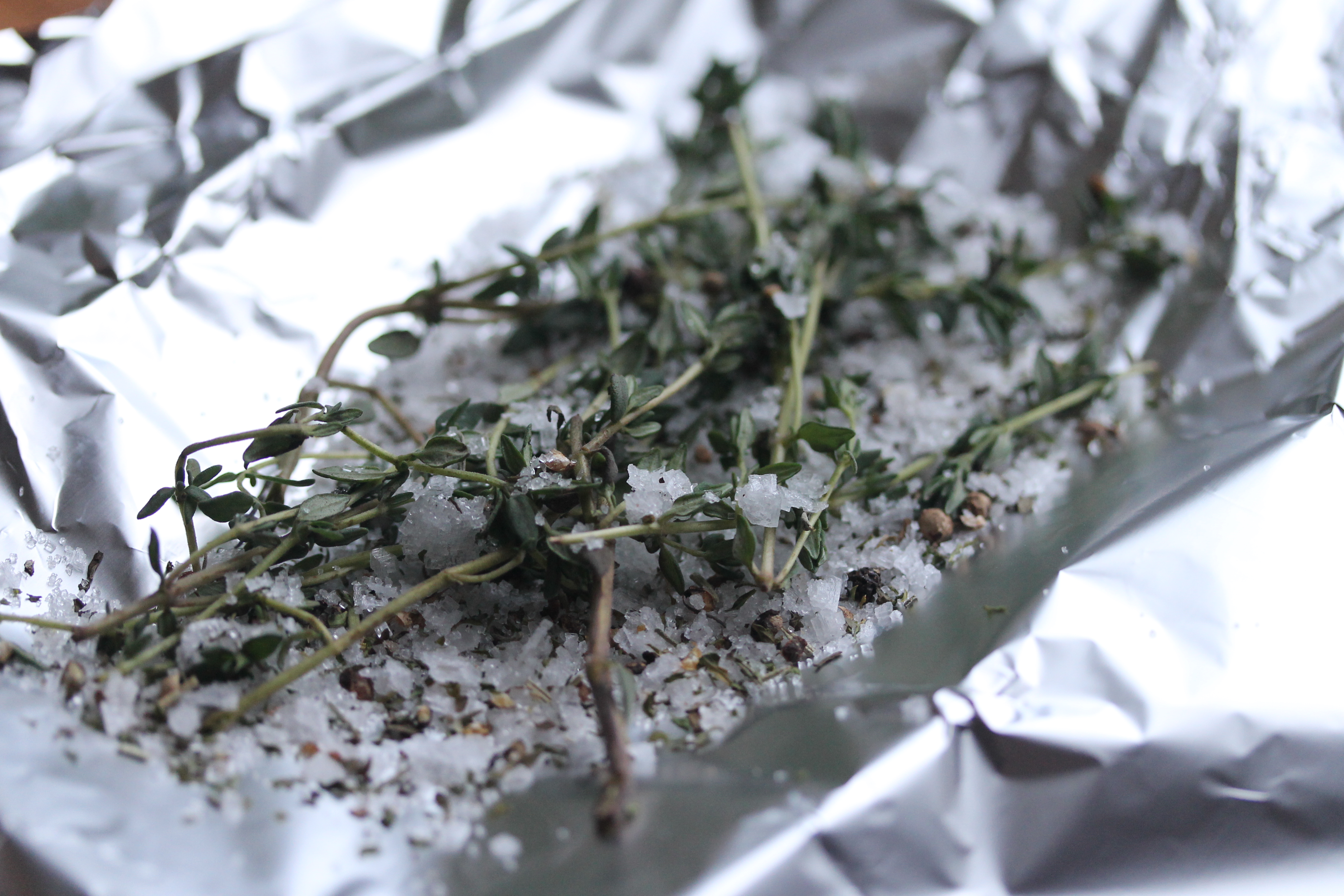 Ég lagði nokkrar ferskar timjangreinar á álpappírsörk (reyndar er betra að nota plastfilmu en hún var búin) og stráði helmingnum af kryddblöndunni yfir.
