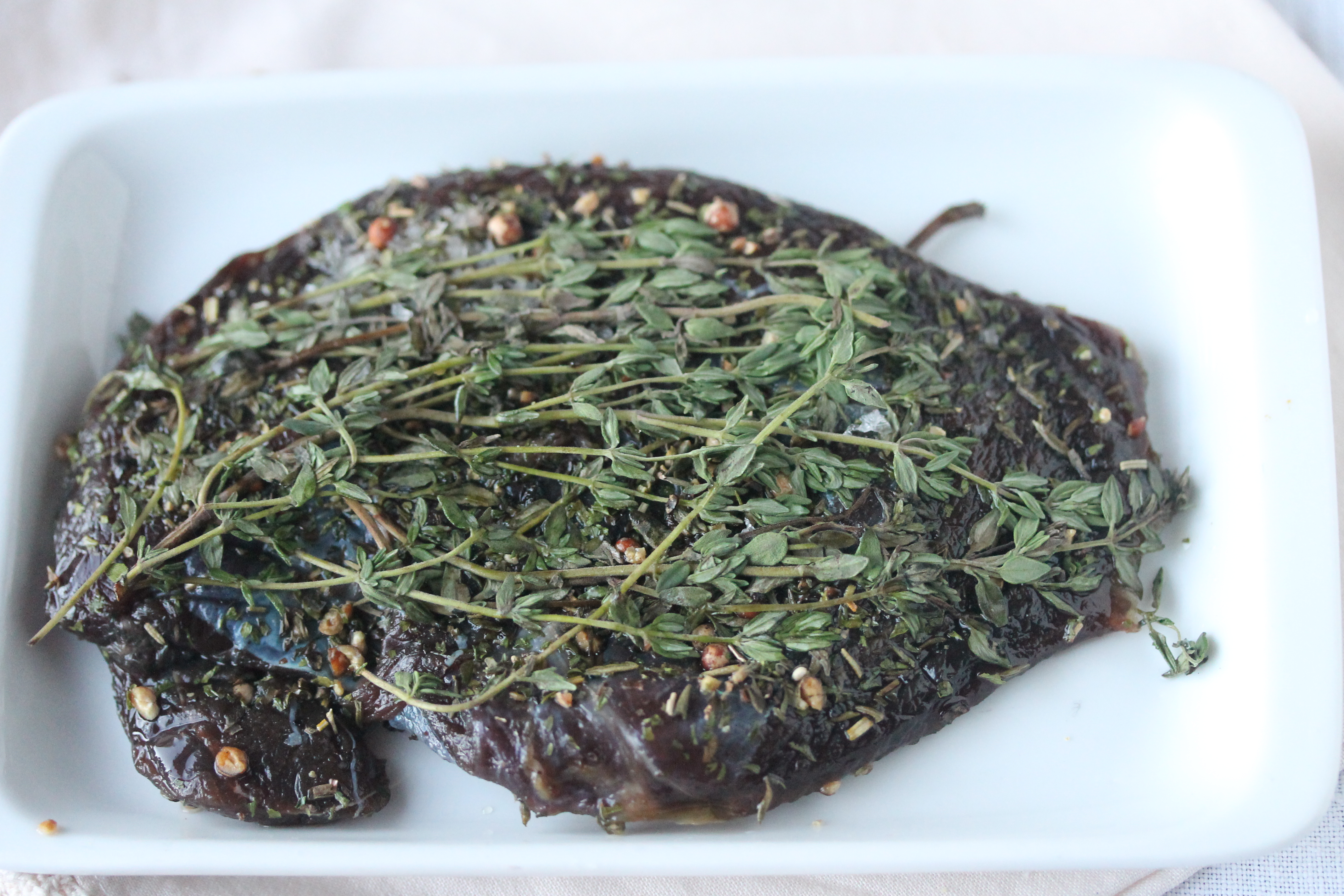 Lagði nokkrar timjangreinar efst, vafði álpappírnum utan um bringuna, setti hana í kæli og hafði létt farg ofan á.
