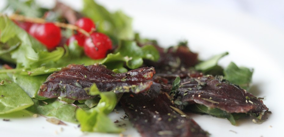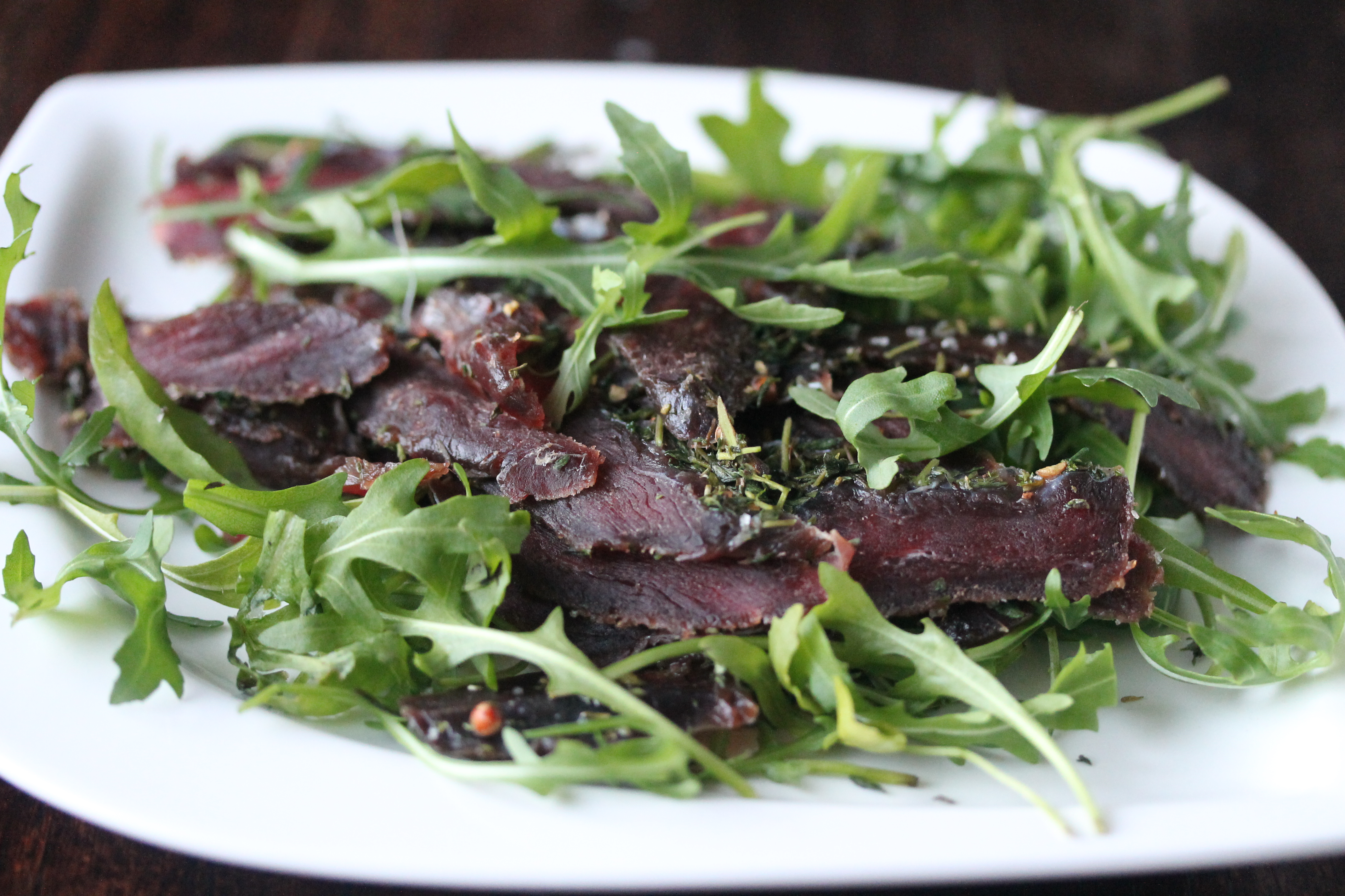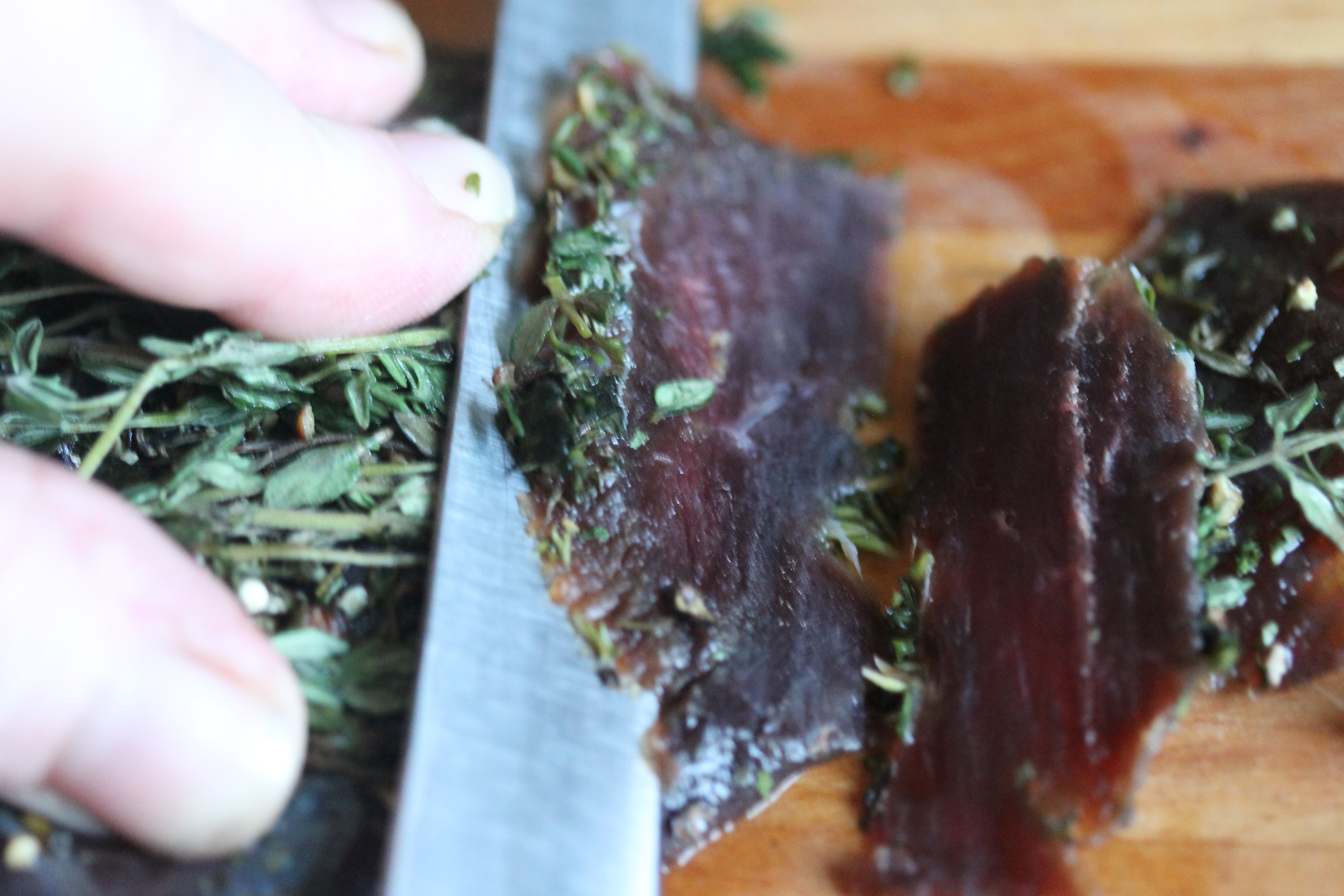 Í þetta skipti vildi ég hafa saltið og kryddið með svo ég tók bringuna bara, setti hana á bretti og skar hana í þunnar sneiðar á ská. En það má líka strjúka mestallt kryddið af áður en hún er skorin niður.