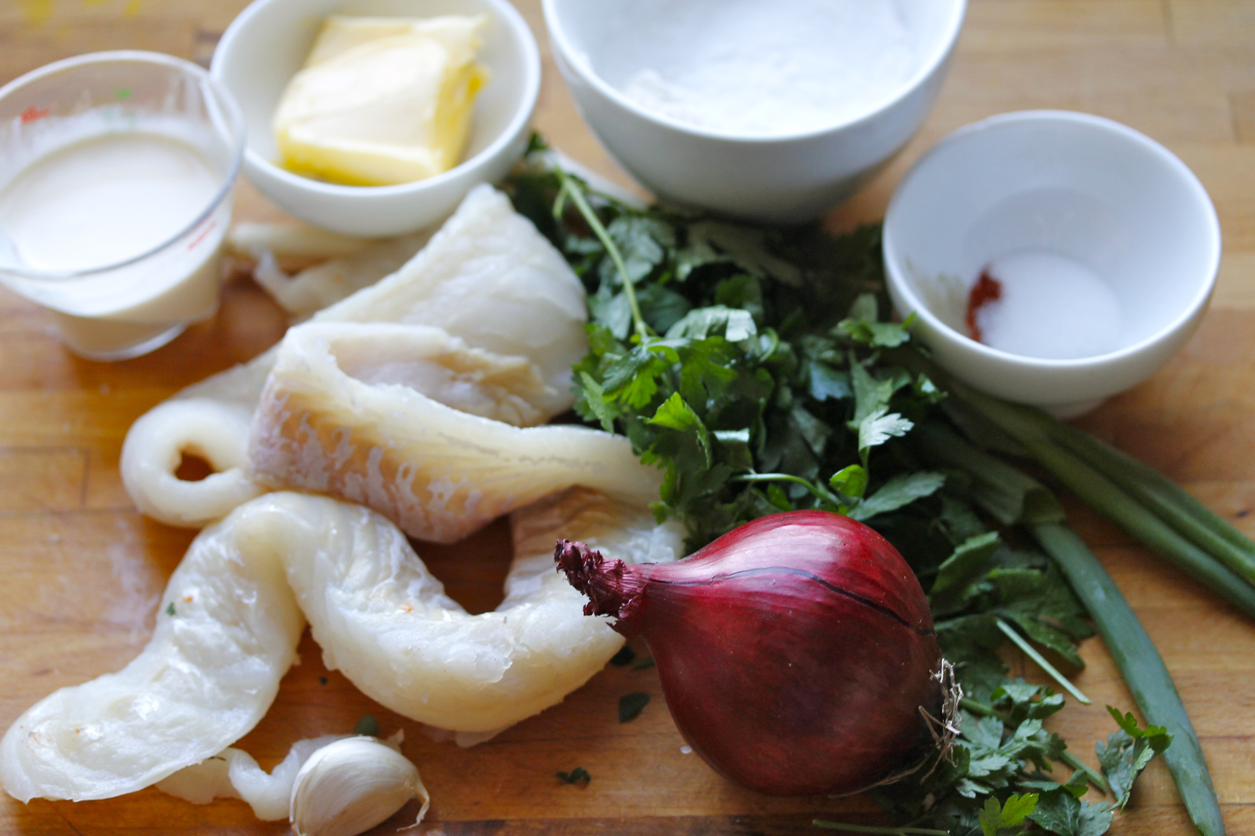 Þetta lönguflak stóð alveg undir nafni – þrátt fyrir lengdina (og ég var búin að taka bita af því og elda) var það ekki nema tæp 400 grömm. En það dugir alveg í bollur handa þremur til fjórum. Svo notaði ég einn rauðlauk af því að ég átti ekki venjulegan (það er reyndar mjög algengt, þarf að fara að gera eitthvað í því), hvítlauksgeira, 3 msk af rjóma (má alveg vera mjólk), svona 25 g af linu smjöri, 3 1/2 msk af kartöflumjöli, 2 msk af hveiti, pipar, salt, cayennepipar á hnífsoddi, tvo vorlauka og lófafylli af steinselju (hvorutveggja má sleppa ef maður á það ekki til).