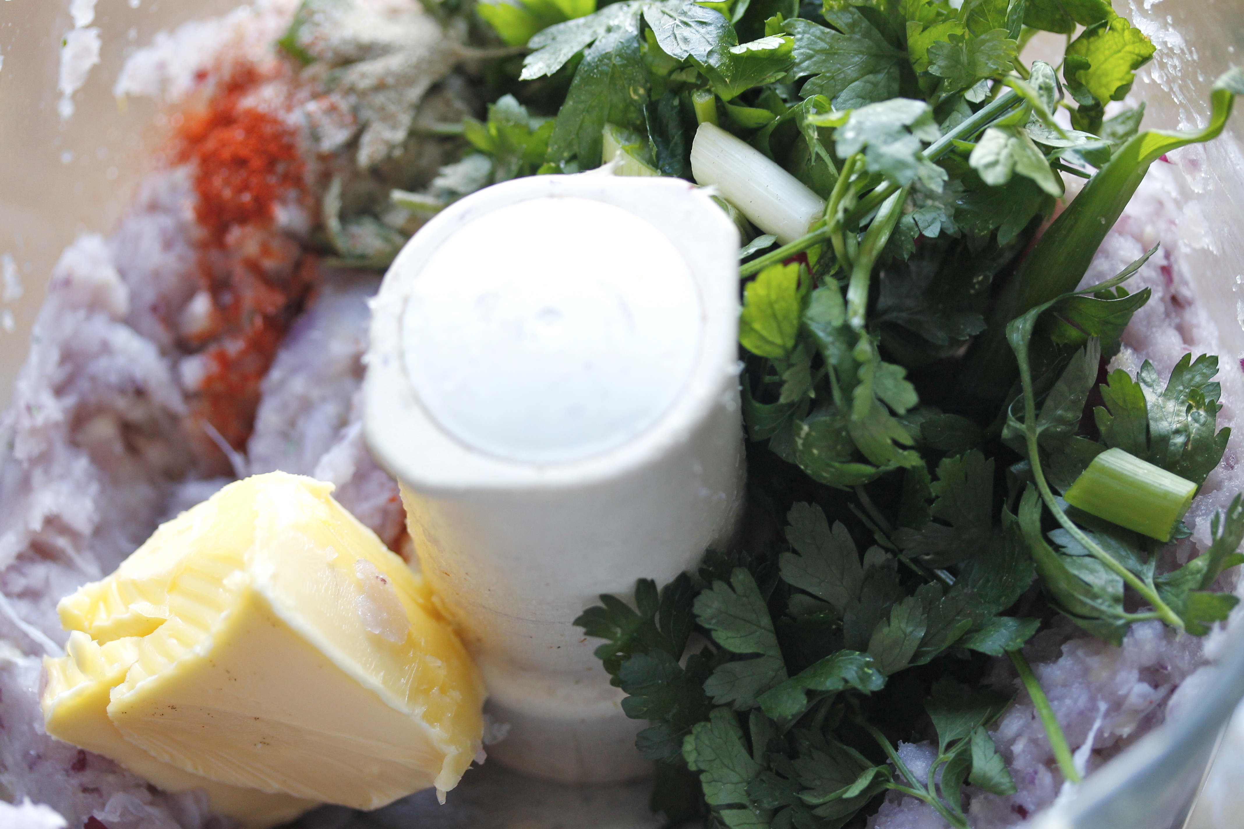 Svo setti ég kryddið, kryddjurtirnar og smjörið út í og lét vélina ganga áfram og mauka þetta saman við.