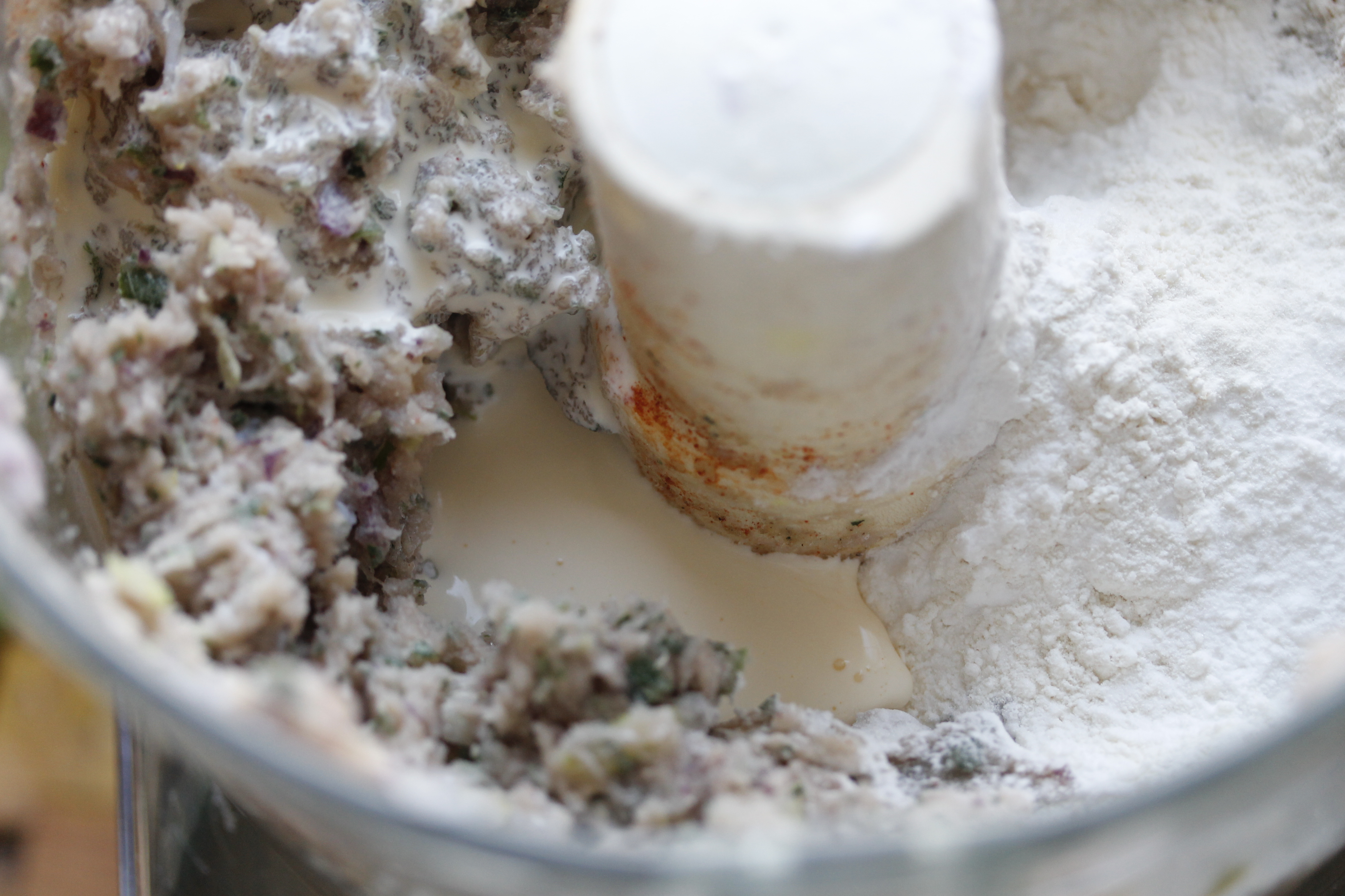 Svo setti ég hveiti, kartöflumjöl og mjólk út í og lét vélina ganga rétt eins og þurfti til að blanda þessu saman (notaði púlshnappinn) – ef farsið er hrært of mikið geta bollurnar orðið seigar.
