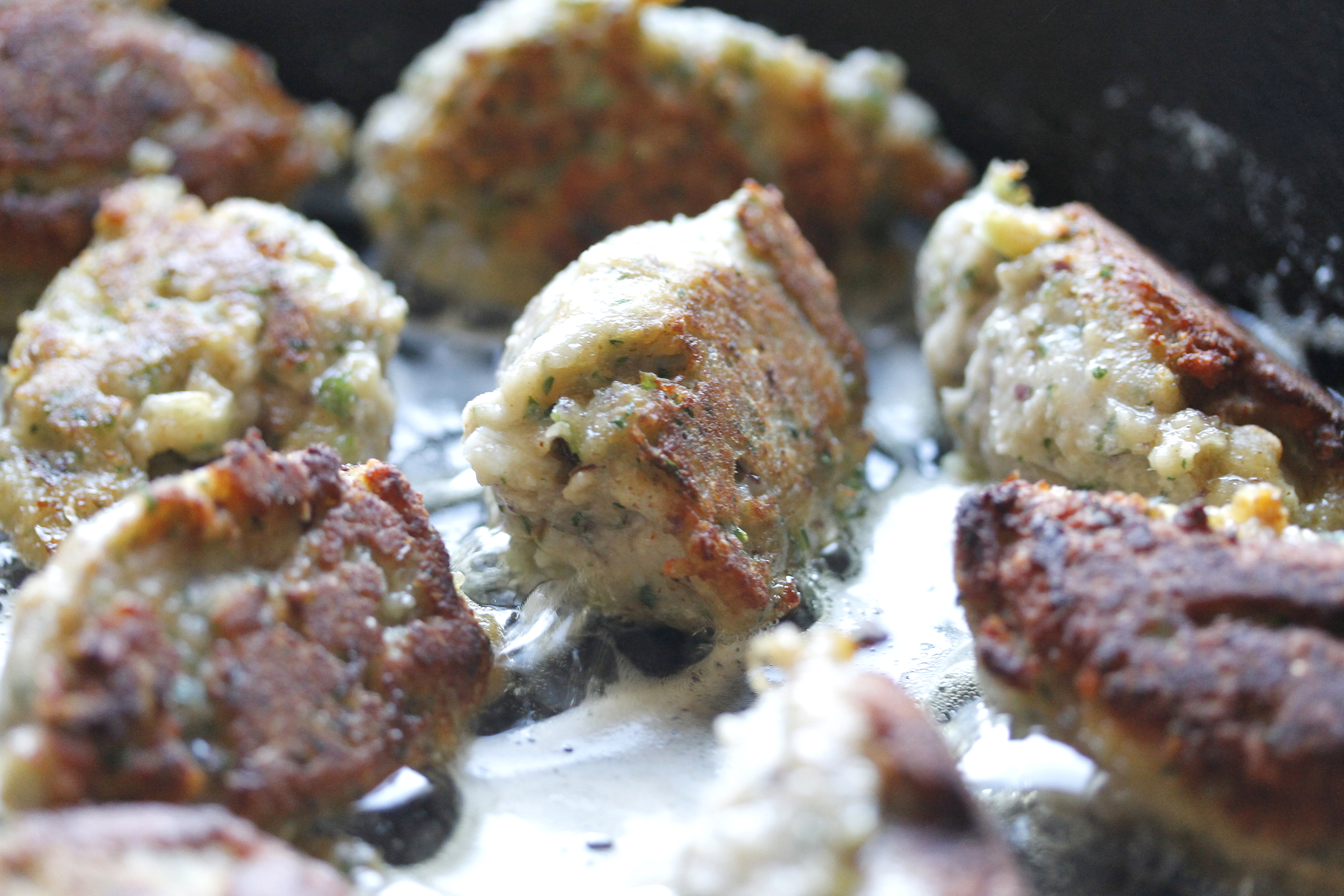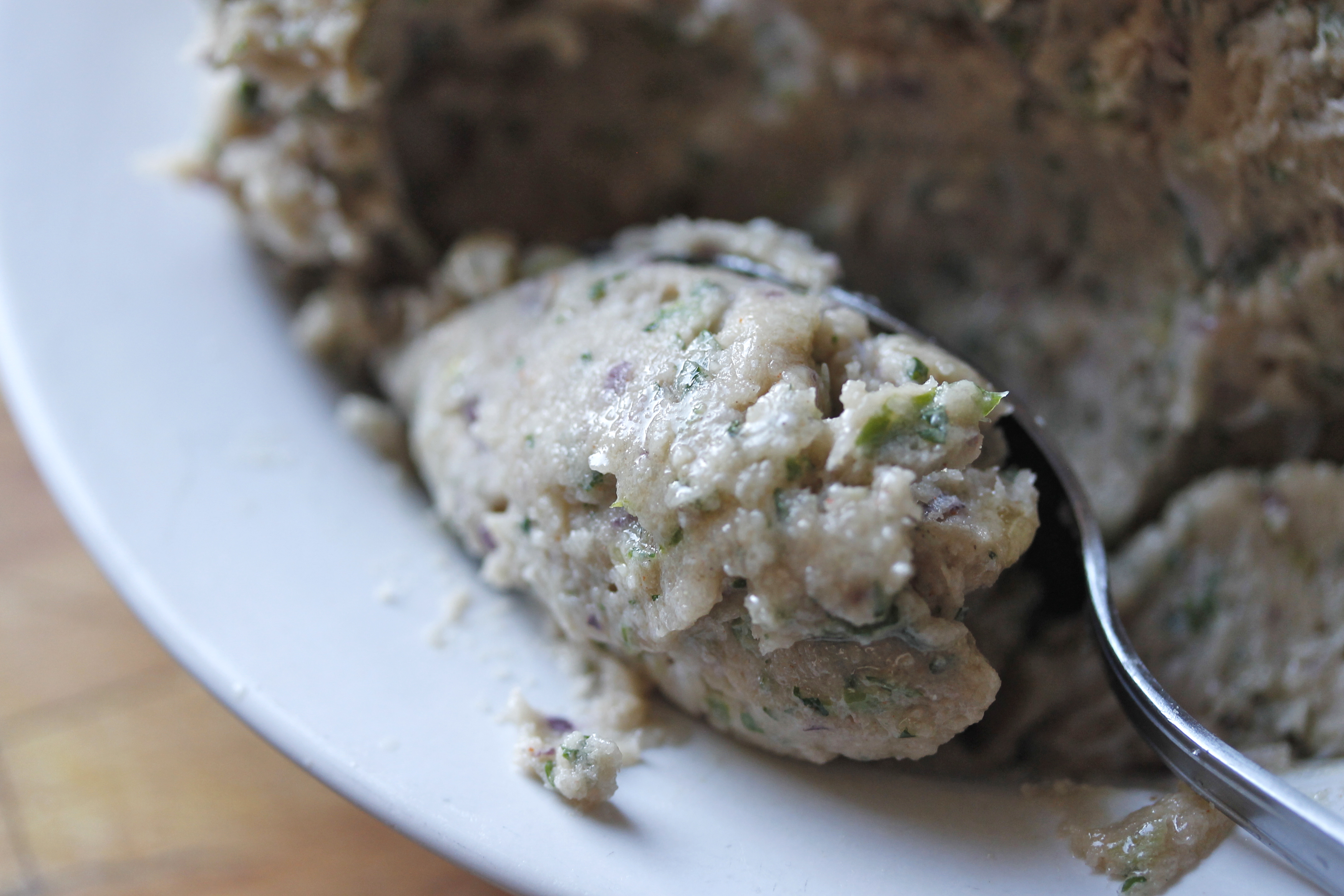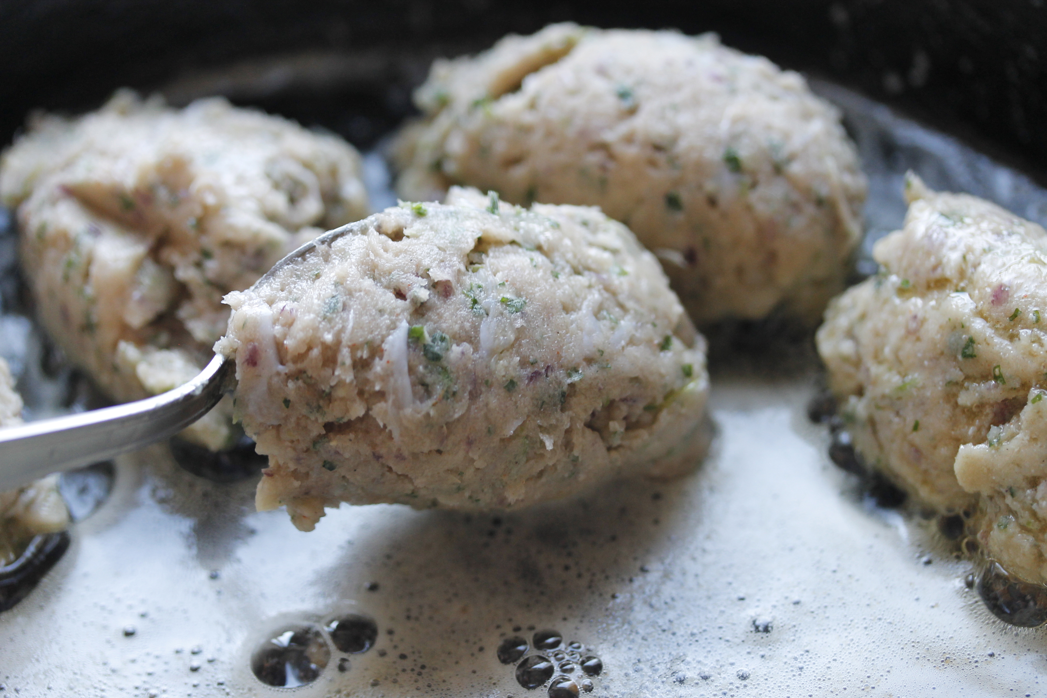 Ég setti farsið á disk og hitaði svo blöndu af olíu og smjöri á stórri pönnu, dýfði matskeið í feitina og notaði hana til að móta aflangar bollur úr farsinu.