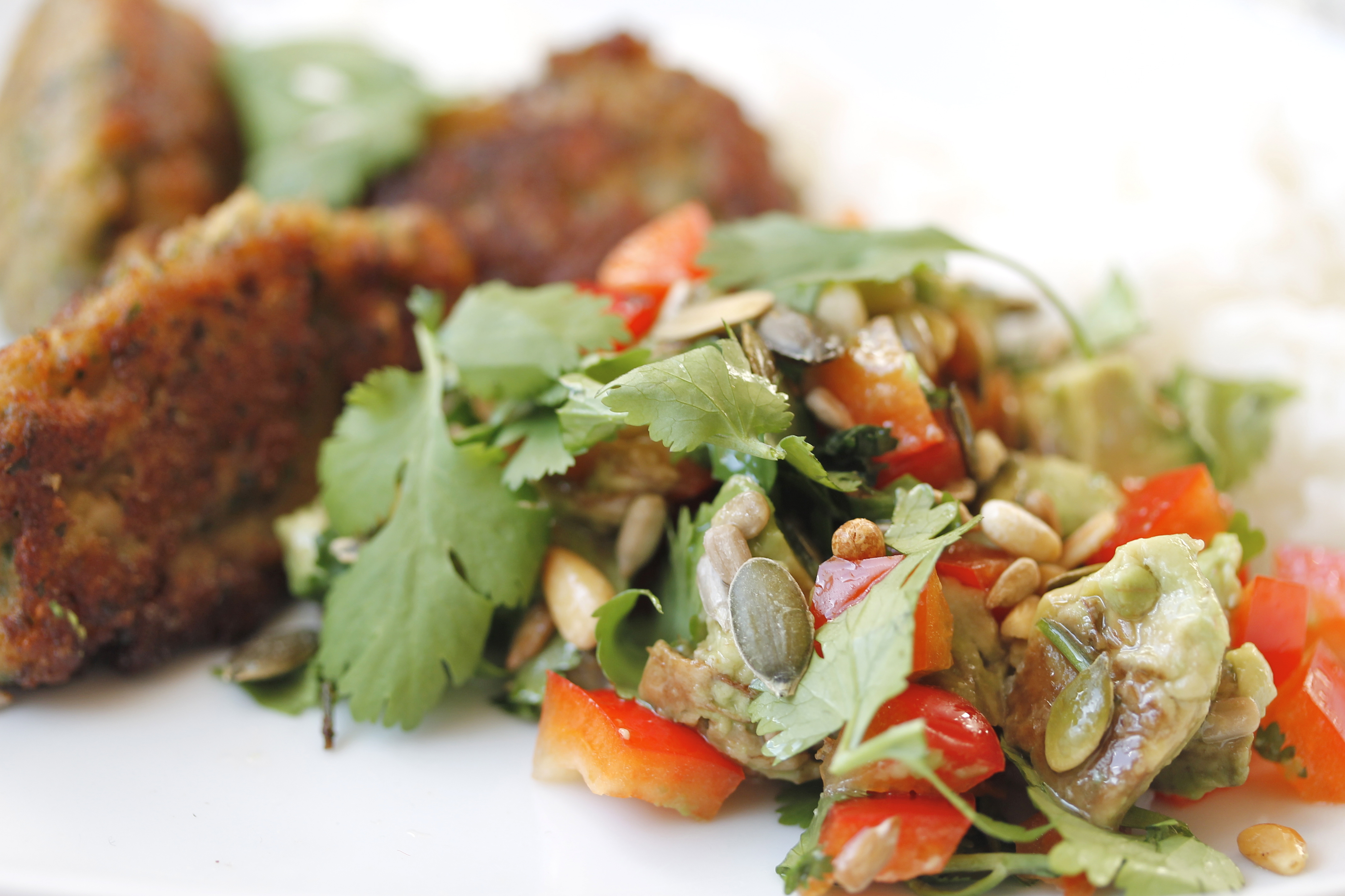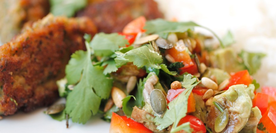 … og svo gerði ég salsa úr söxuðum vel þroskuðum tómötum, lungamjúkri lárperu, kóríanderlaufi, chili, ólífuolíu, límónusafa og pipar og salti – og bætti við 1-2 msk af fræblöndu (graskersfræ, furuhnetur, sólblómafræ).