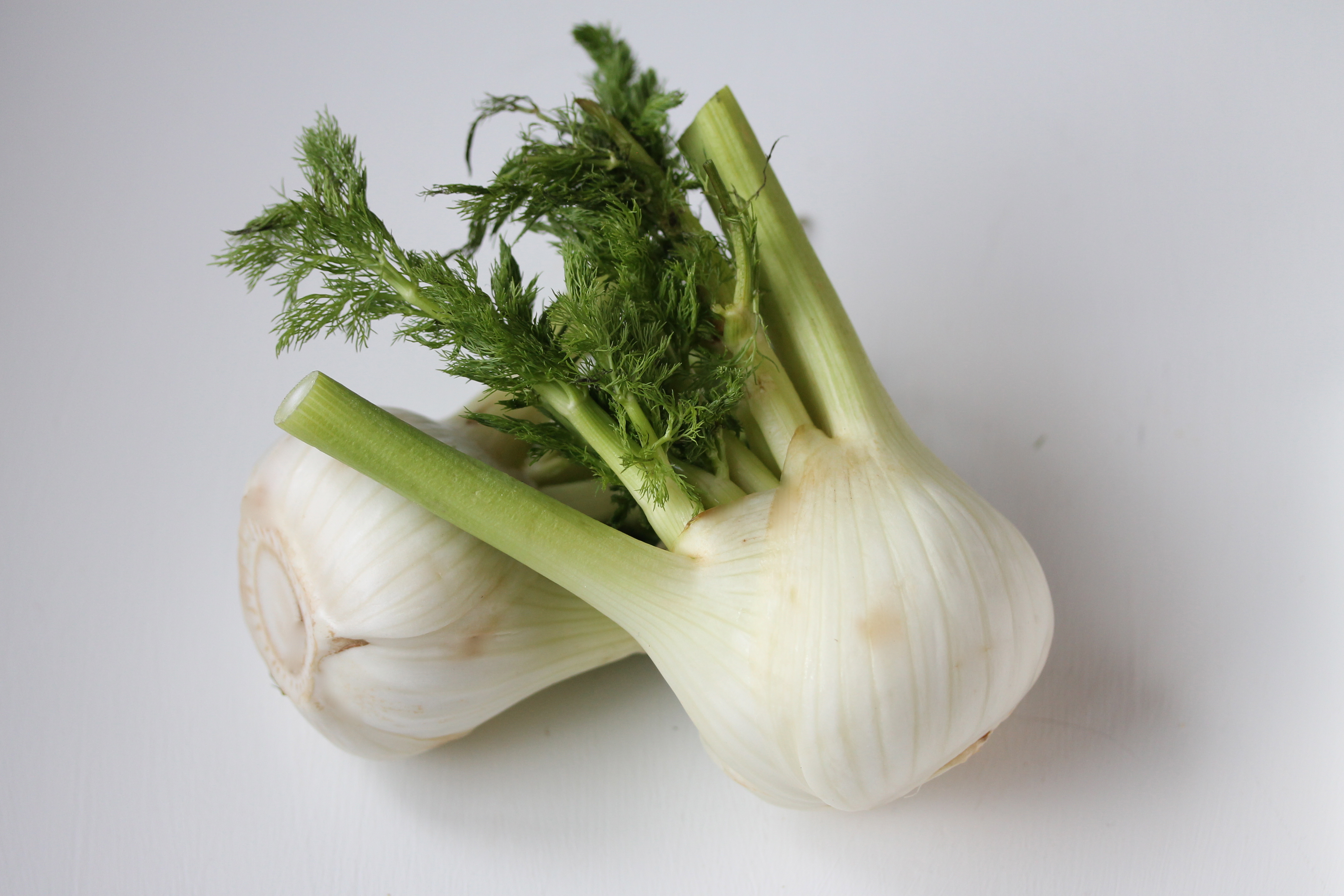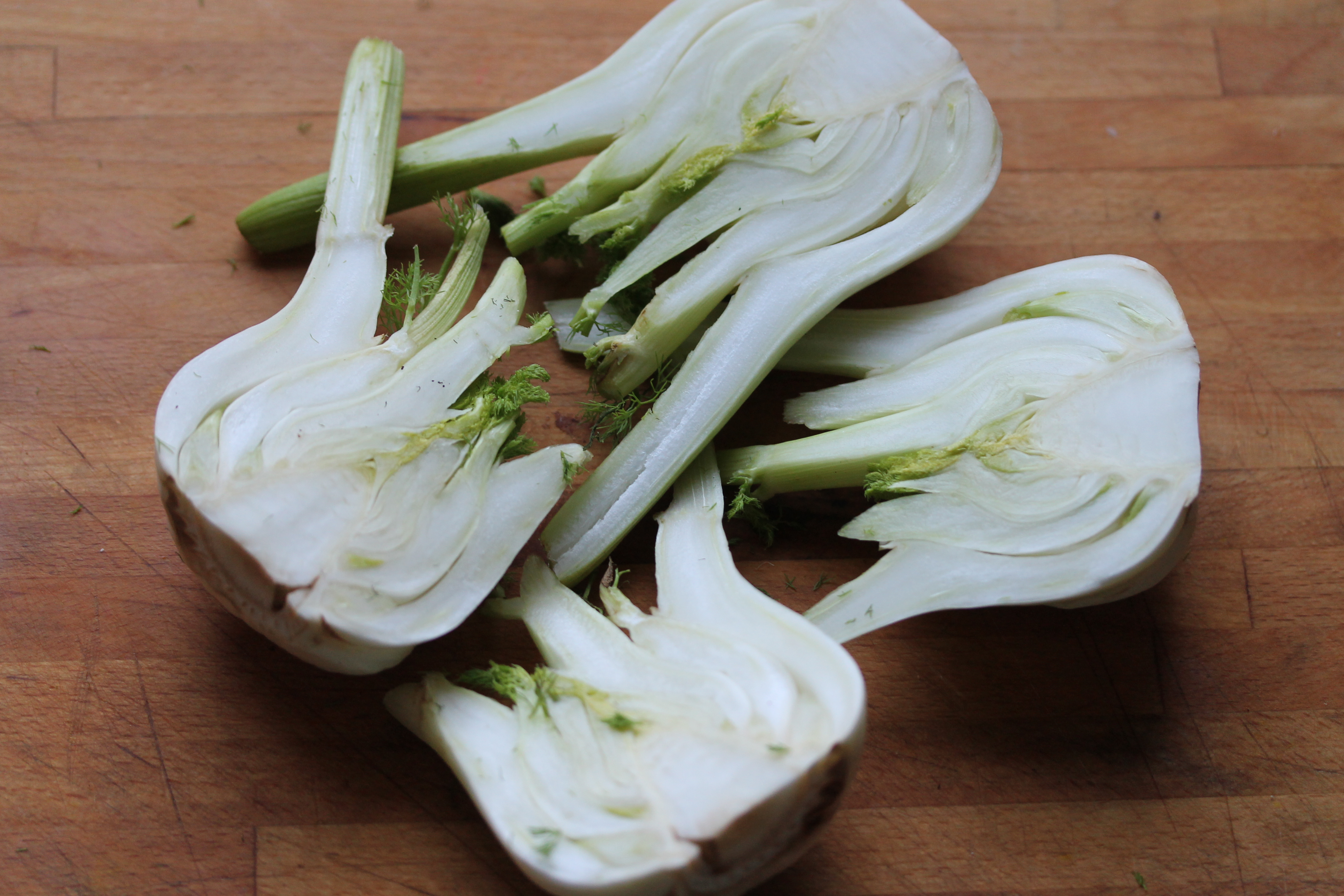 Ég var með tvær meðalstórar fennikur, um 200 g hvora. Byrjaði á að fjarlægja meirihluta laufanna (ef einhver eru) – það má geyma þau og nota til skreytingar ef vill. Ég skar líka örþunna sneið neðan af hverri fenniku en lét þó rótina halda sér til að halda fennikuhlutunum saman.