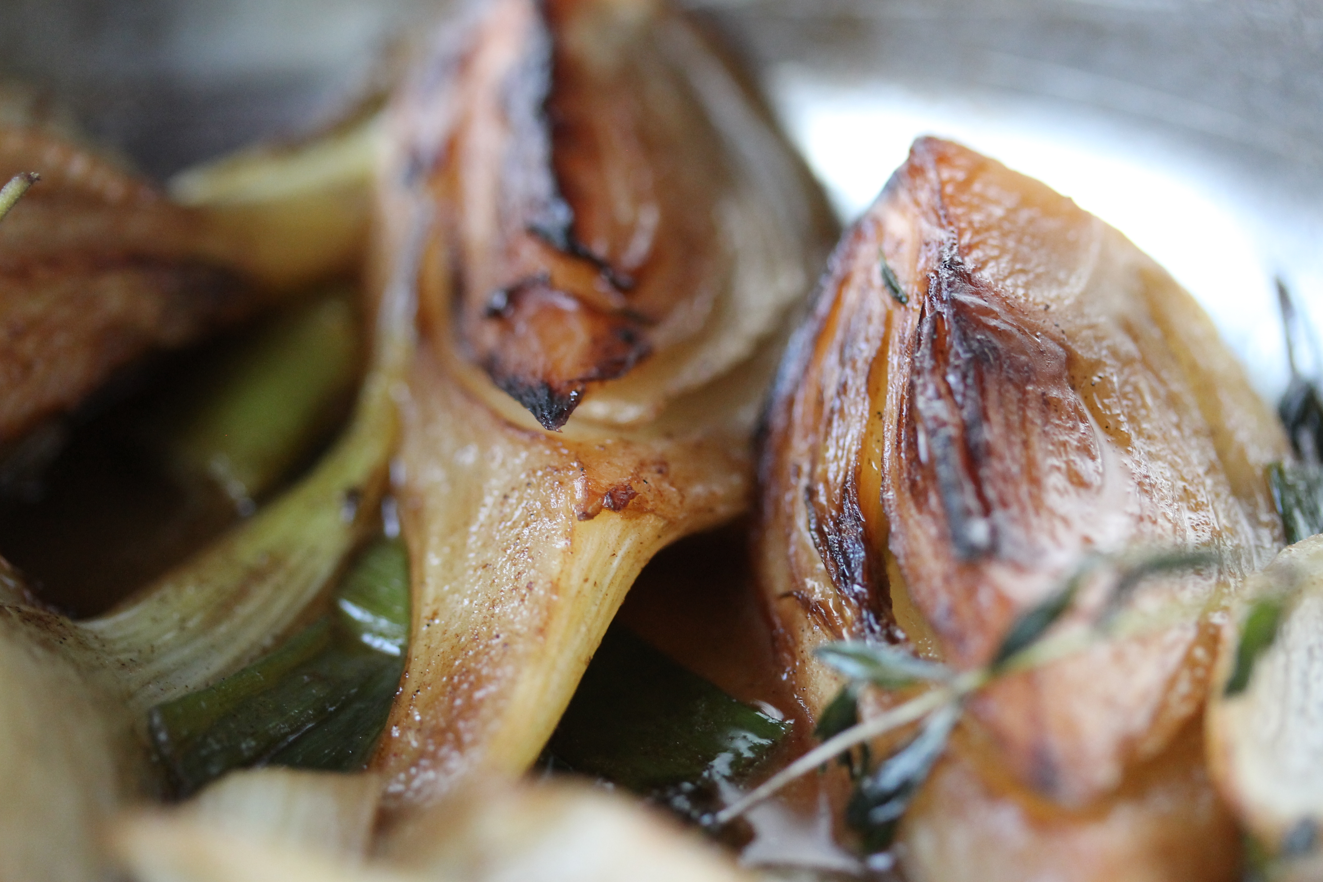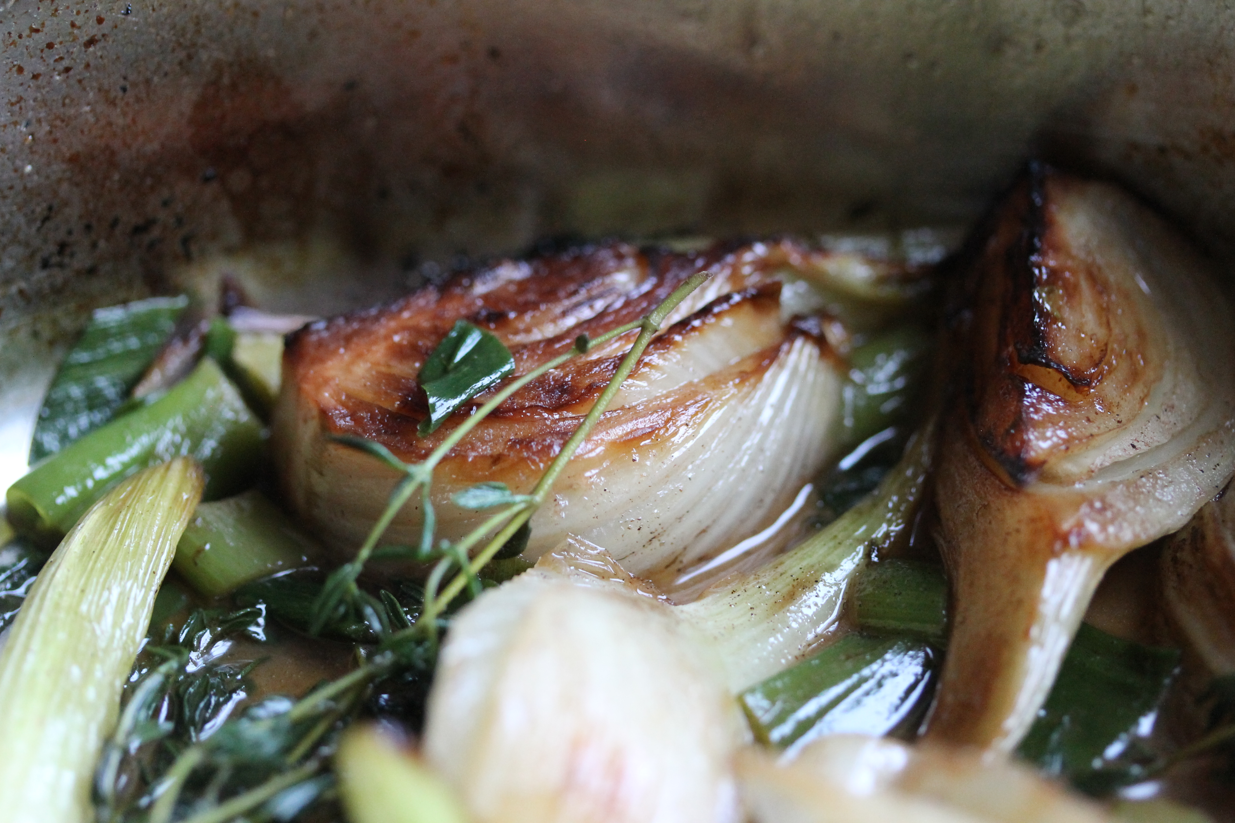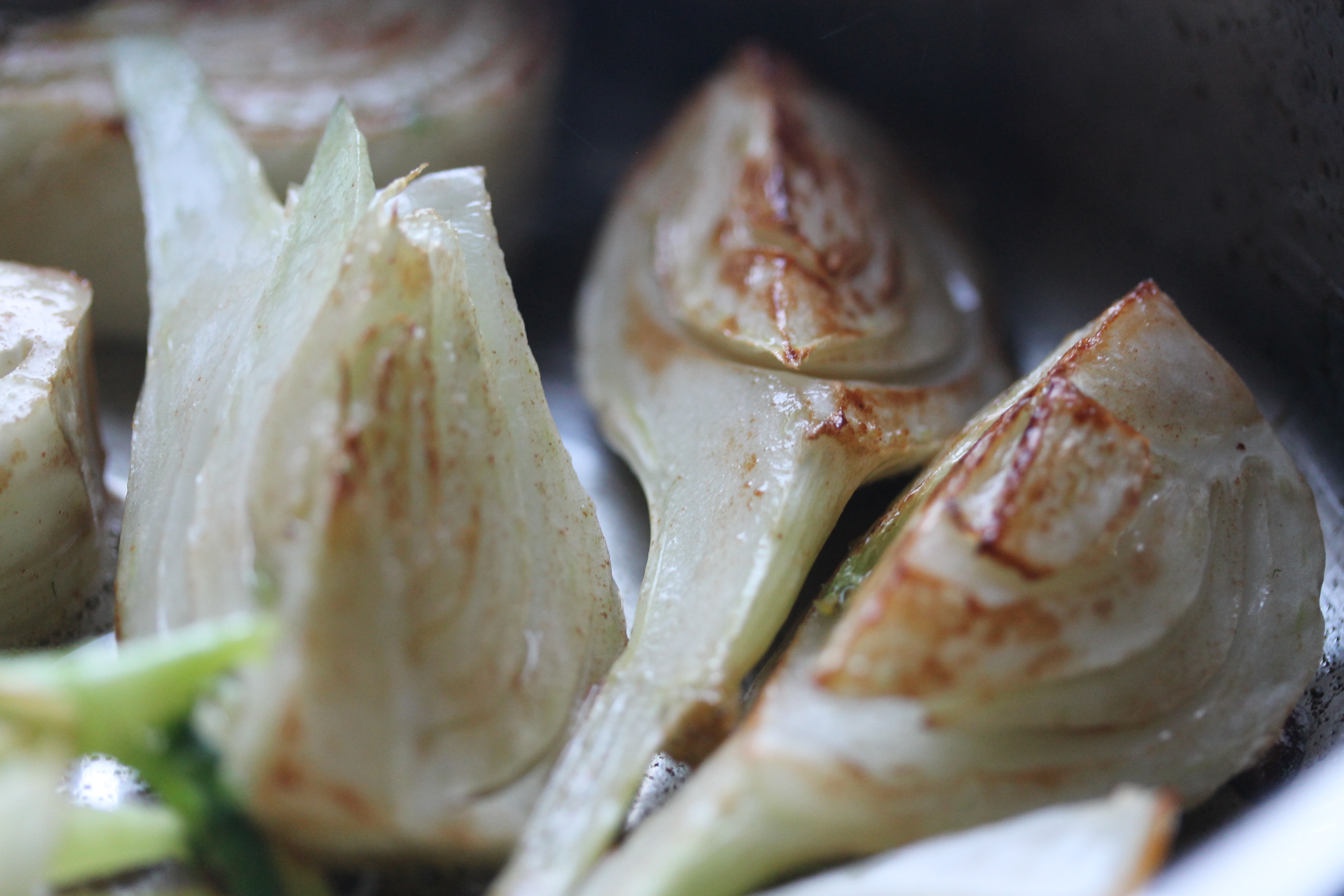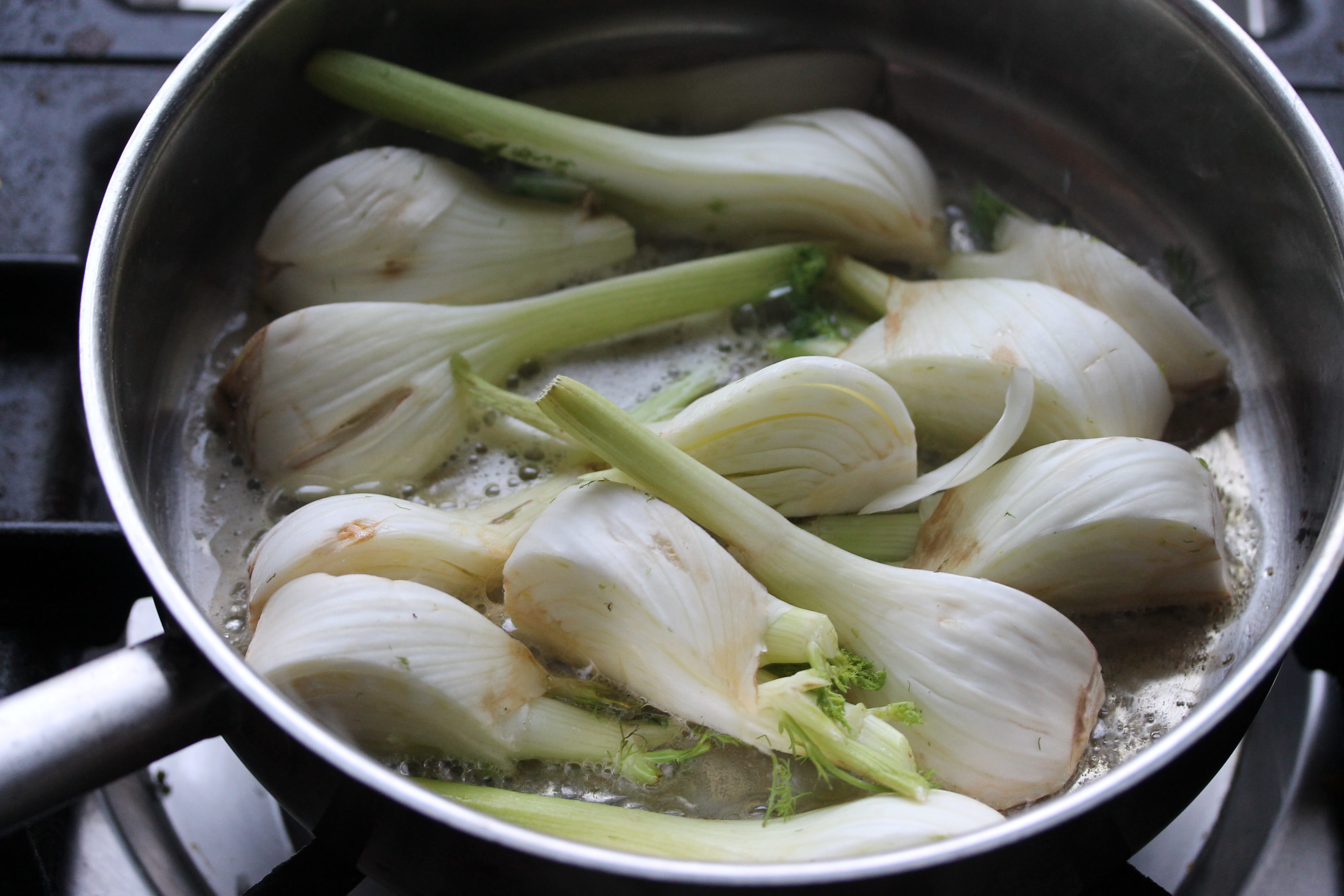 Ég hitaði 1 msk af smjöri og 1 msk af olíu á þykkbotna pönnu, raðaði fennikunum á hana og brúnaði þær við góðan hita í nokkrar mínútur.