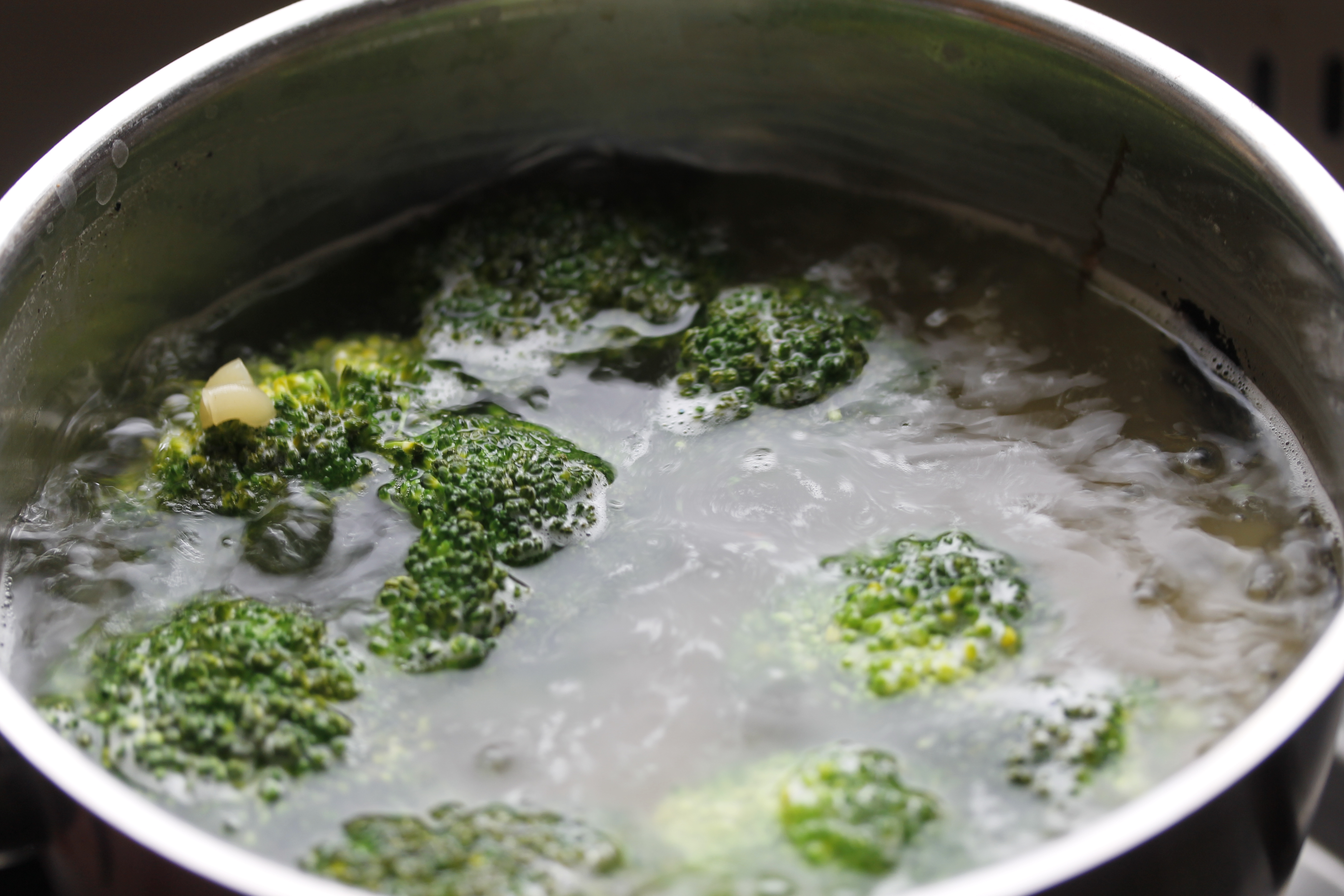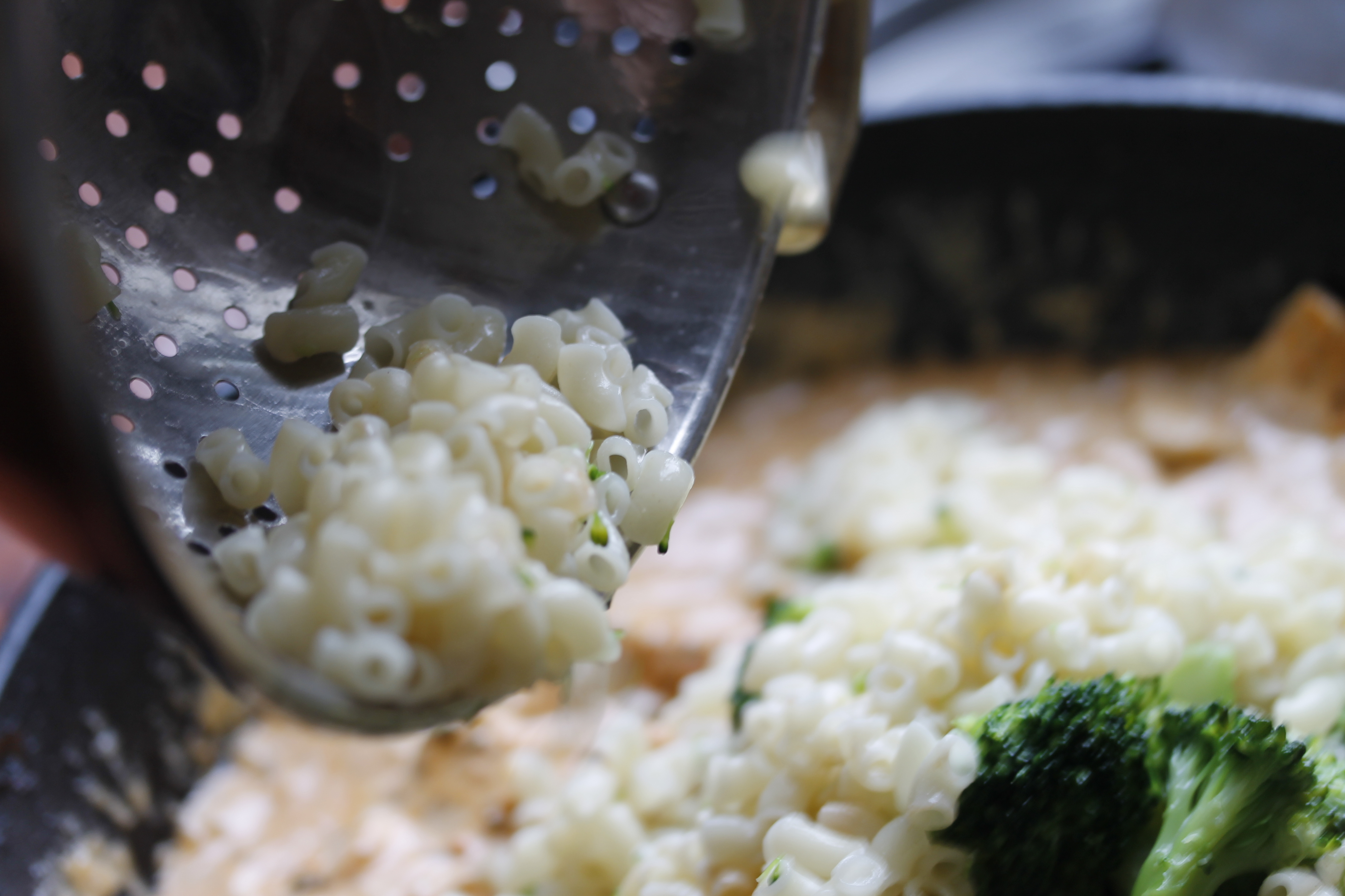 Ég byrjaði á að kveikja á ofninum og stilla hann á 220°C. Svo hitaði ég vatn að suðu í potti, saltaði það og setti 200 g af makkarónum út í og skar svona 150 g af spergilkáli niður í kvisti og setti þá í sama pott. Sauð þetta í 5-6 mínútur (makkarónurnar þurfa ekki að vera alveg meyrar, þær eiga eftir að bakast). Þá hellti ég hvorutveggja í sigti og lét renna af því.