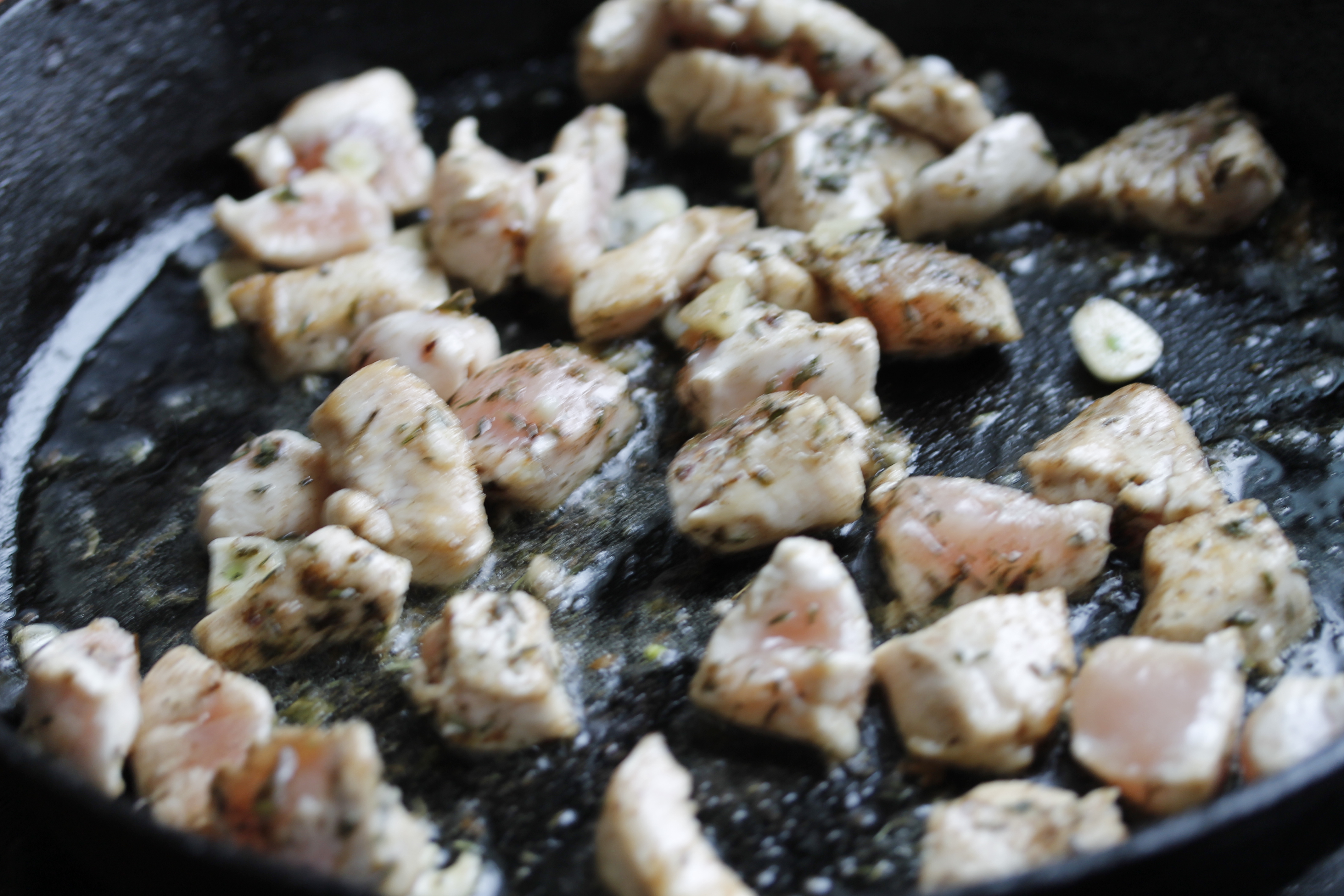Á meðan hitaði ég 1 msk af ólífuolíu á pönnu og skar kjúklingabringurnar tvær í munnbita. (Biðst afsökunar á að myndin er hreyfð, var eitthvað að flýta mér.) Ég setti bitana á pönnuna ásamt 2 söxuðum hvítlauksgeirum, kryddaði með pipar, salti, timjani og basilíku og steikti kjúklingabitana í svona 5 mínútur og hrærði oft á meðan til að þeir tækju lit á öllum hliðum.